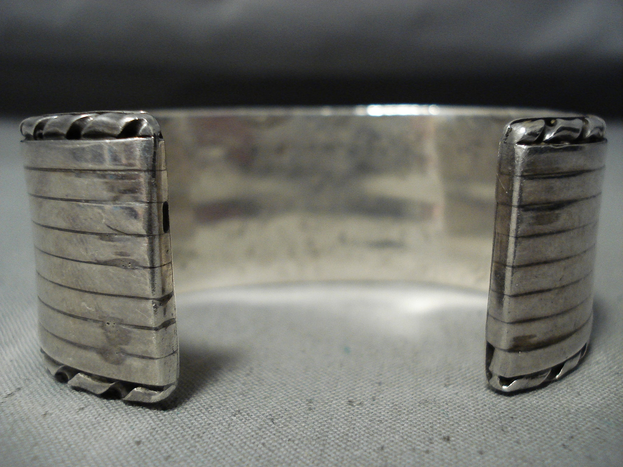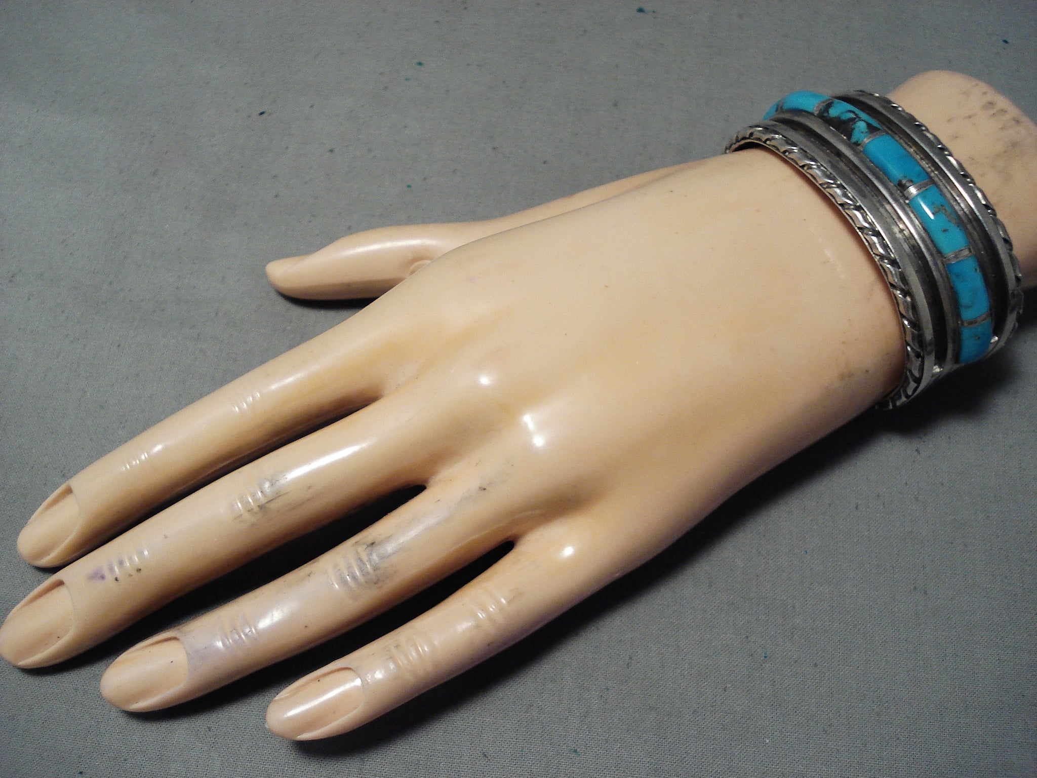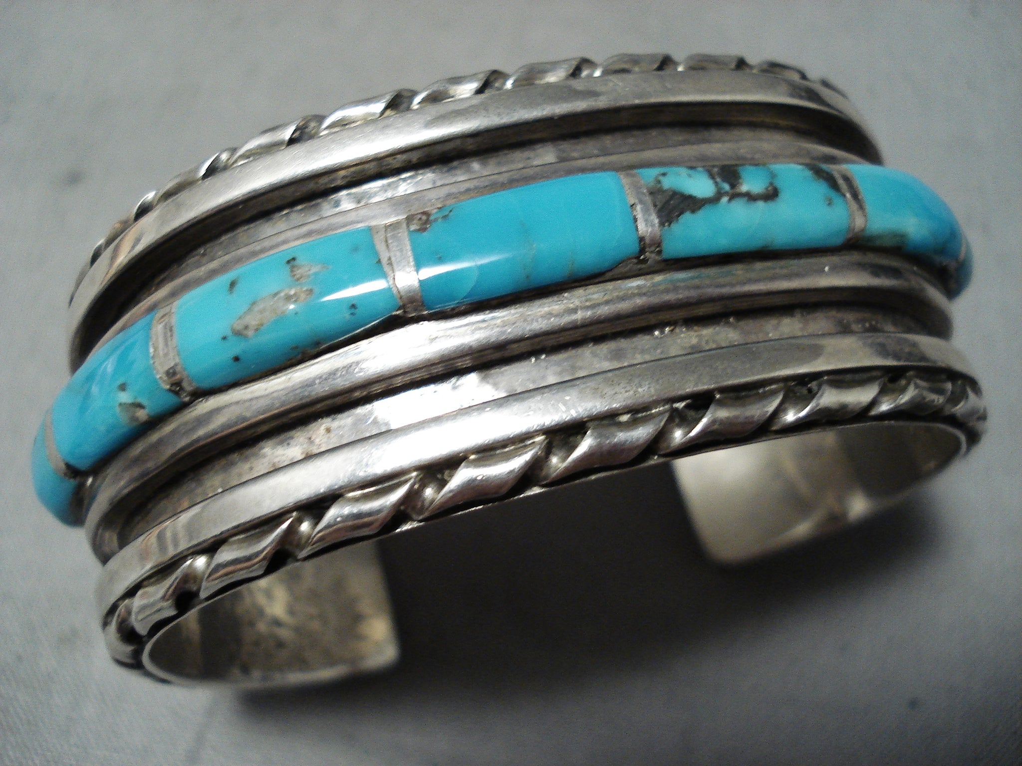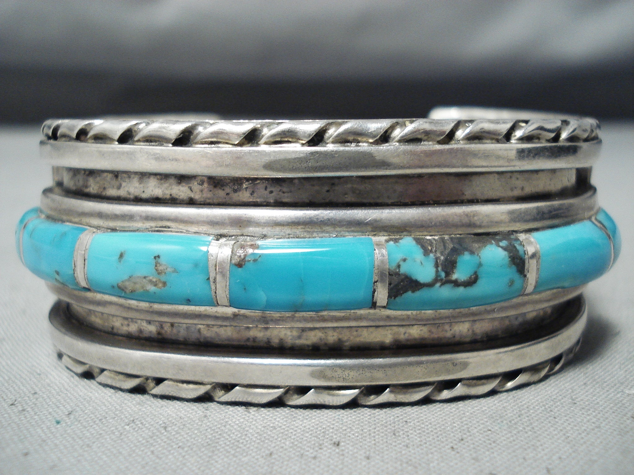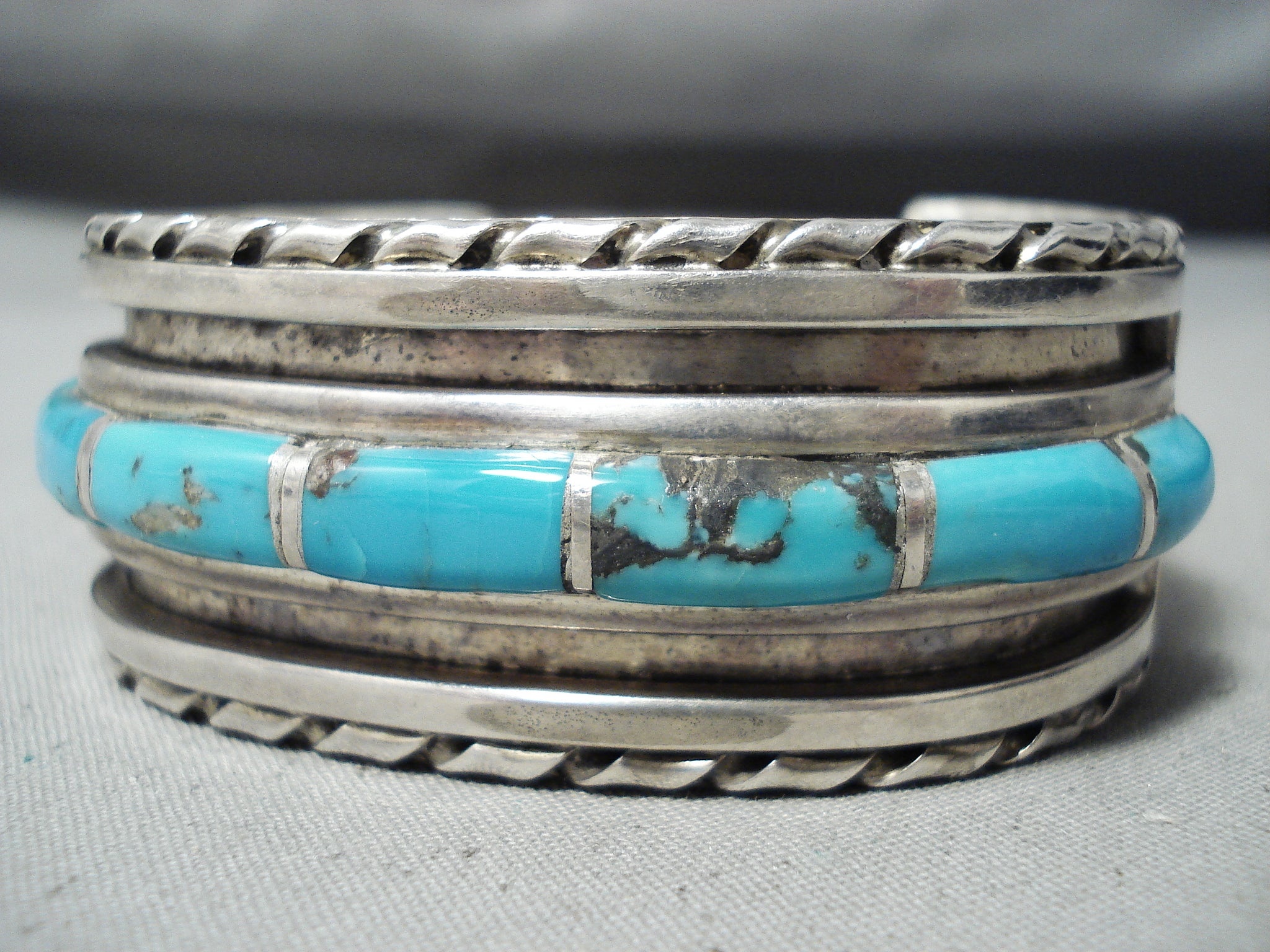 This is a striking vintage Navajo inlaid silver bracelet. This amazing bracelet contains stunning inlaid old Morenci turquoise stones that are rectangular shaped. The stones are inlaid into a very thick and sturdy silver cuff that contains bordering coiled patterns. The width of the bracelet measures around 1". Sterling silver. Cir. Mid century . The inside end to end measures around 5" with an additional 1-1/4" gap. Sturdy 90 grams.