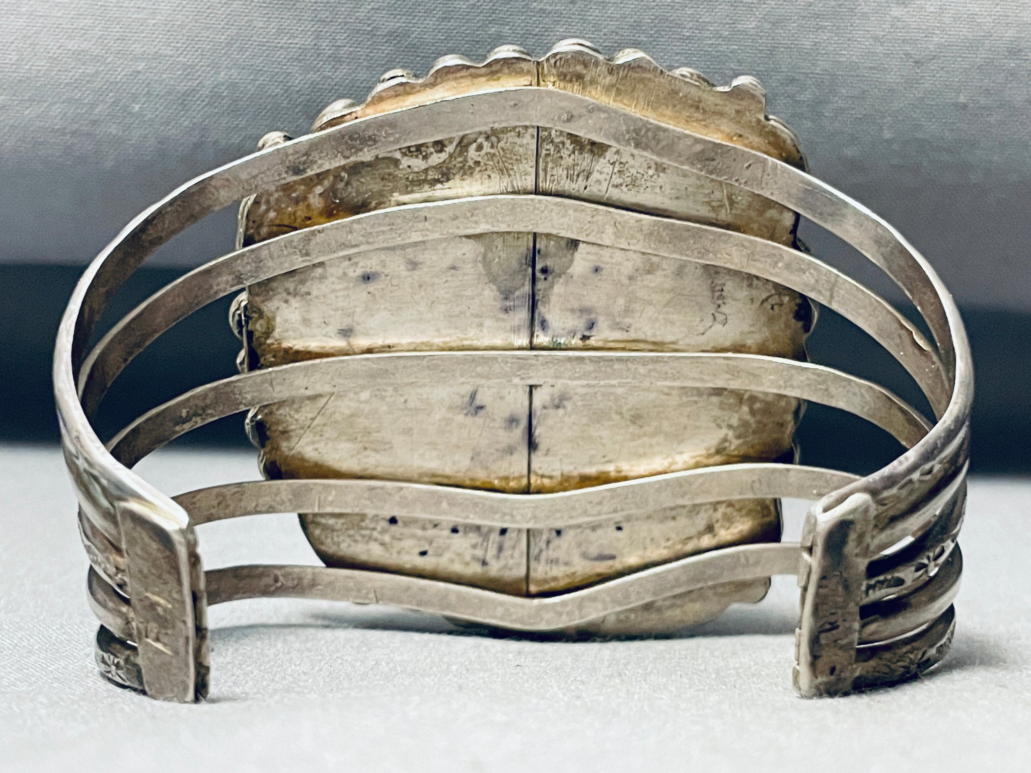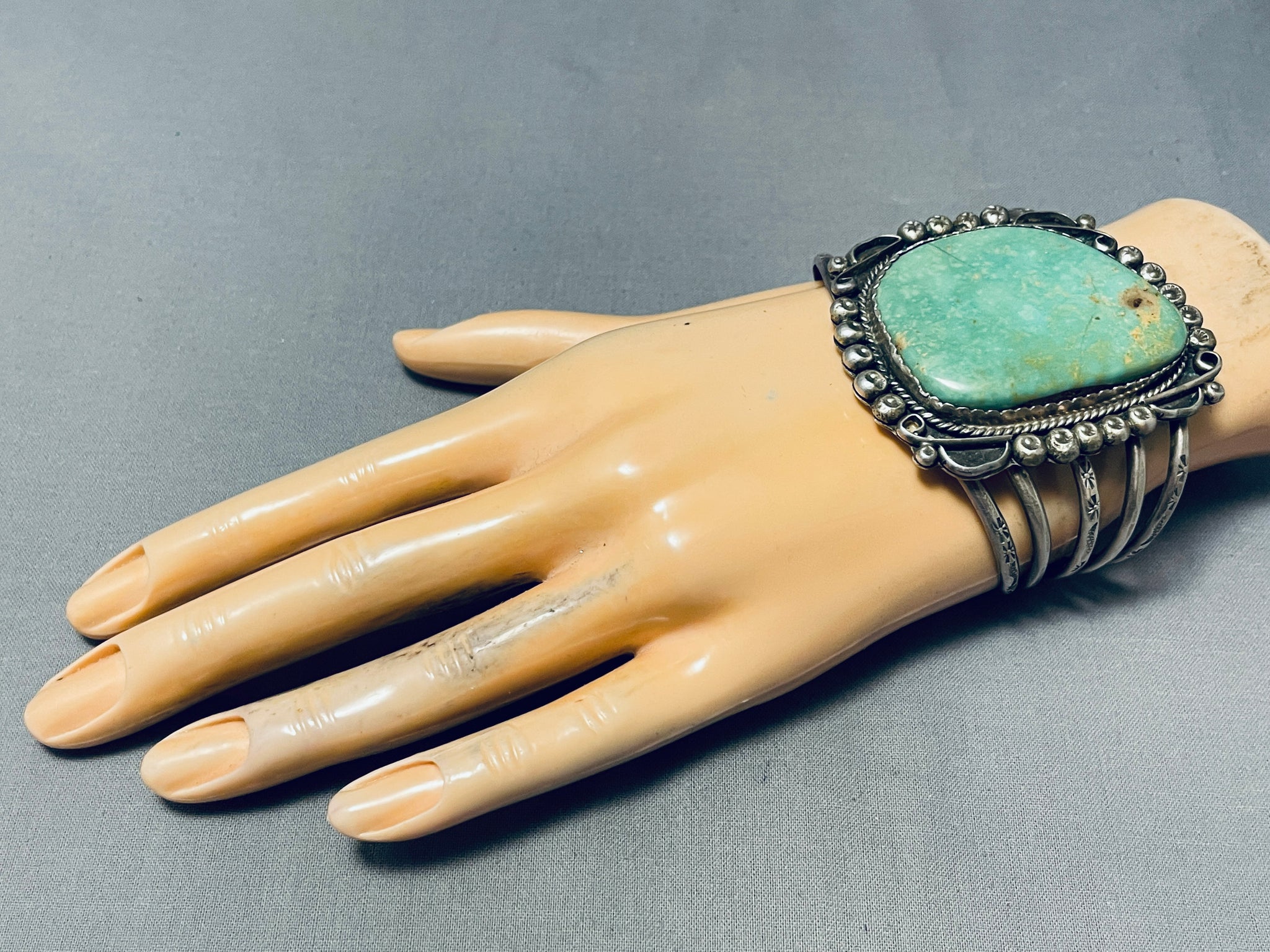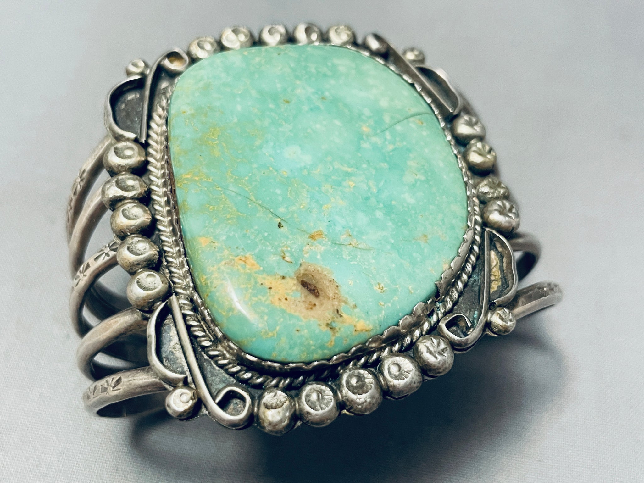 This is a tremendous vintage Navajo large single stone silver bracelet. This outstanding bracelet contains a wonderful center large chunky Royston turquoise stone. Surrounding the stone are impeccable silver works that include raindrops, wave works, stems and ropes. I absolutely love the intricacy of the silver detailing. This bracelet contains a phenomenal five silver shank cuff with every other shank consisting of marvelous stamp works. Such a beautiful bracelet. The center stone measures around 1-3/4" x 1-1/2". The width of the bracelet measures around 2-3/8". Signed by Navajo artist, RB. Sterling silver, marked. Cir. Mid century . The inside end to end measures around 5-1/4" with an additional 1-1/2" gap. Sturdy 77 grams.
