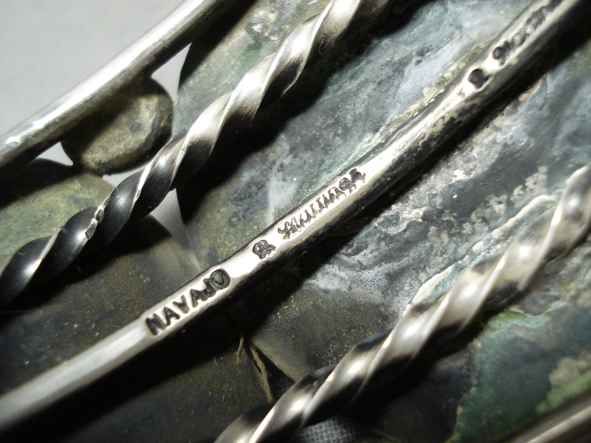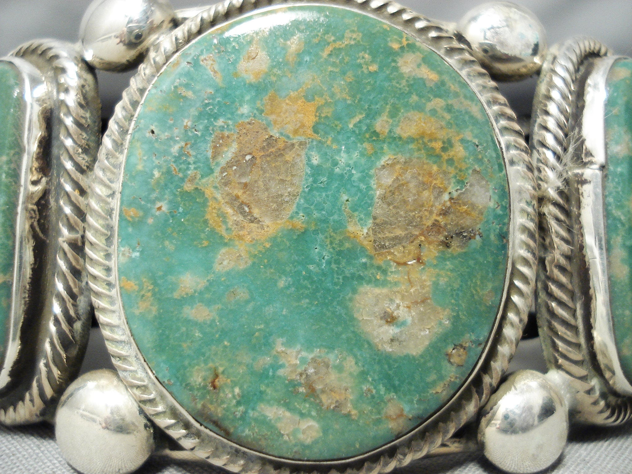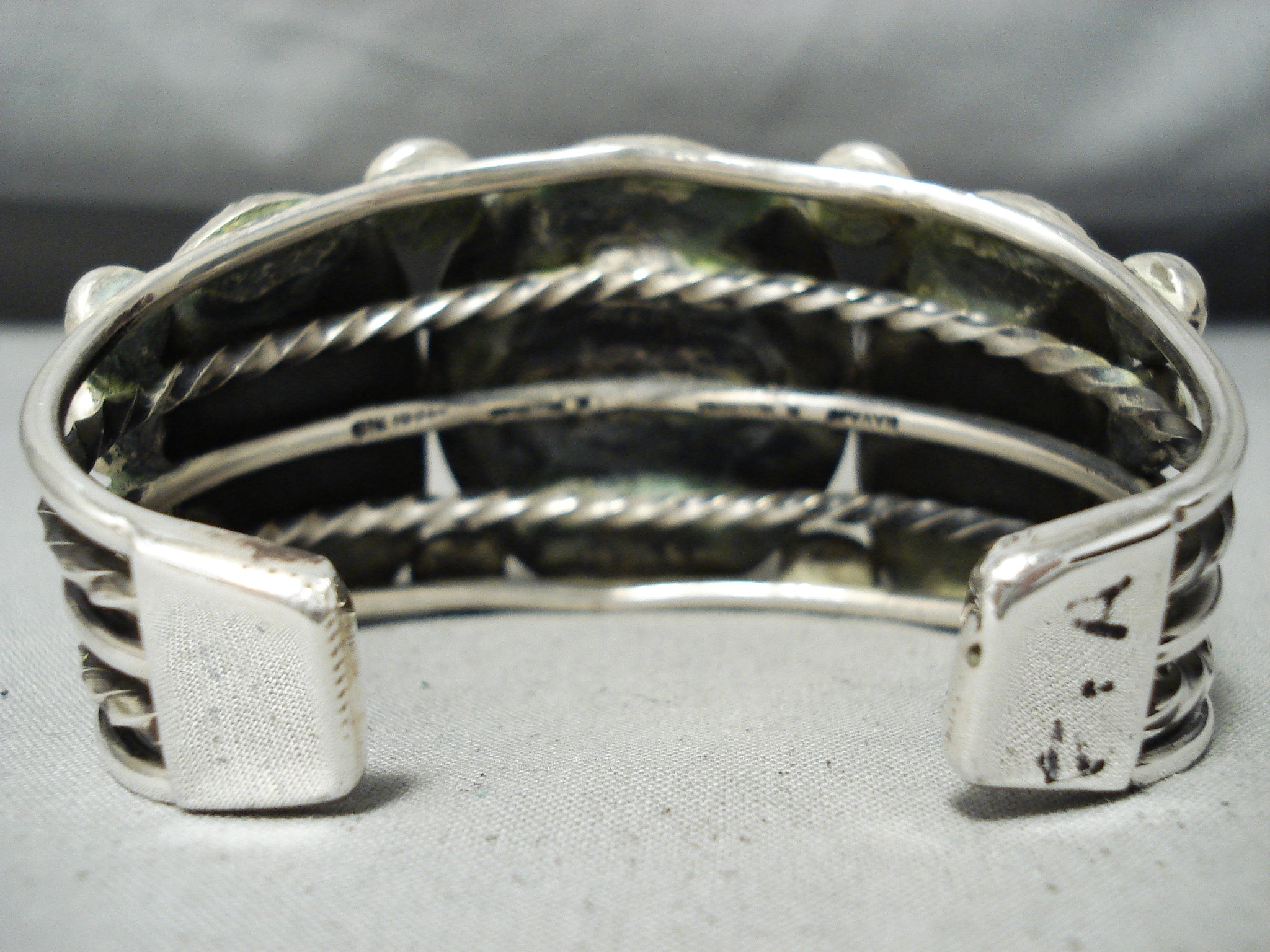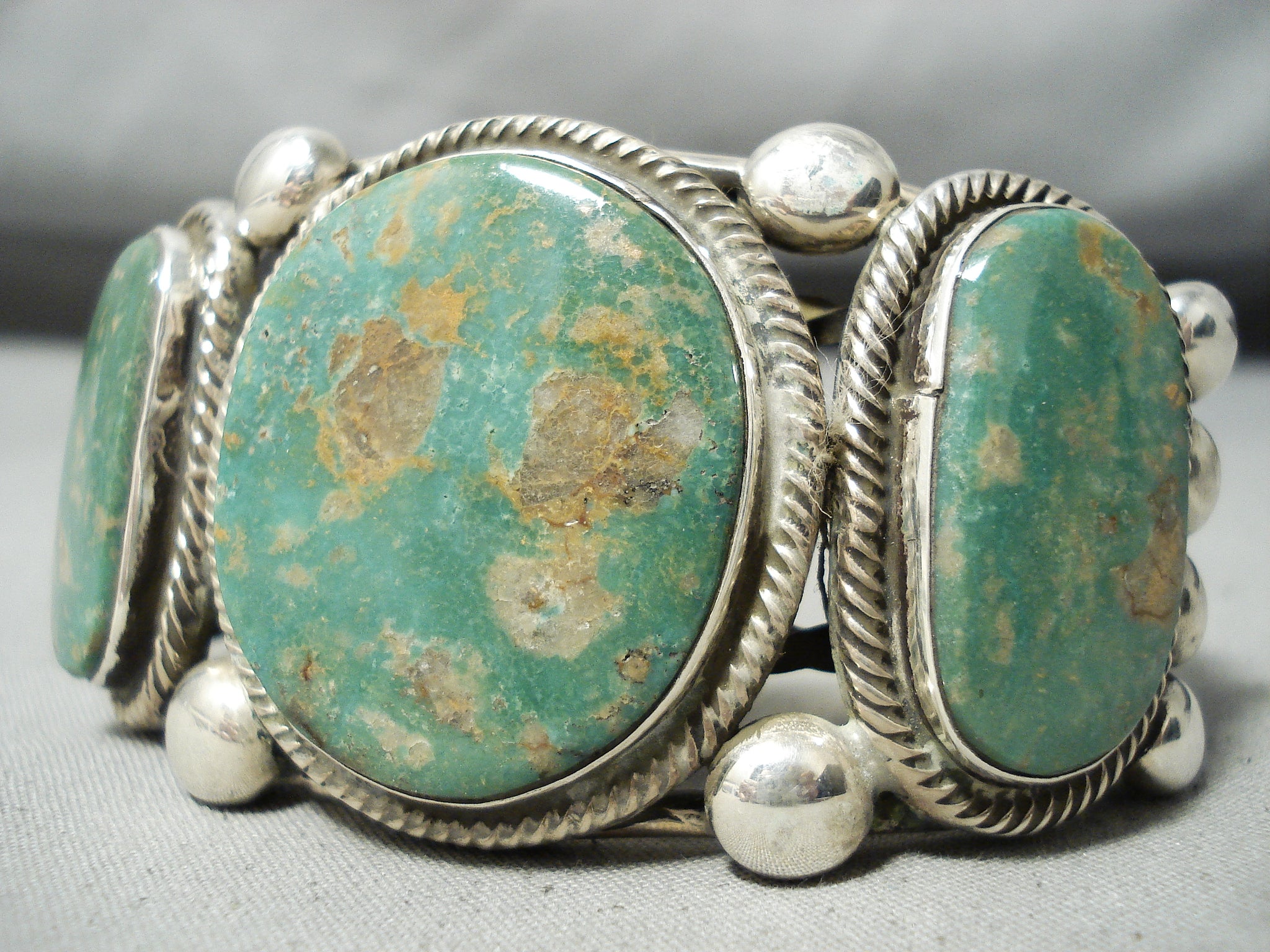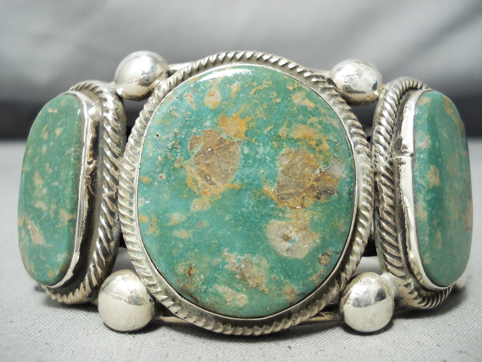 This is a tremendous vintage Navajo three stone silver bracelet. This bracelet contains three beautiful Royston turquoise stones. Surrounding each stone are amazing silver coiled patterns with accenting very large round silver beads. This bracelet contains a phenomenal huge, heavy and thick five silver shank cuff with two of the shanks being coiled. The center stone measures around 1-1/4" x 1-1/8". The width of the bracelet measures around 1-5/8". Signed by Navajo artist, Rick Martinez . Sterling silver, marked. Cir. 1970's+. The inside end to end measures around 6" with an additional 1-1/4" gap. Sturdy 115 grams.