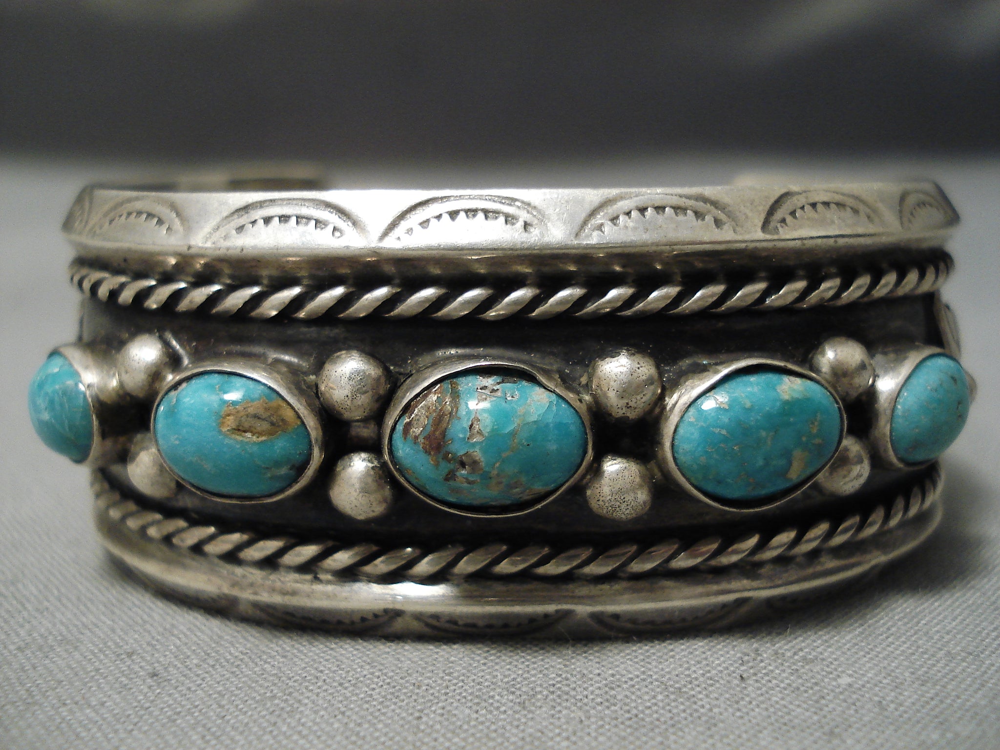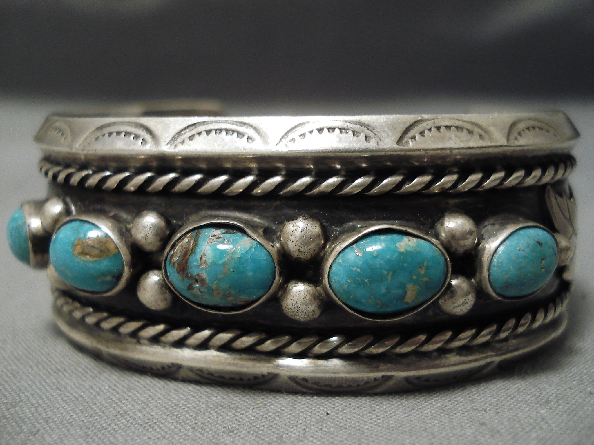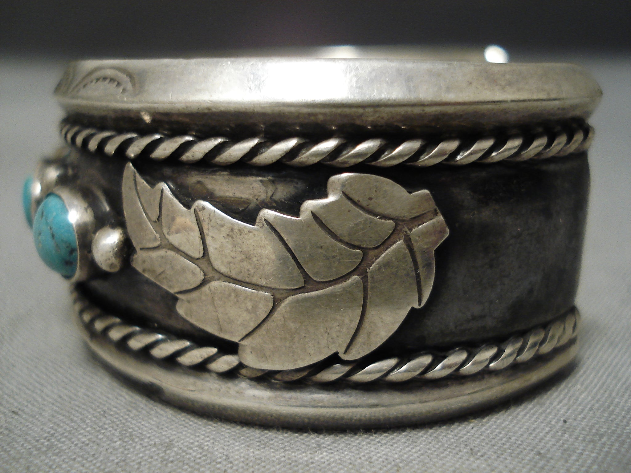 Heavy!! Vintage Native American Navajo Sterling Silver Royston Turquoise Leaf Bracelet