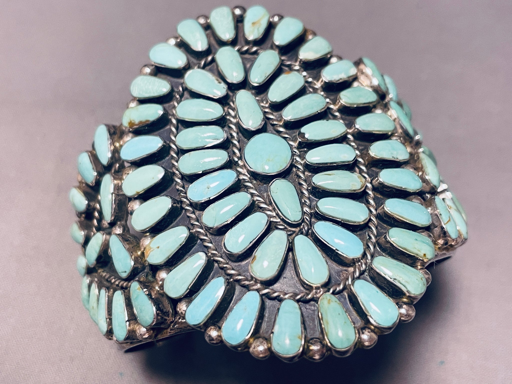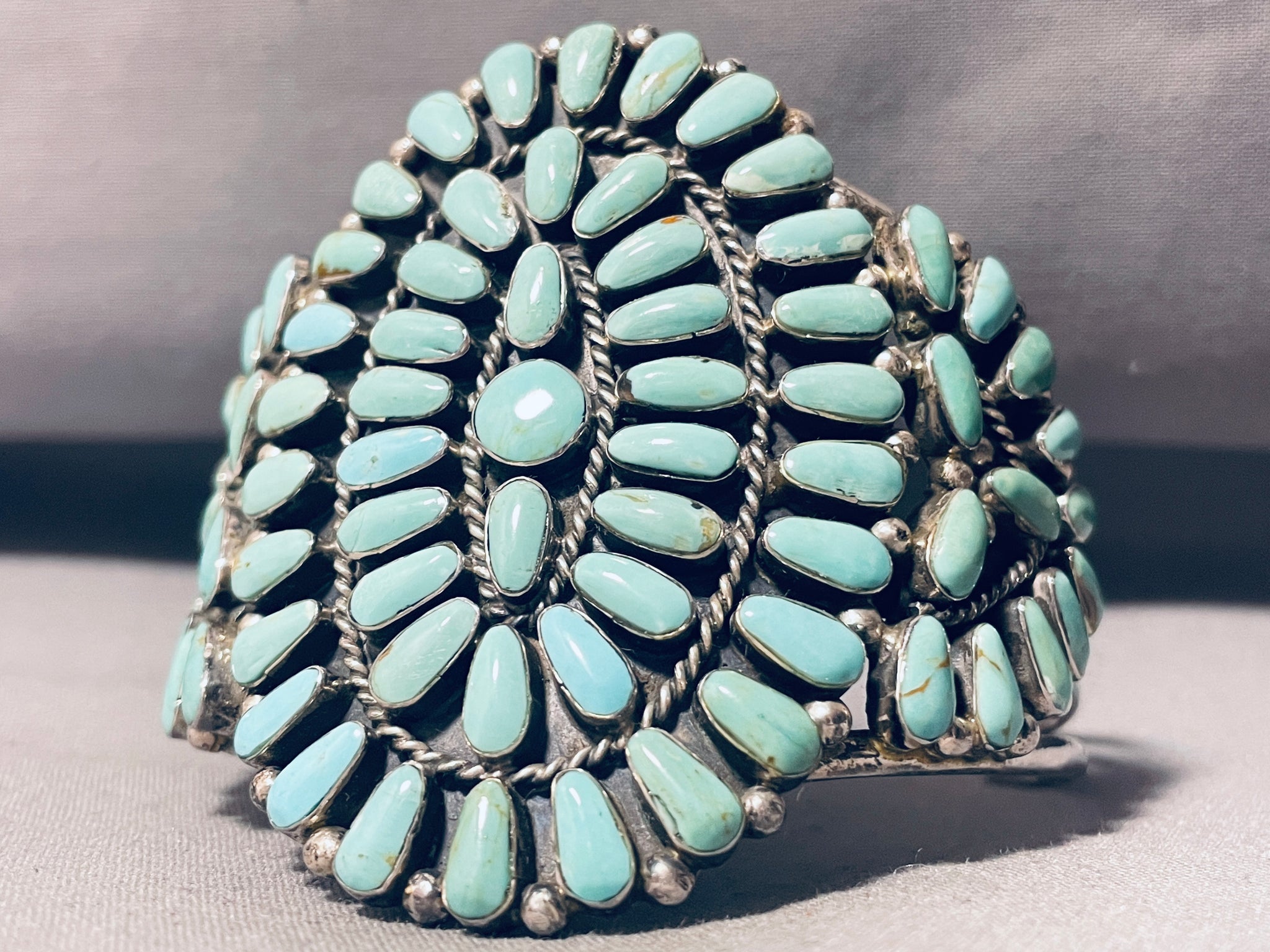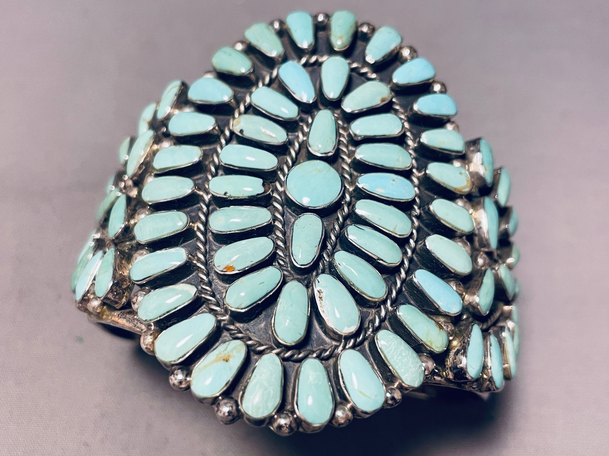 This is a magnificent vintage Navajo turquoise cluster silver bracelet. This incredible bracelet contains a beautiful plethora of hand cut teardrop and round shaped Royston turquoise stones. Surrounding the stones are fascinating silver works that include ropes and raindrops. The bracelet contains a phenomenal sturdy and thick quadruple silver shank cuff that graduates in width towards the center. The height at the center of the bracelet measures around 2-3/4" while the width at the center of the four silver shanks measures around 2-1/8". The center stone measures around 1/4" x 1/4". Sterling silver, marked. Cir. Mid century . The inside end to end measures around 6-1/4" with an additional 1-3/4" gap. Sturdy 86 grams.