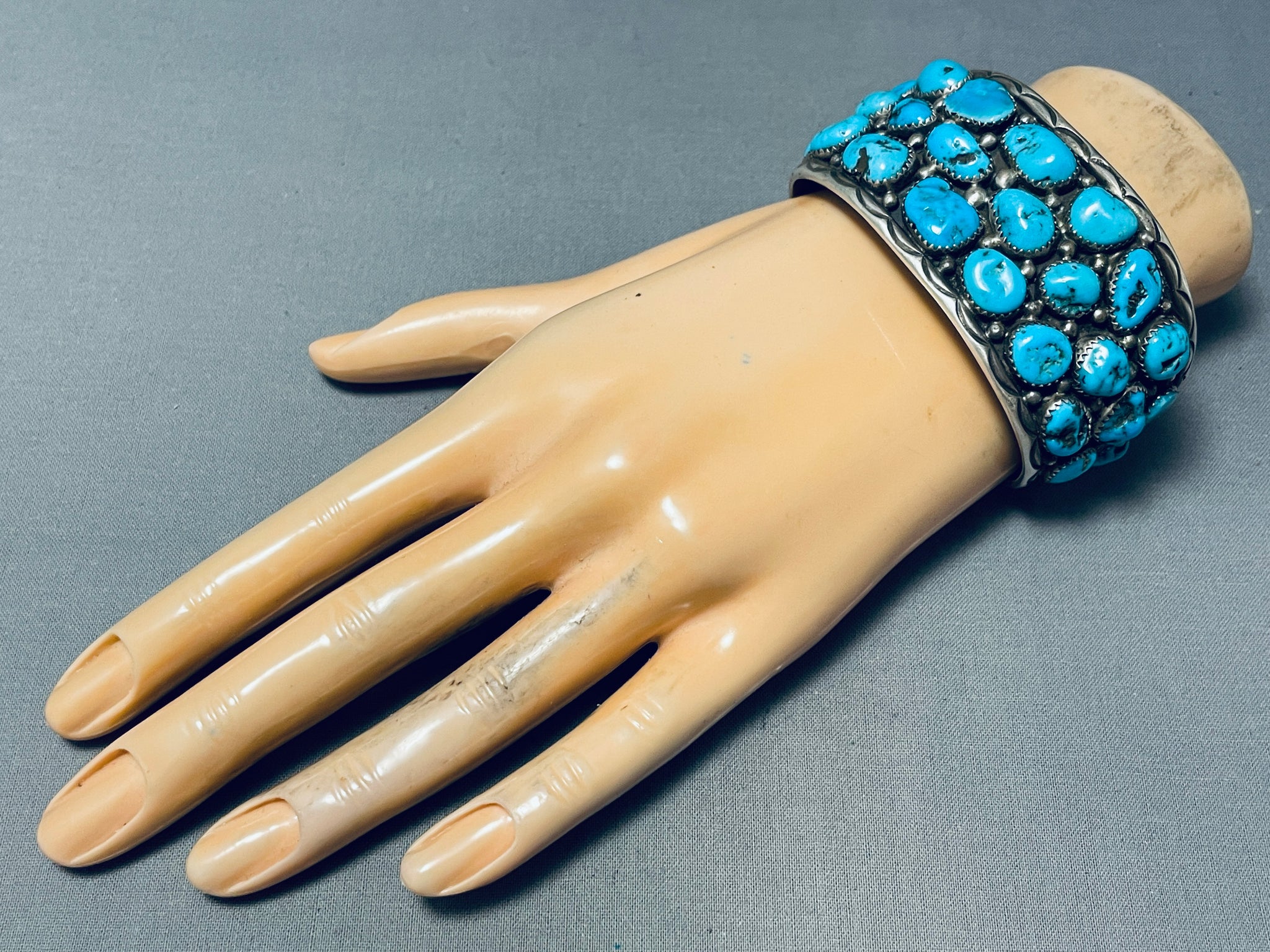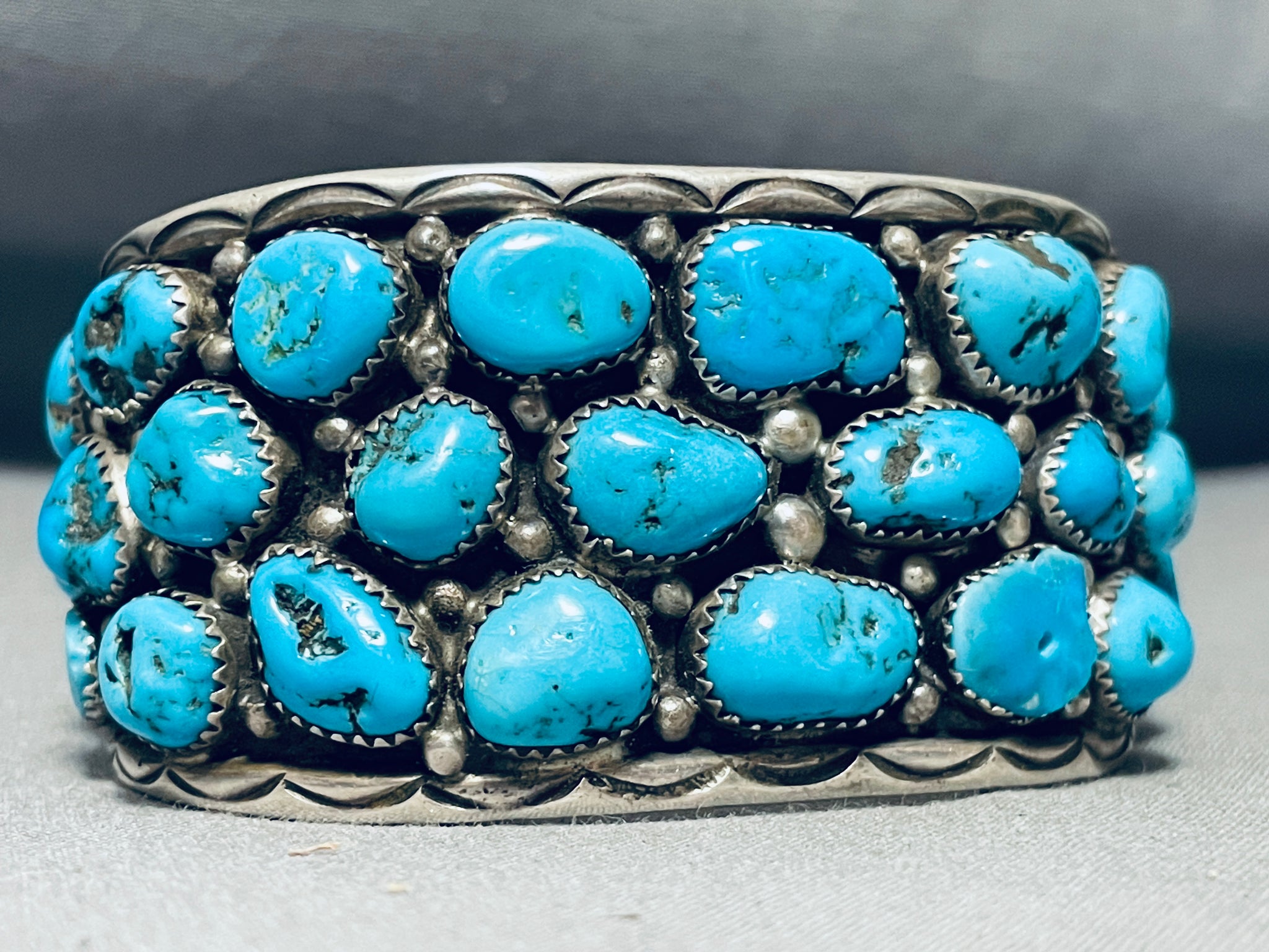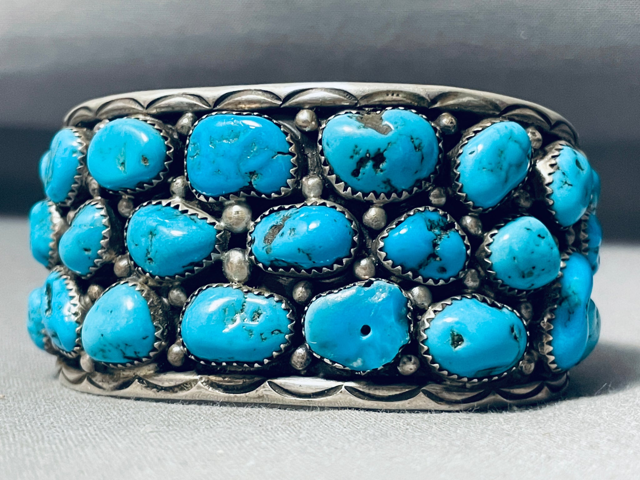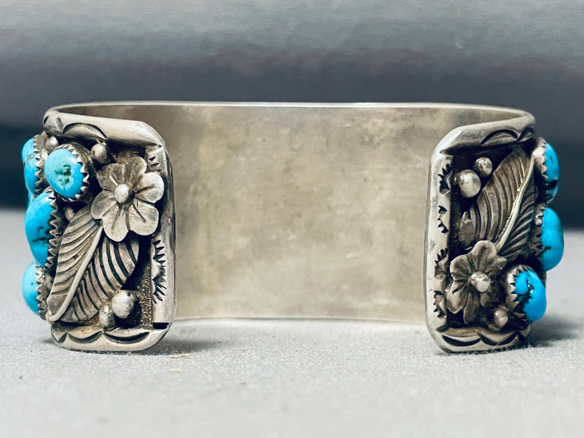 This is a magnificent vintage Navajo large wide cuff silver bracelet. This impeccable bracelet contains a beautiful plethora of hand cut large chunky Kingman turquoise stones. Situated throughout the stones are phenomenal silver raindrops that graduate in size towards the center. Resting at the ends are superior silver works that include leaves and flowers. Bordering the edges of the thick and wide silver cuff are outstanding silver sun and wave works. The stones measure around 1/2" x 3/8". The width of the bracelet measures around 1-3/8". Signed by Navajo artist, HL. Sterling silver, marked. Cir. 1970's+. The inside end to end measures around 5-3/4" with an additional 1-1/4" gap. Sturdy 70 grams.