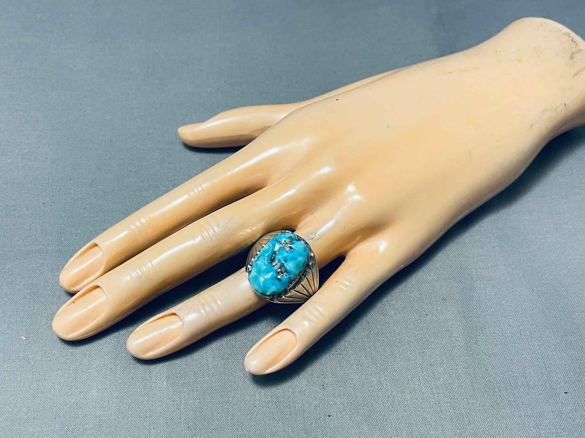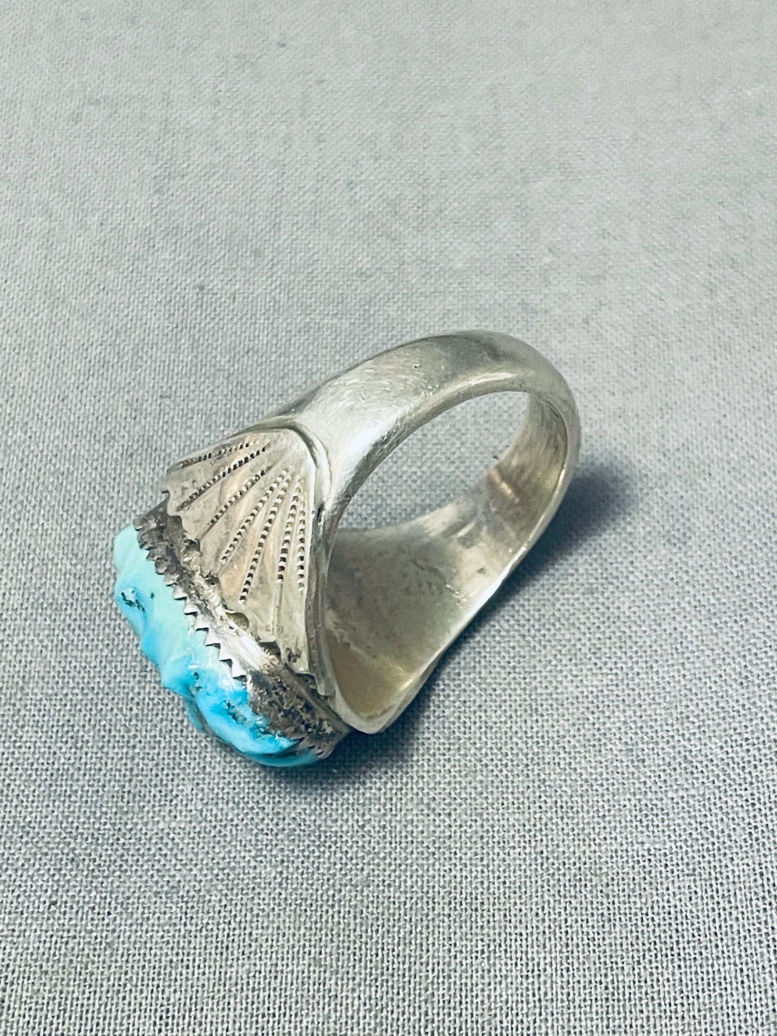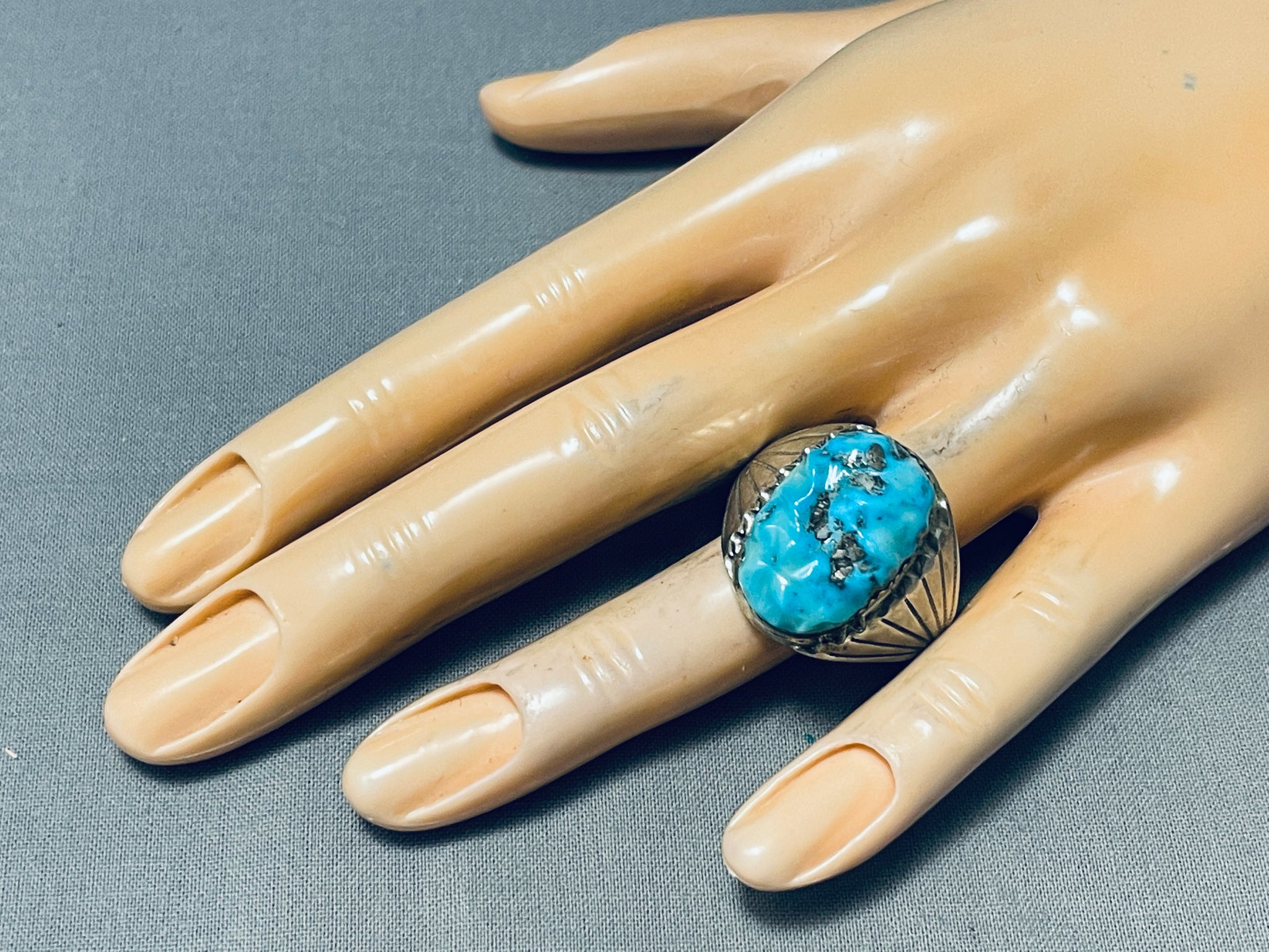 Heavy Vintage Native American Zuni Blue Gem Turquoise Sterling Silver Ring