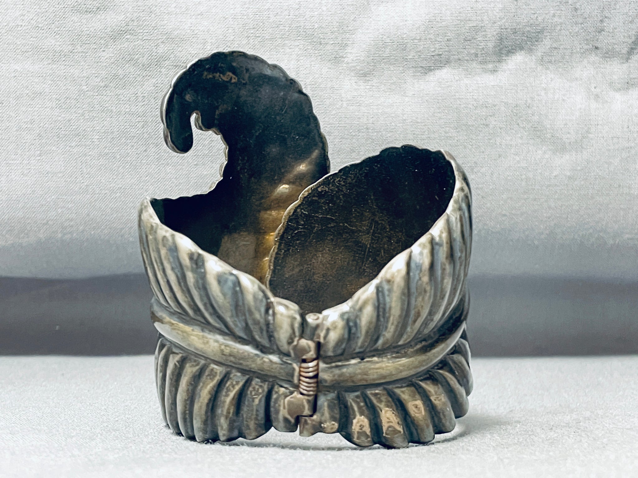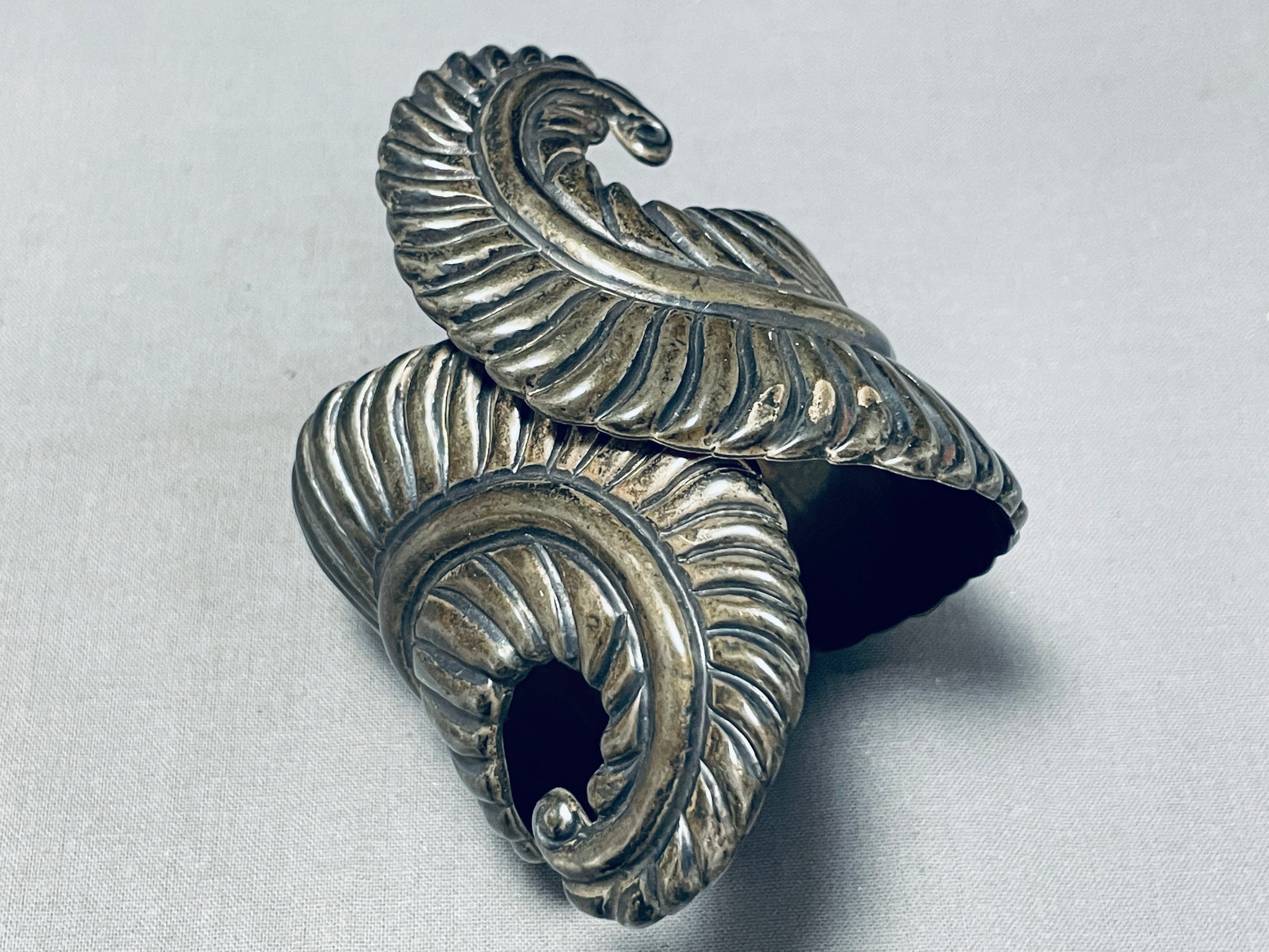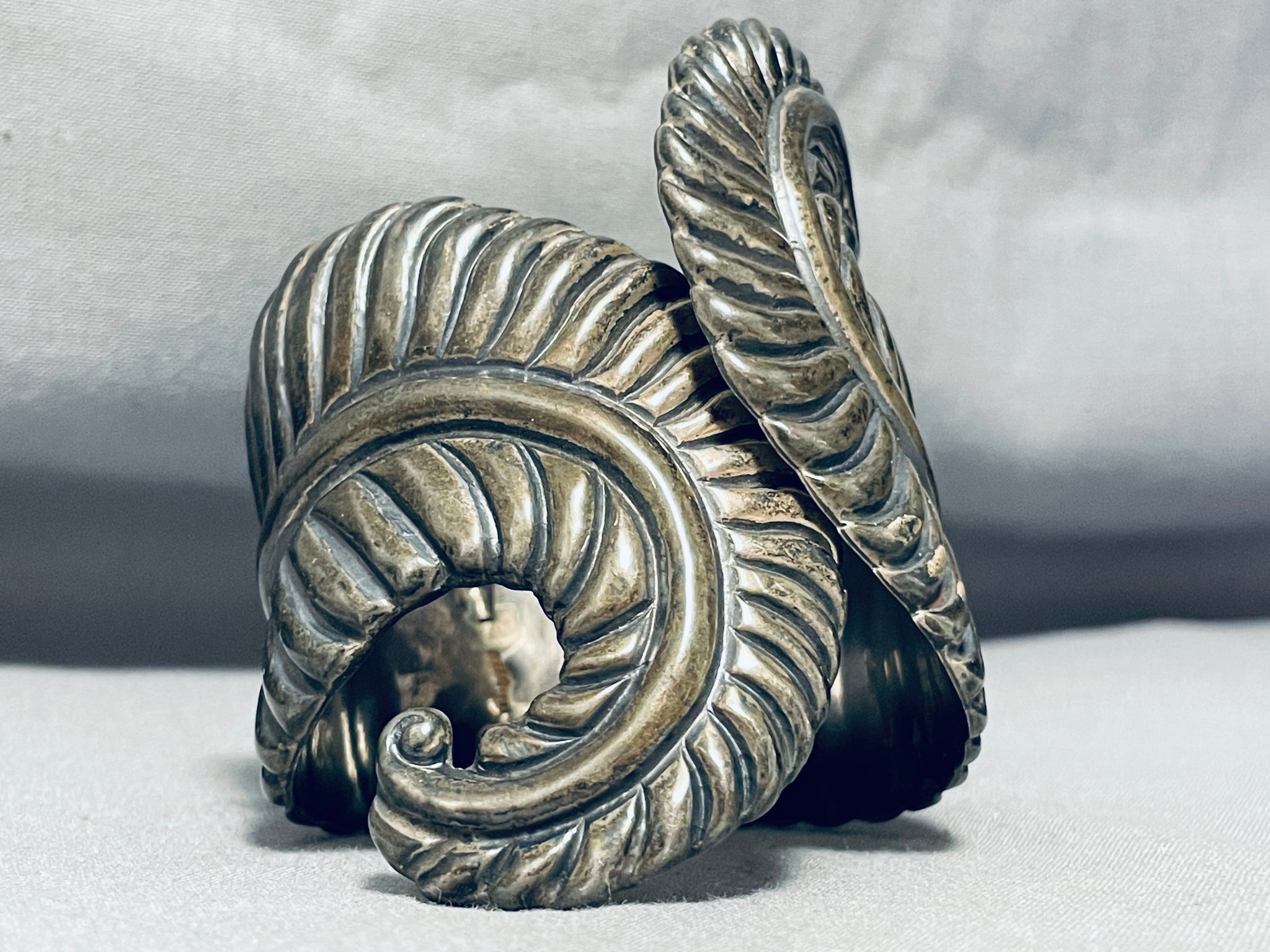This is a marvelous Southwestern unique curved silver leaf clasp bracelet. This impeccable bracelet contains a very wide hand carved silver link clasping cuff that can open up to fit nearly any size wrist. The unique beautiful waving carvings in this bracelet is stunning and so beautiful. The height at the center of the bracelet measures a whopping 3-1/4" tall. The bracelet as is measures to fit a wrist size of about 6-1/2" but again can be opened up to fit nearly any size wrist, so amazing. Sterling silver, marked. Cir. 1980's+. Sturdy 70 grams.