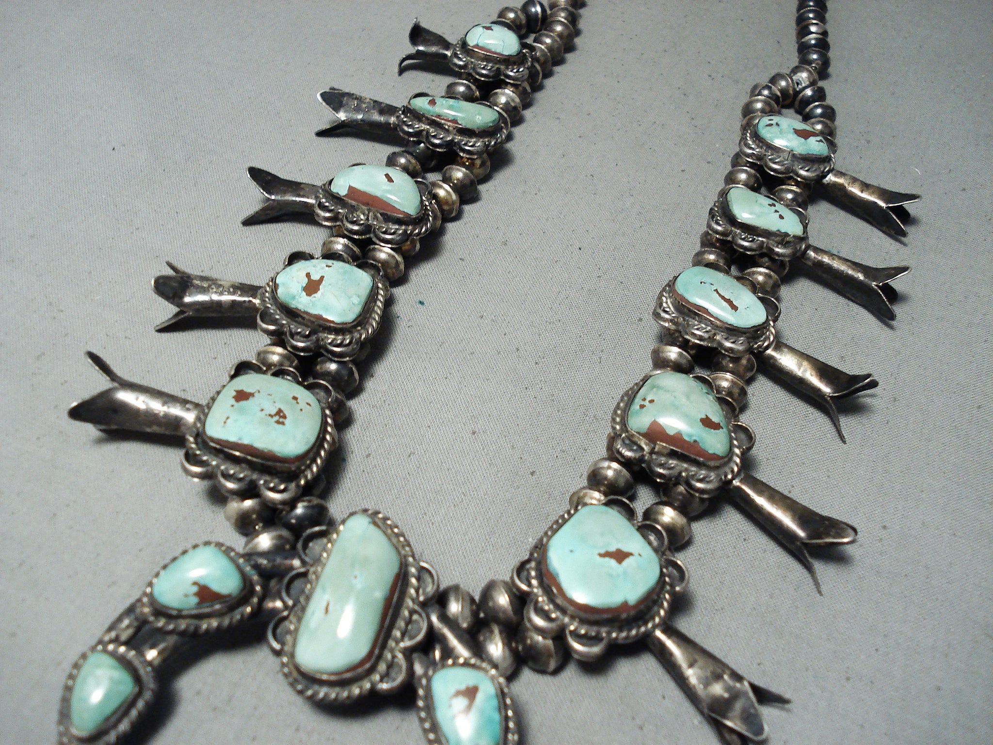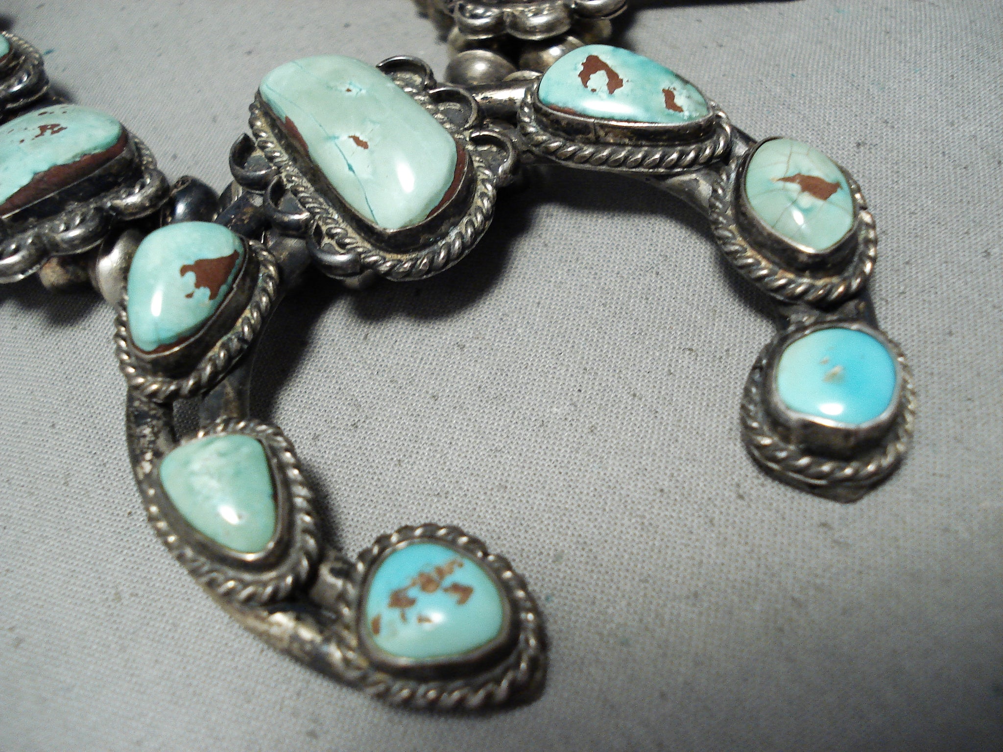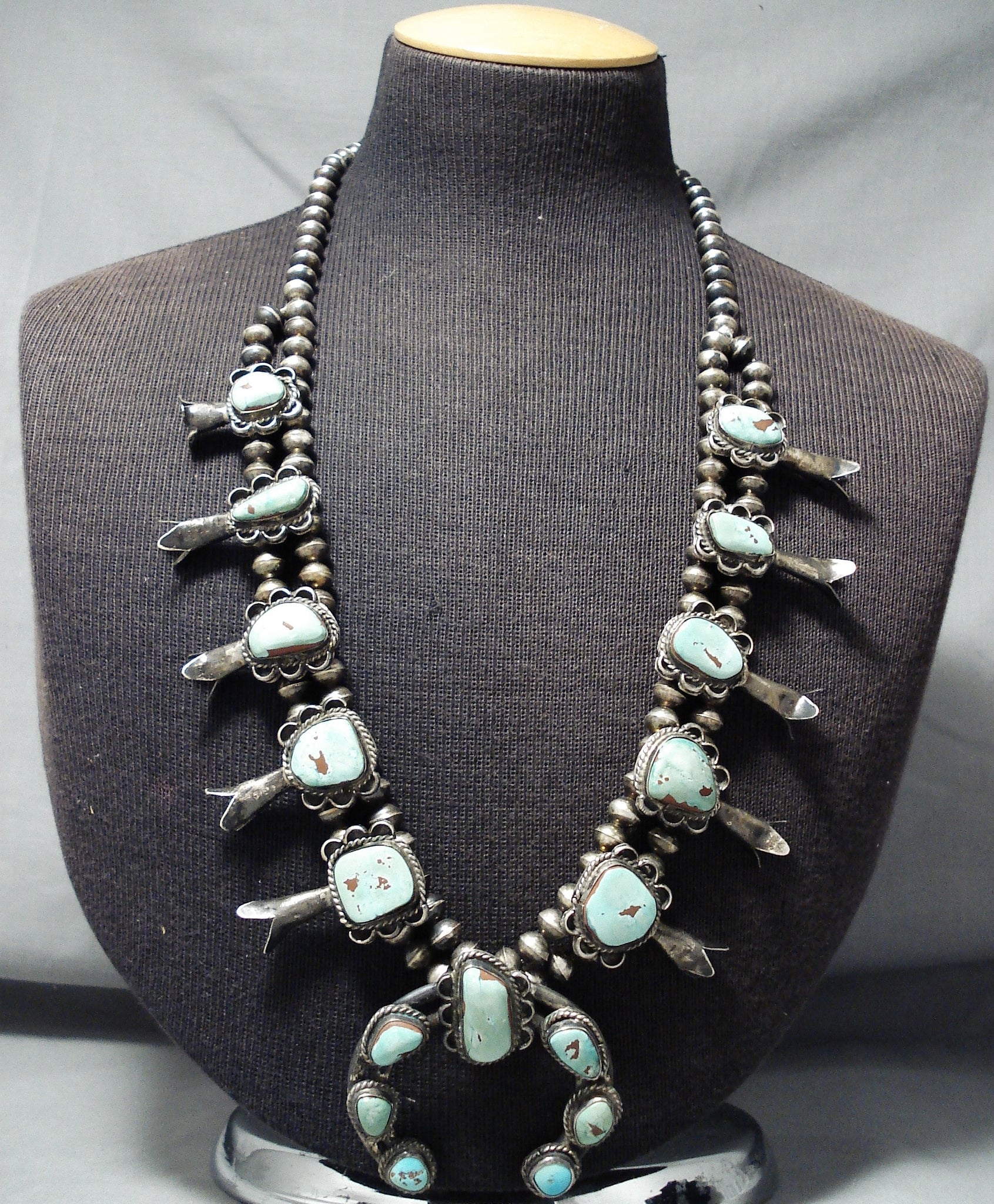 Heavy Women's Vintage Native American Navajo Turquoise Sterling Silver Squash Blossom Necklace