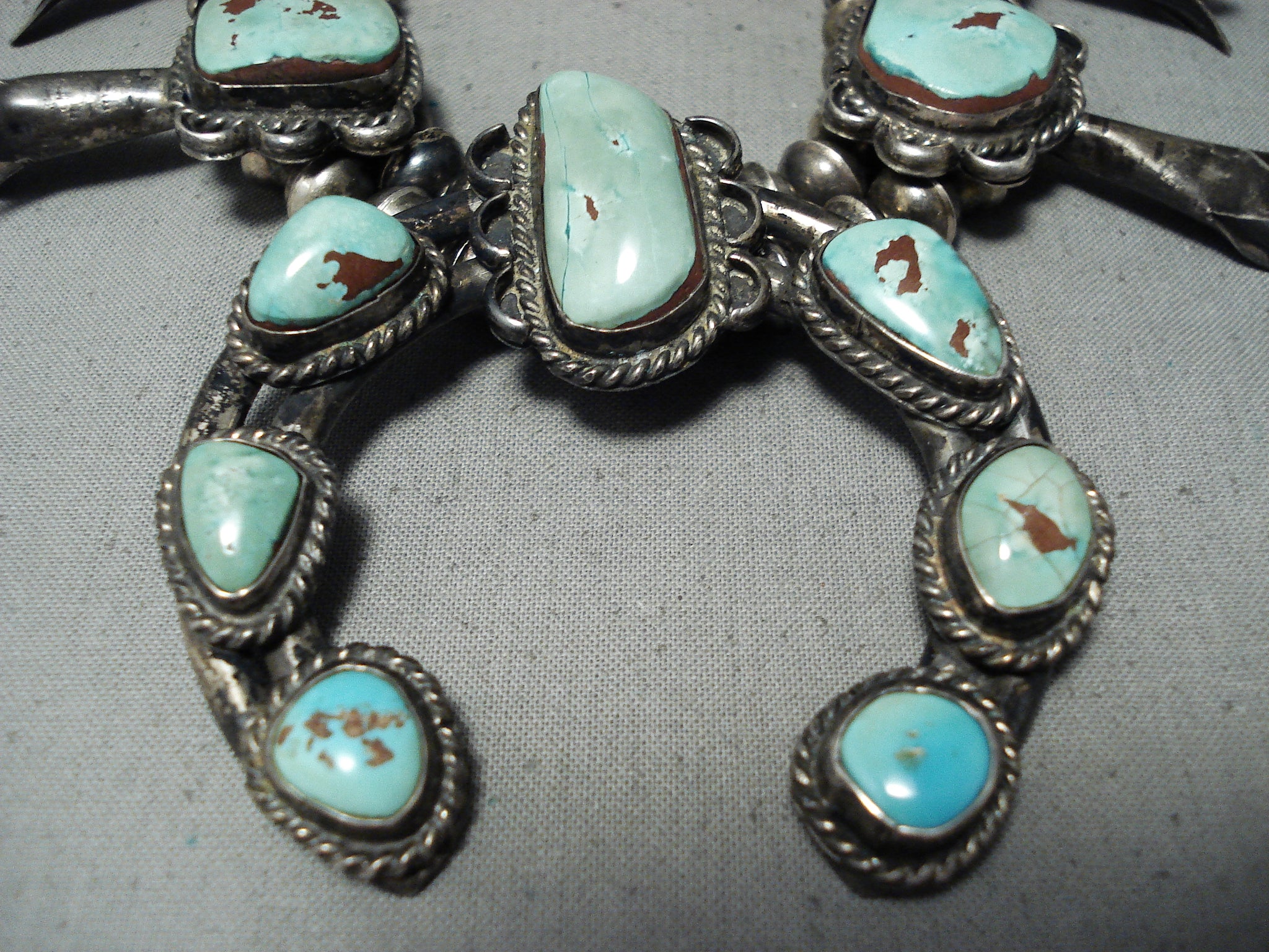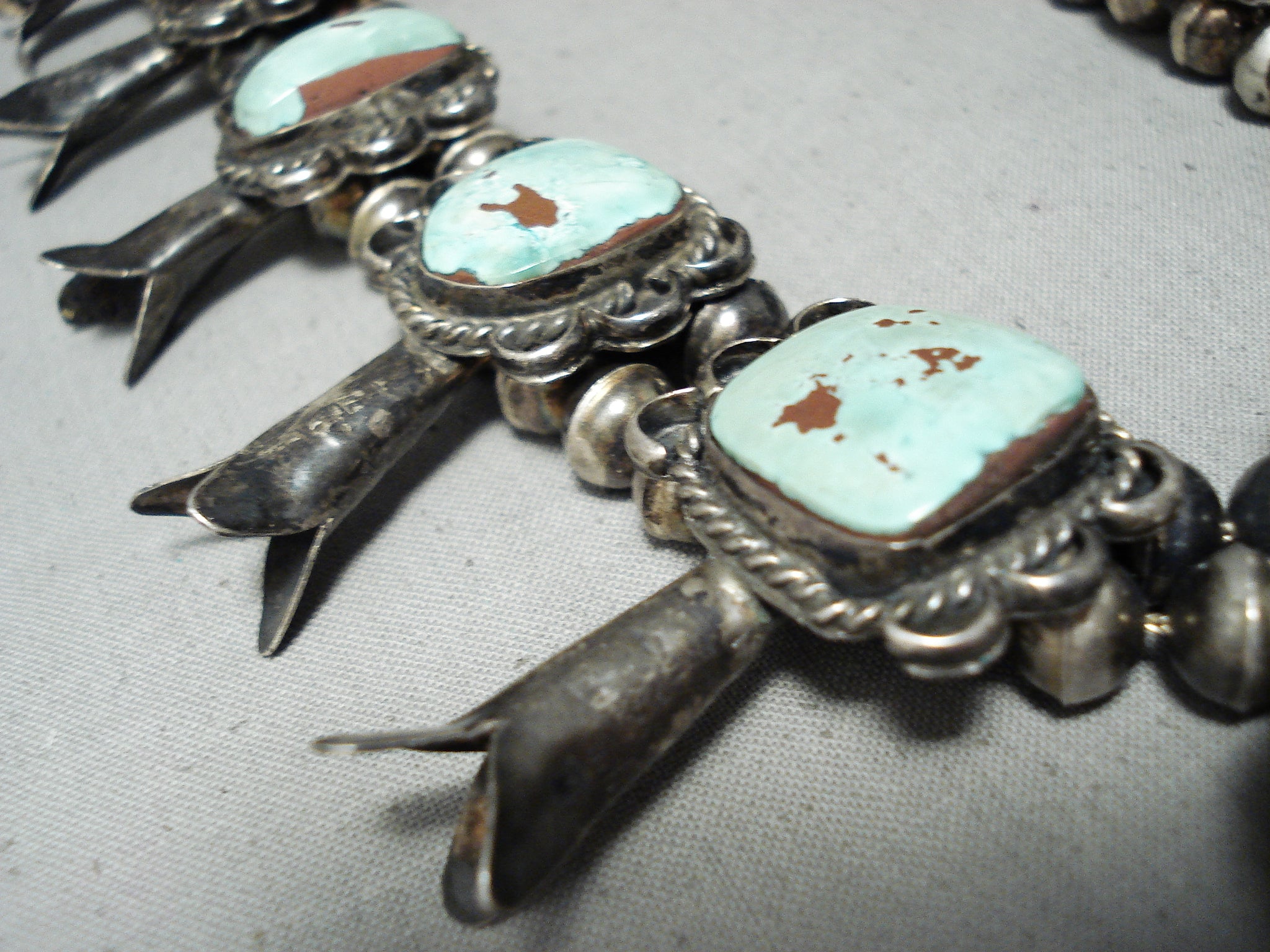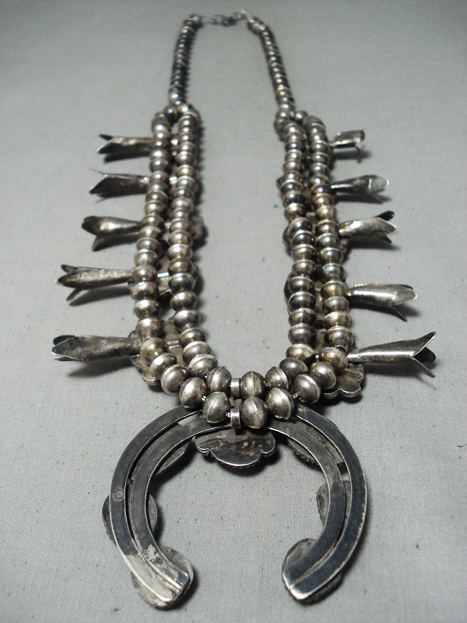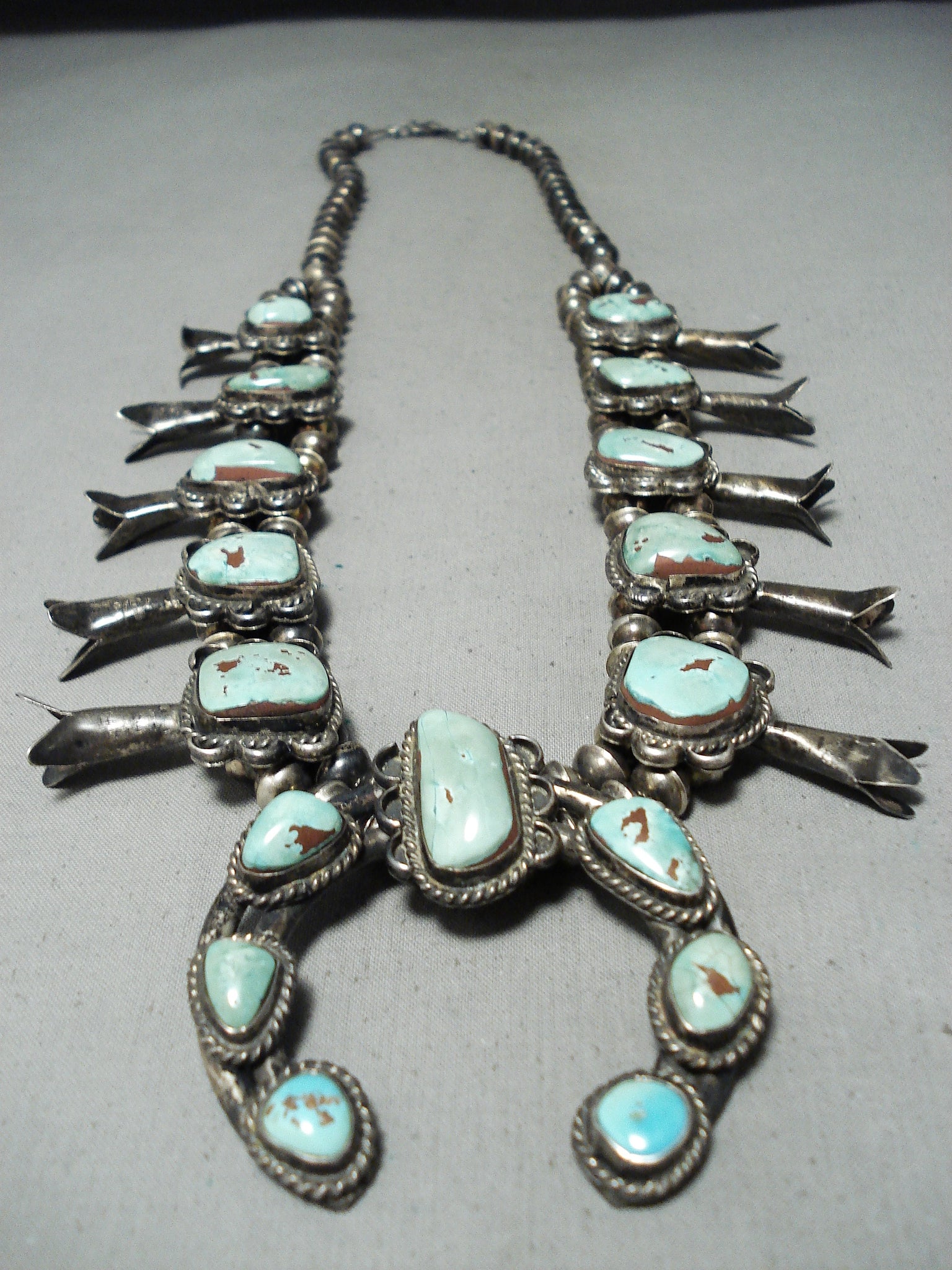Heavy Women's Vintage Native American Navajo Turquoise Sterling Silver Squash Blossom Necklace