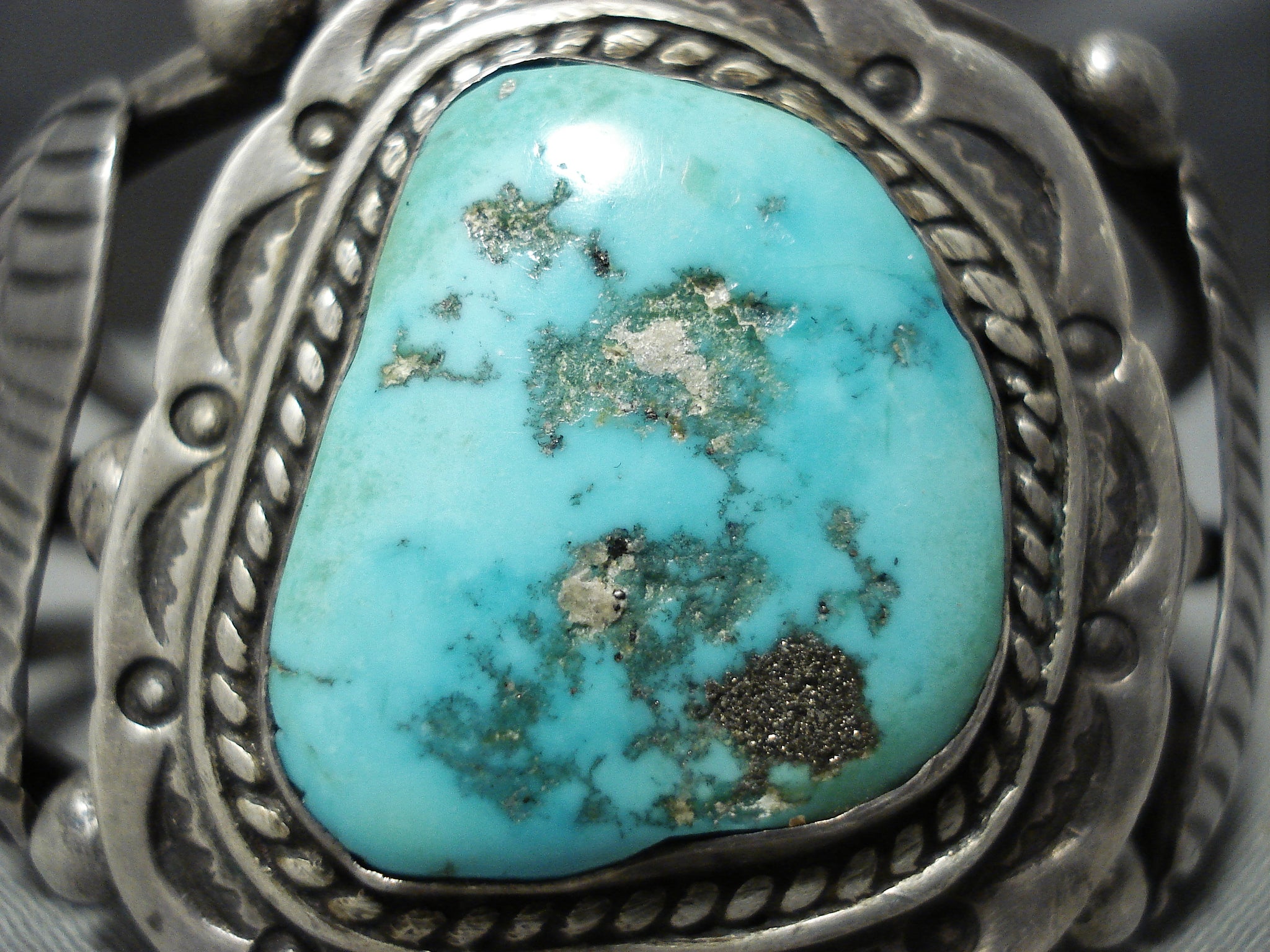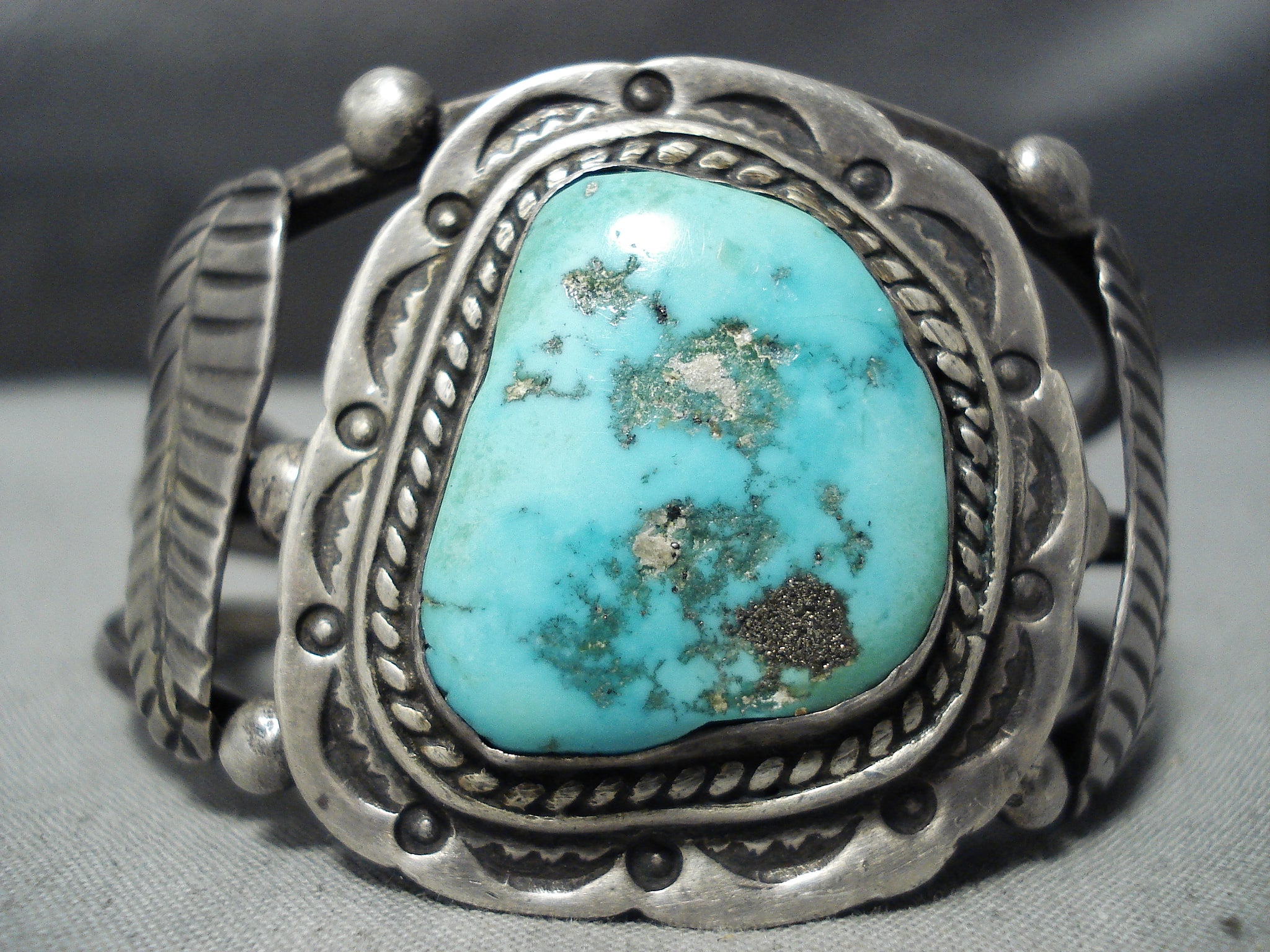 Hefty Thick Vintage Native American Navajo Turquoise Leaf Flank Sterling Silver Bracelet Old