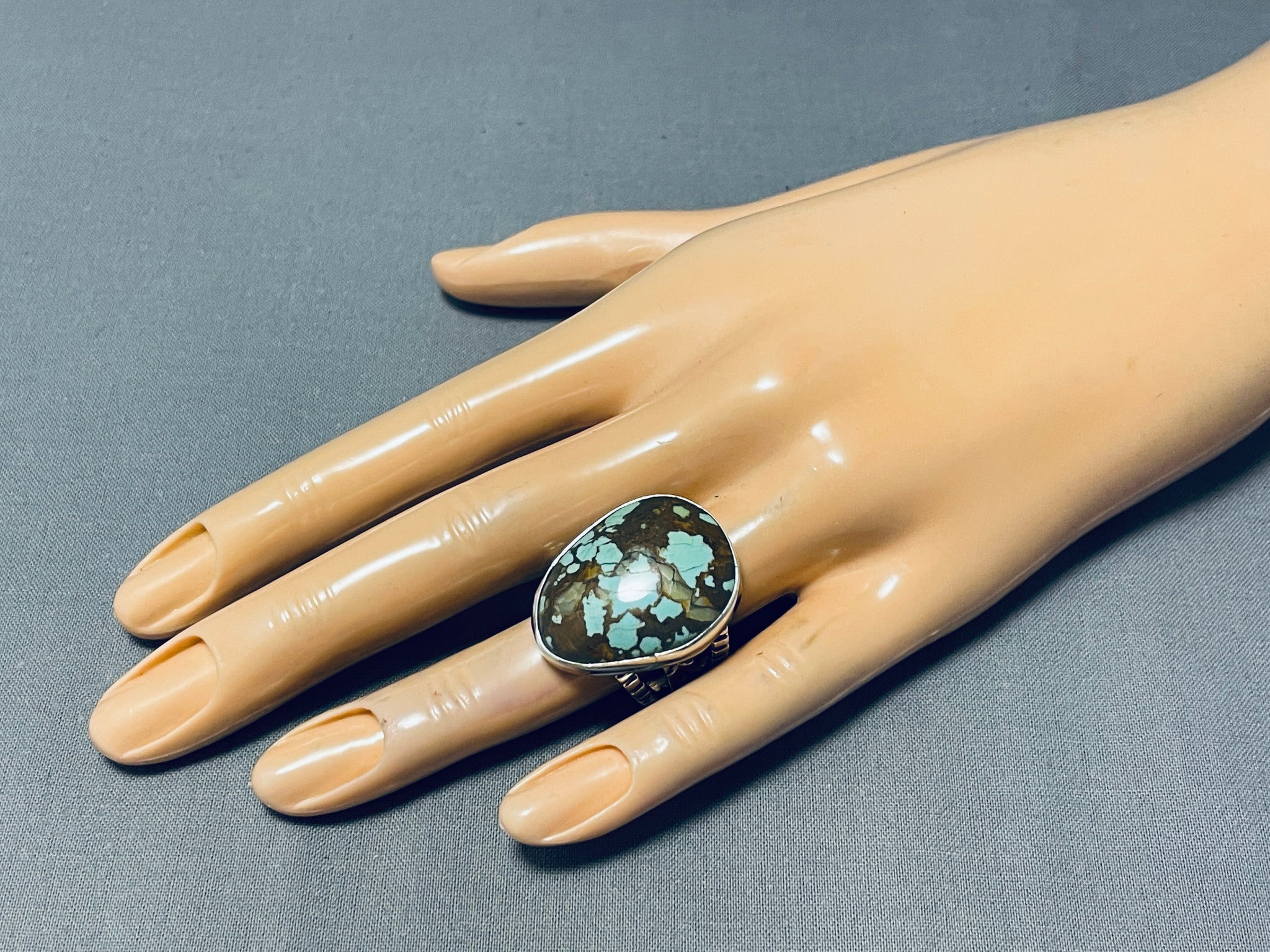 Up for sale is this superlative Navajo silver ring. Such a fantastic huge #8 turquoise stone! It sets proudly upon the marvelous handstamped triple rail band! The center stone measures around 1" x 7/8". The ring face measures around 1" x 7/8". Signed by Navajo artist, Herman Vandever. The ring size is around 9. Sterling silver, marked. Sturdy 12 grams.