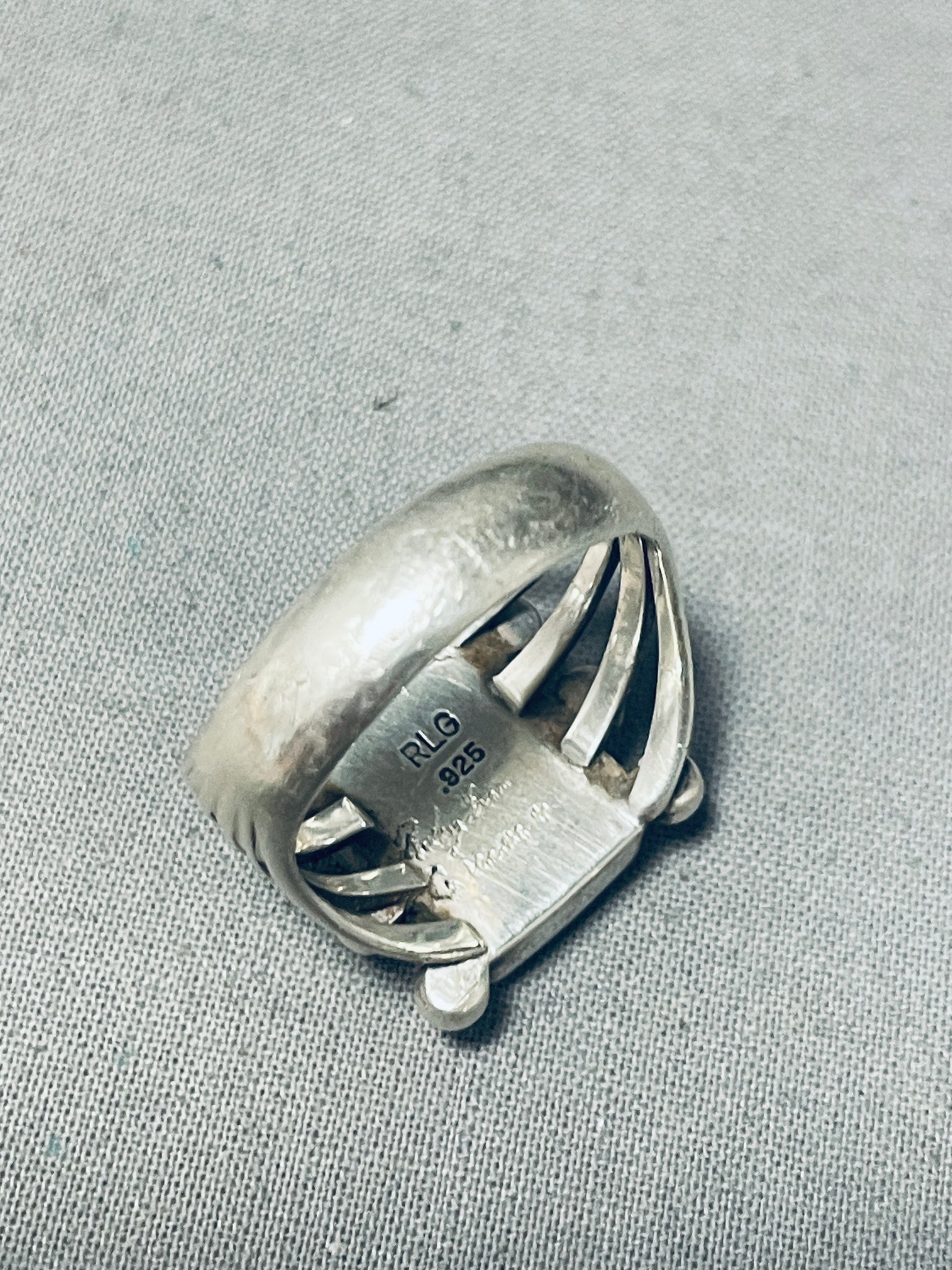 This is a superlative vintage Navajo single stone silver ring. This wonderful ring contains a superior large rectangular shaped Old Kingman turquoise stone. Surrounding the stone are 8 large amazing silver raindrops. This ring contains a marvelous sturdy and thick 5 silver shank that graduates into a thick single silver shank towards the back. The center stone measures around 5/8" x 3/8". The ring face measures around 3/4" x 5/8". Signed by Navajo artist, RLG. The ring size is around 9. Cir. 1970's+. Sterling silver, marked. Sturdy 9 grams.