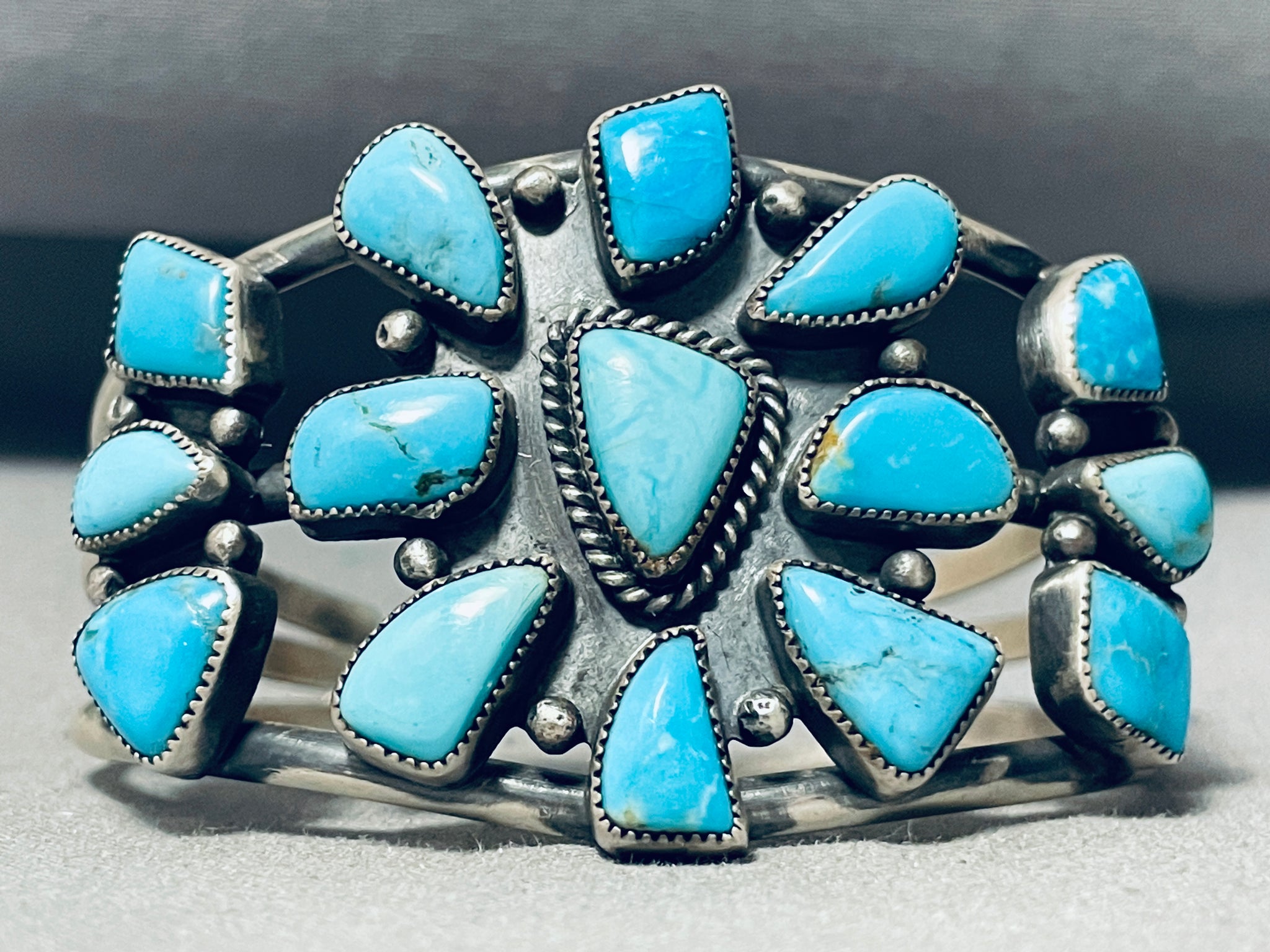 This is a breathtaking vintage Navajo turquoise cluster silver bracelet. This outstanding bracelet contains three remarkable clusters of vibrant blue colored turquoise stones. The turquoise appears to be from the phenomenal Blue Diamond turquoise mine. The Blue Diamond turquoise mine is a famous mine located in central Nevada, USA. It was discovered in the early 1900s and was one of the largest turquoise mines in the world at its peak. The mine produces high-quality turquoise with a distinctive blue color and black spiderweb matrix. The Blue Diamond turquoise mine is located in an area that was once home to several Native American tribes, including the Paiute, Shoshone, and Washoe. These tribes have a long history of using turquoise for jewelry, ceremonial objects, and other purposes.