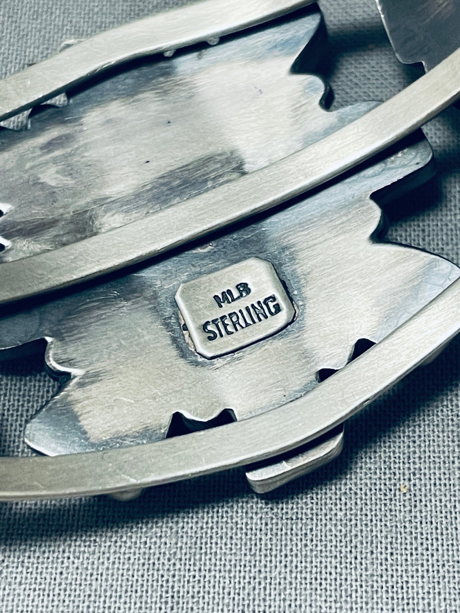 Blue Diamond turquoise is highly sought after by collectors and jewelry makers due to its unique color and matrix patterns. It is also considered a valuable investment because of its rarity and historical significance. The stones on this bracelet are in unique shapes and are superior. Located throughout the stones are wonderful silver raindrops with a center silver rope. This bracelet contains a sturdy and thick triple silver shank cuff that graduates in width towards the center. The center stone measures around 3/8" x 1/4". The width of the bracelet measures around 1-1/2". Signed by Navajo artist, MLB. Sterling silver, marked. The inside end to end measures around 5-1/4" with an additional 1-1/4" gap. Sturdy 35 grams.