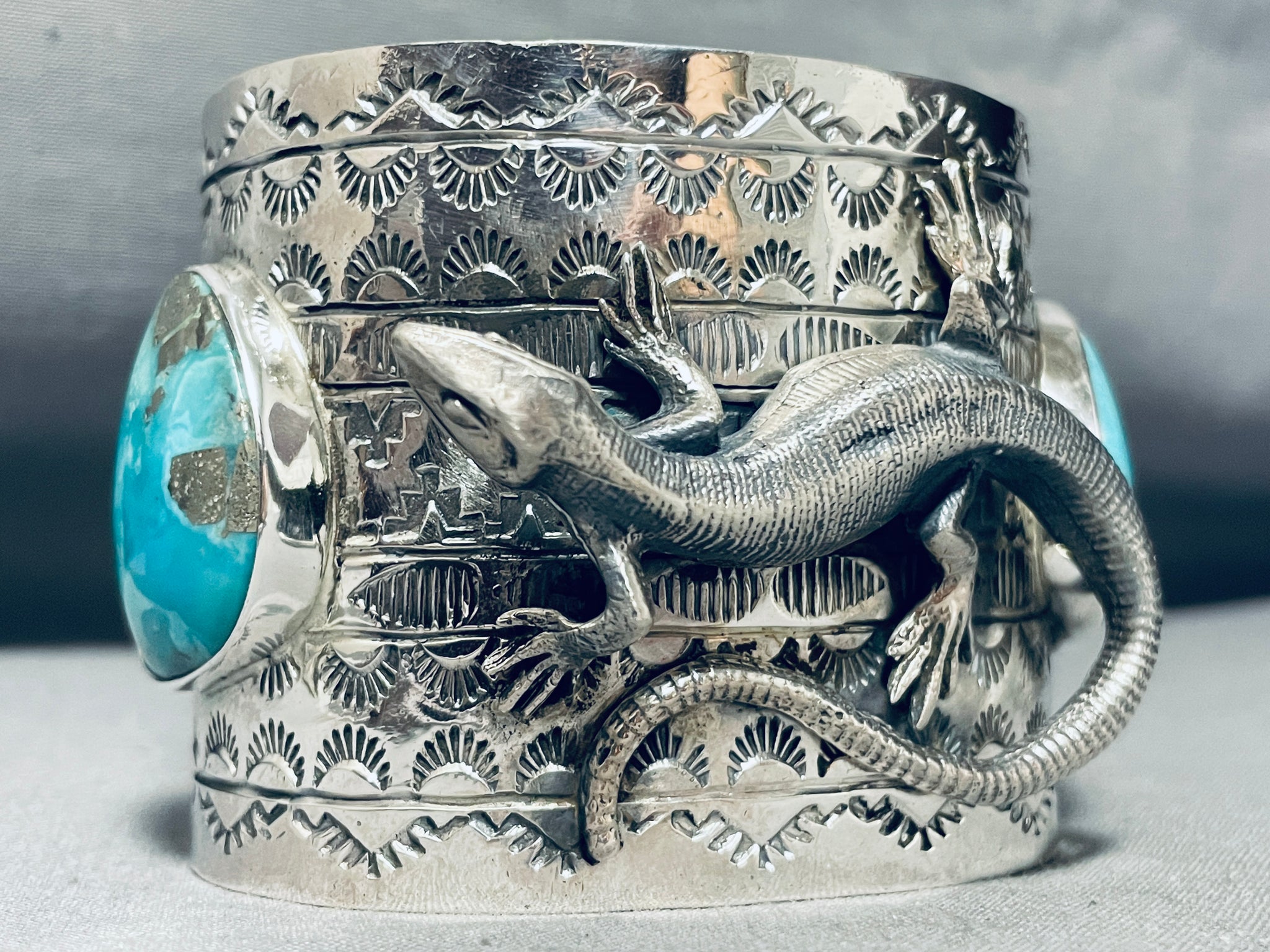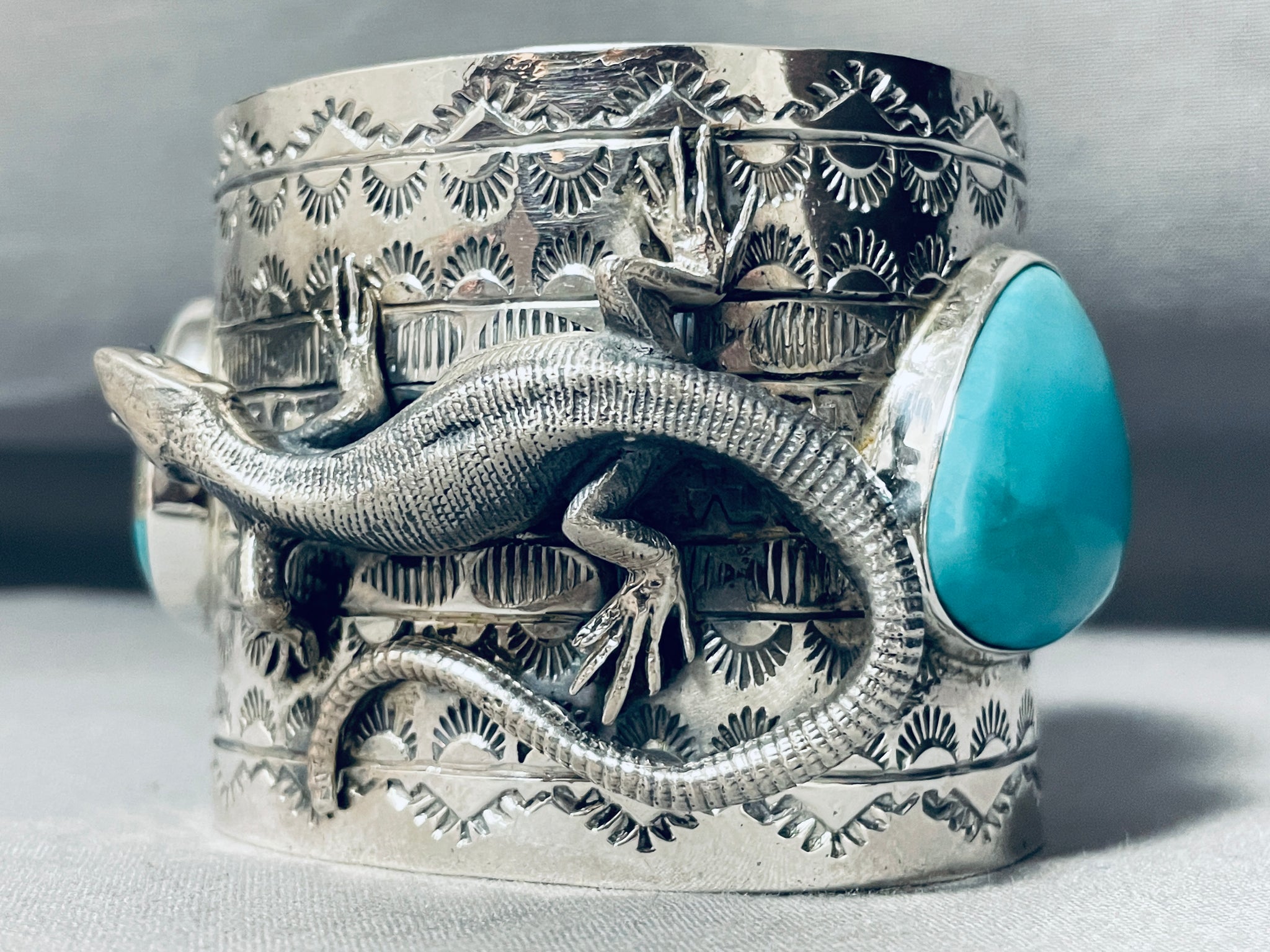 Highly Detailed Wide Native American Lizard Turquoise Sterling Silver Bracelet