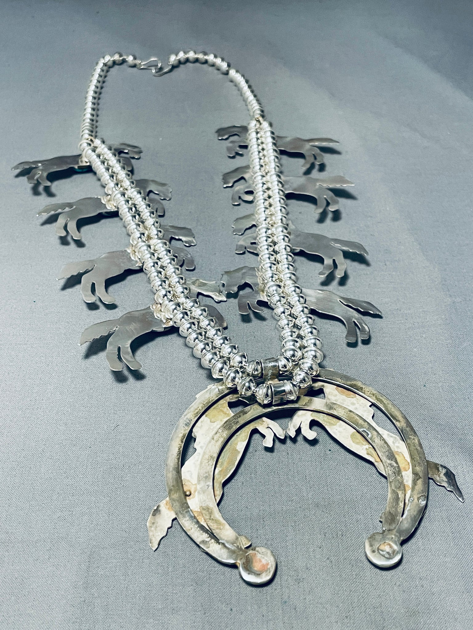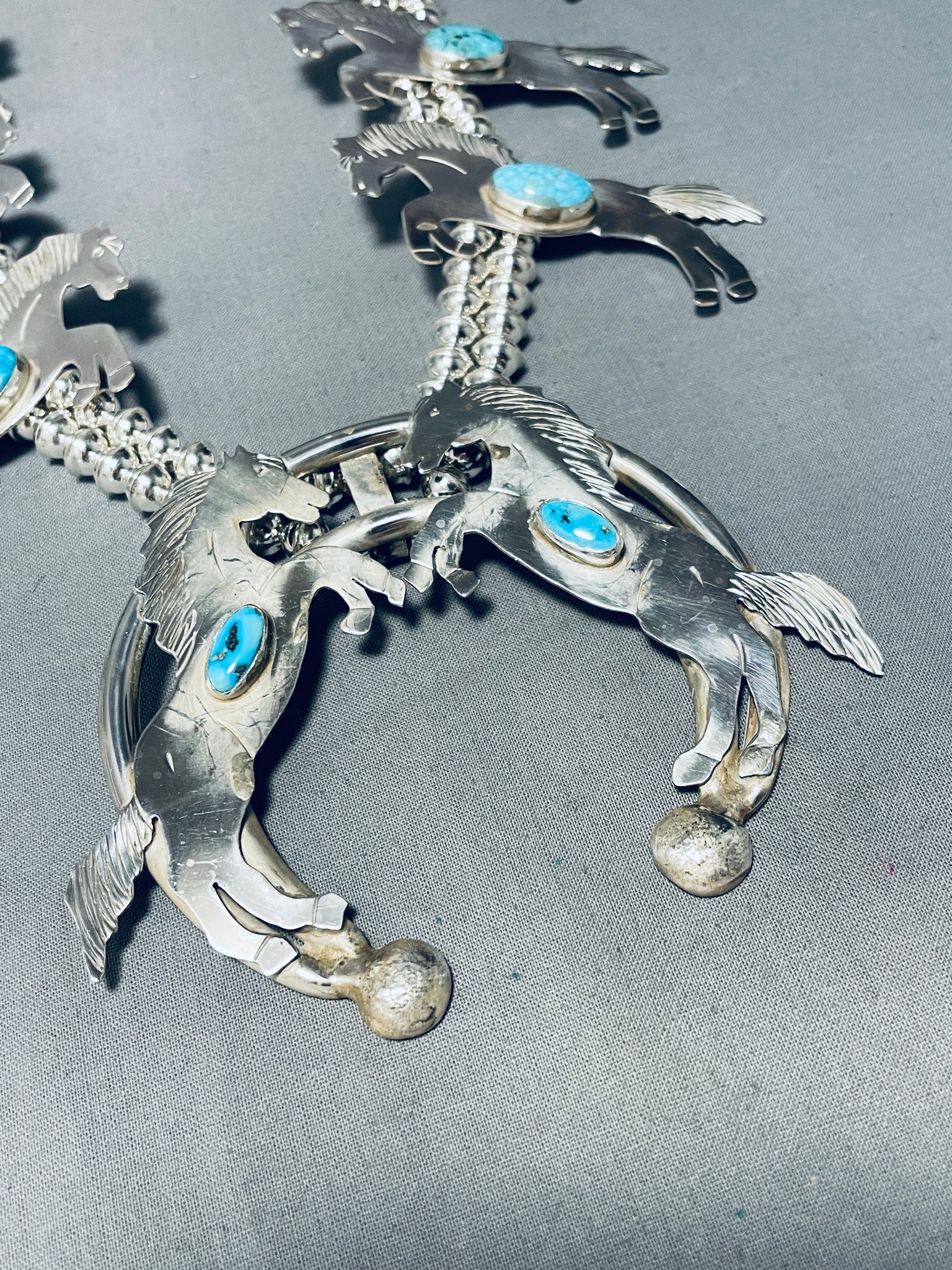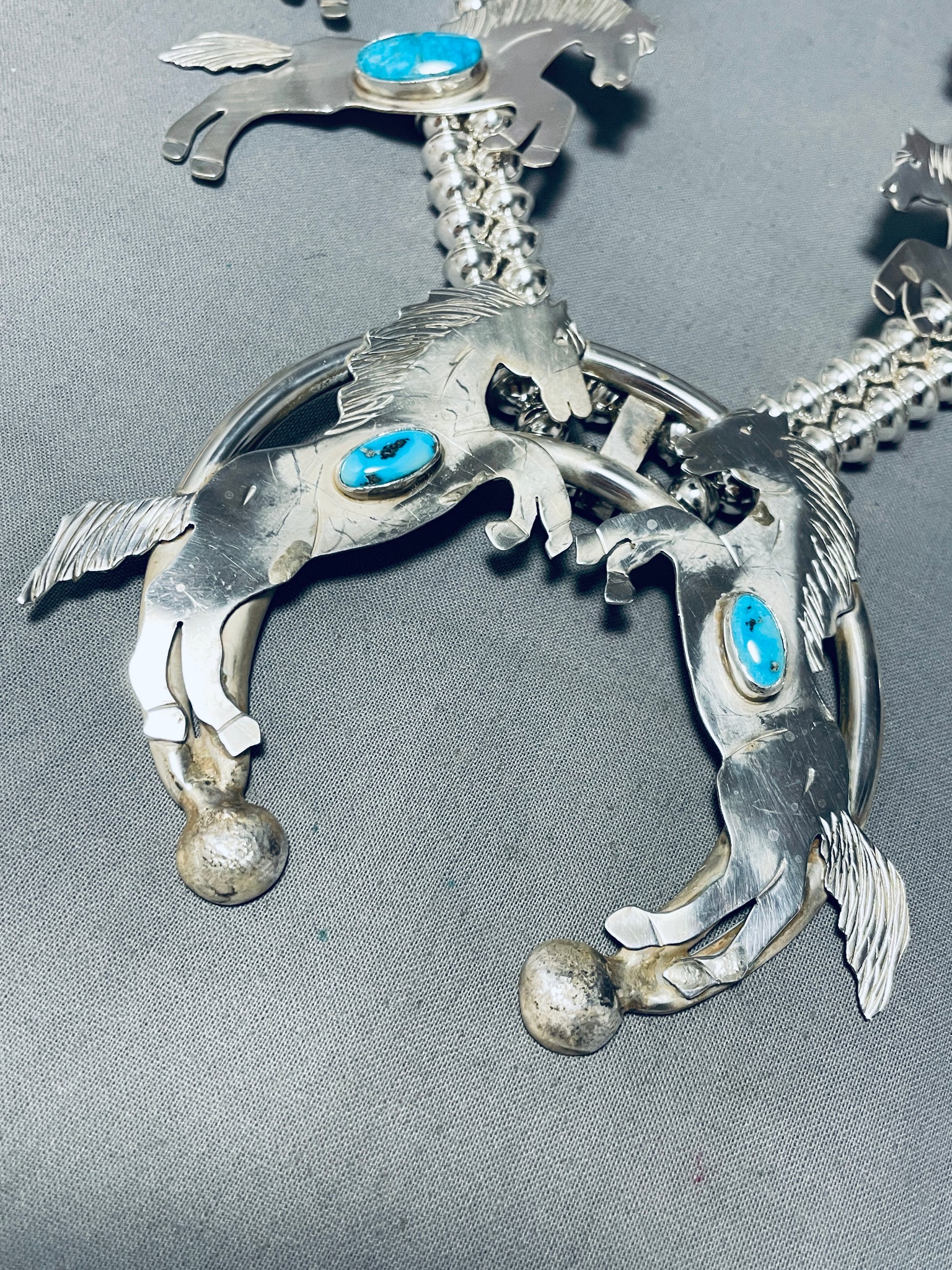 Horse Native American Navajo Turquoise Sterling Silver Squash Blossom Necklace- 190 Grams