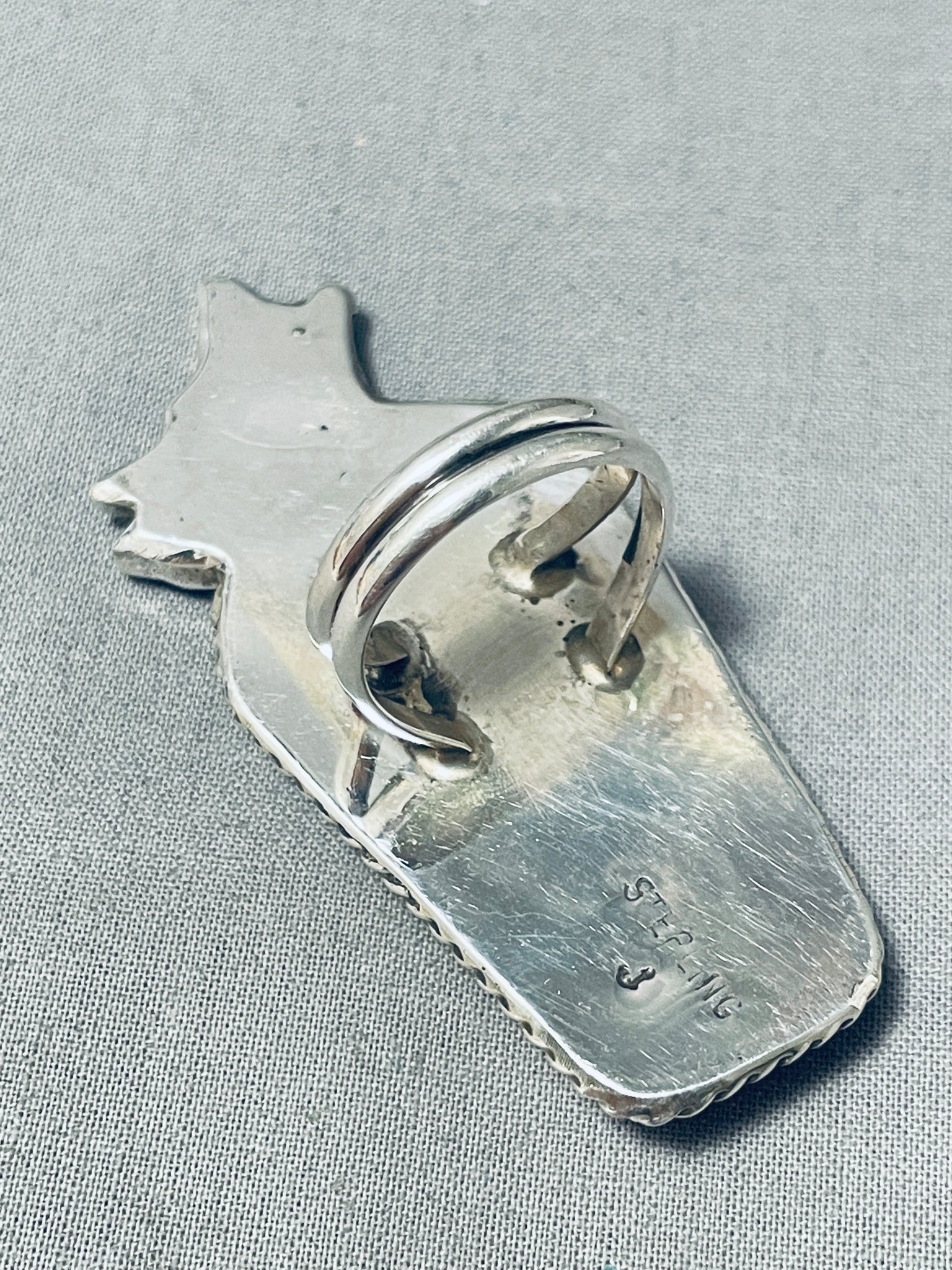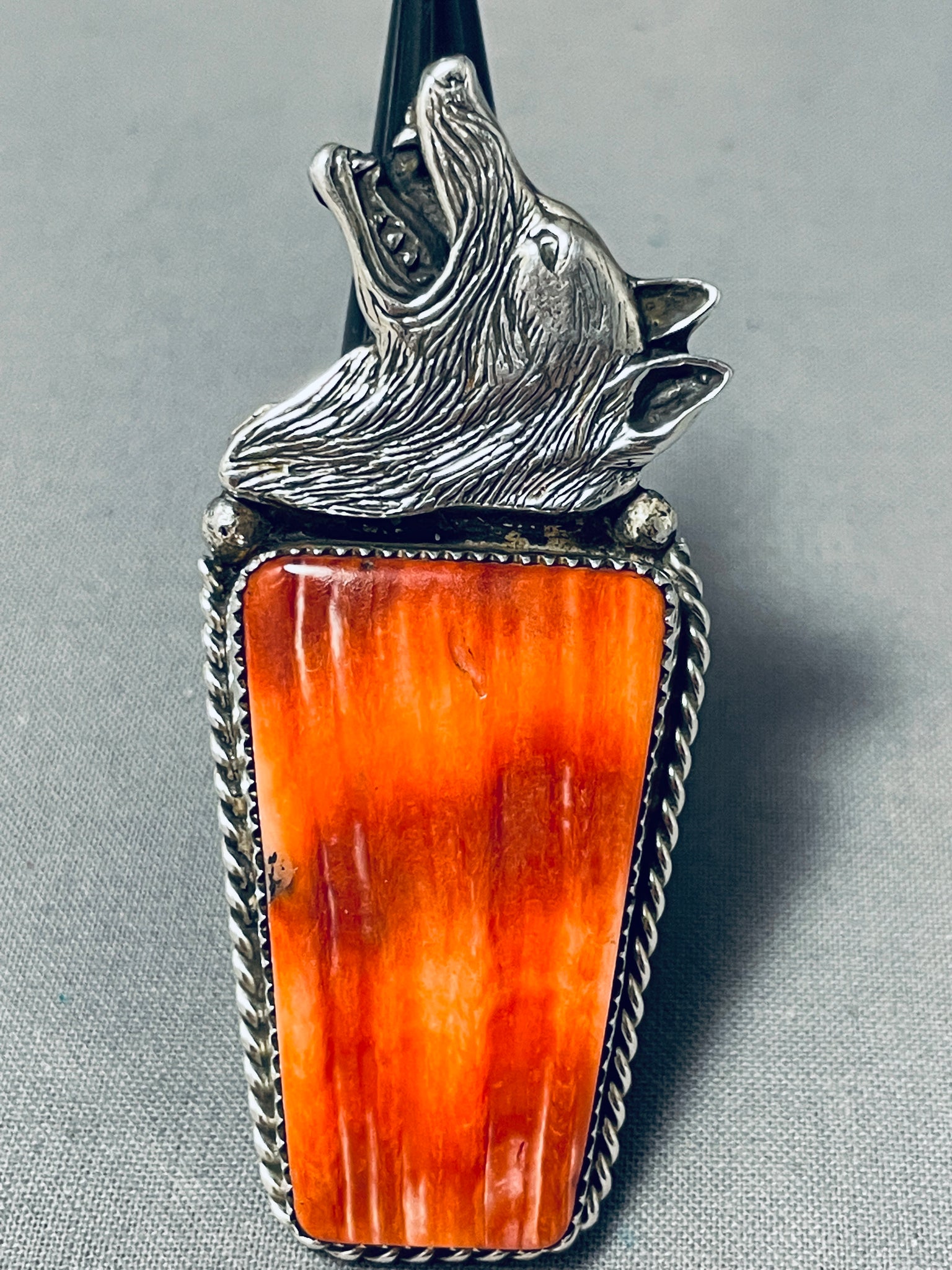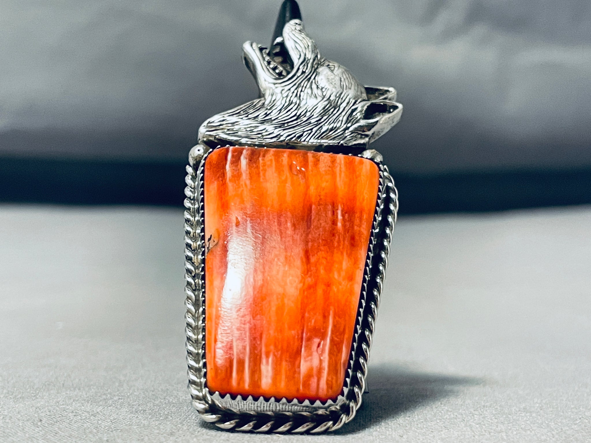 This is an astonishing Navajo silver ring. Setting atop this huge vibrant trapezoid shaped spiny oyster shell stone is the realistic coyote head, howling at the moon! The center stone measures around 1-1/2" x 7/8". The ring face measures around 2-5/8" x 1-1/8". The ring size is around 10. Sterling silver, marked. Sturdy 26 grams.
