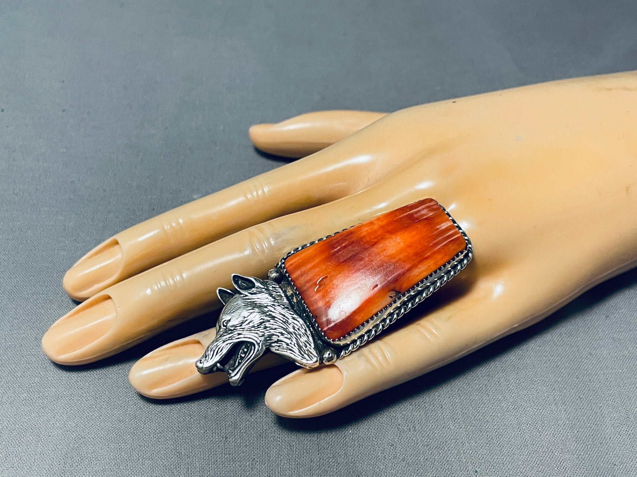 Howling Coyote Native American Navajo Sterling Silver Spiny Oyster Ring
