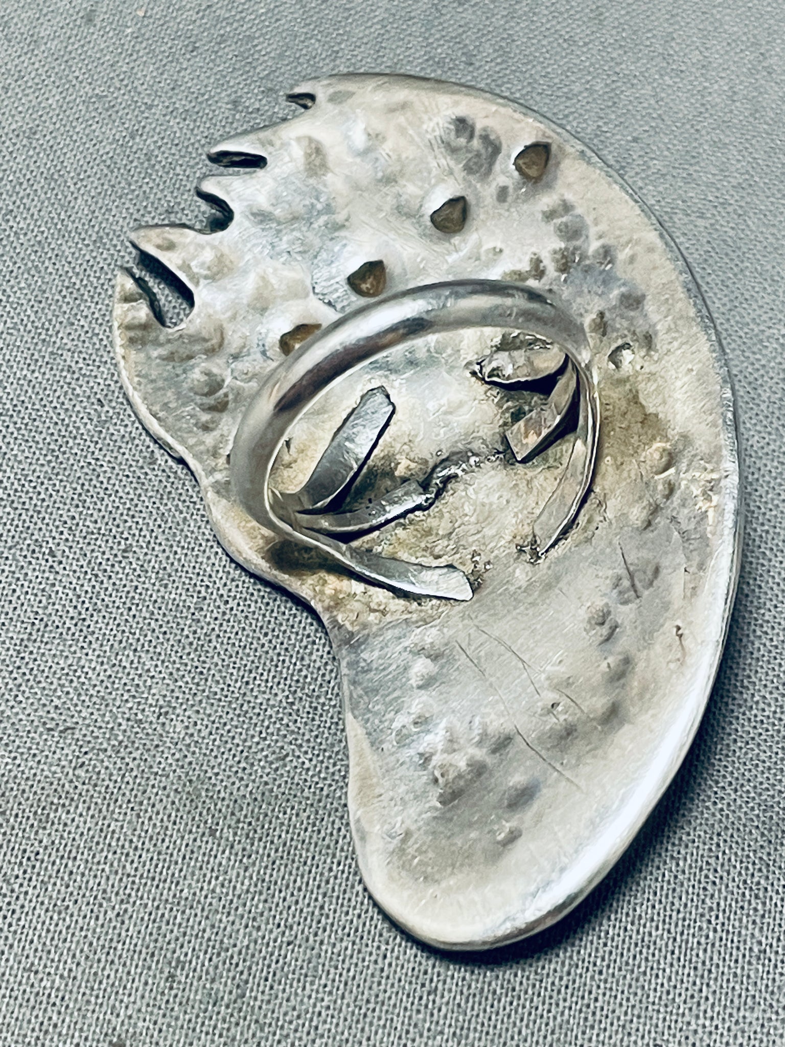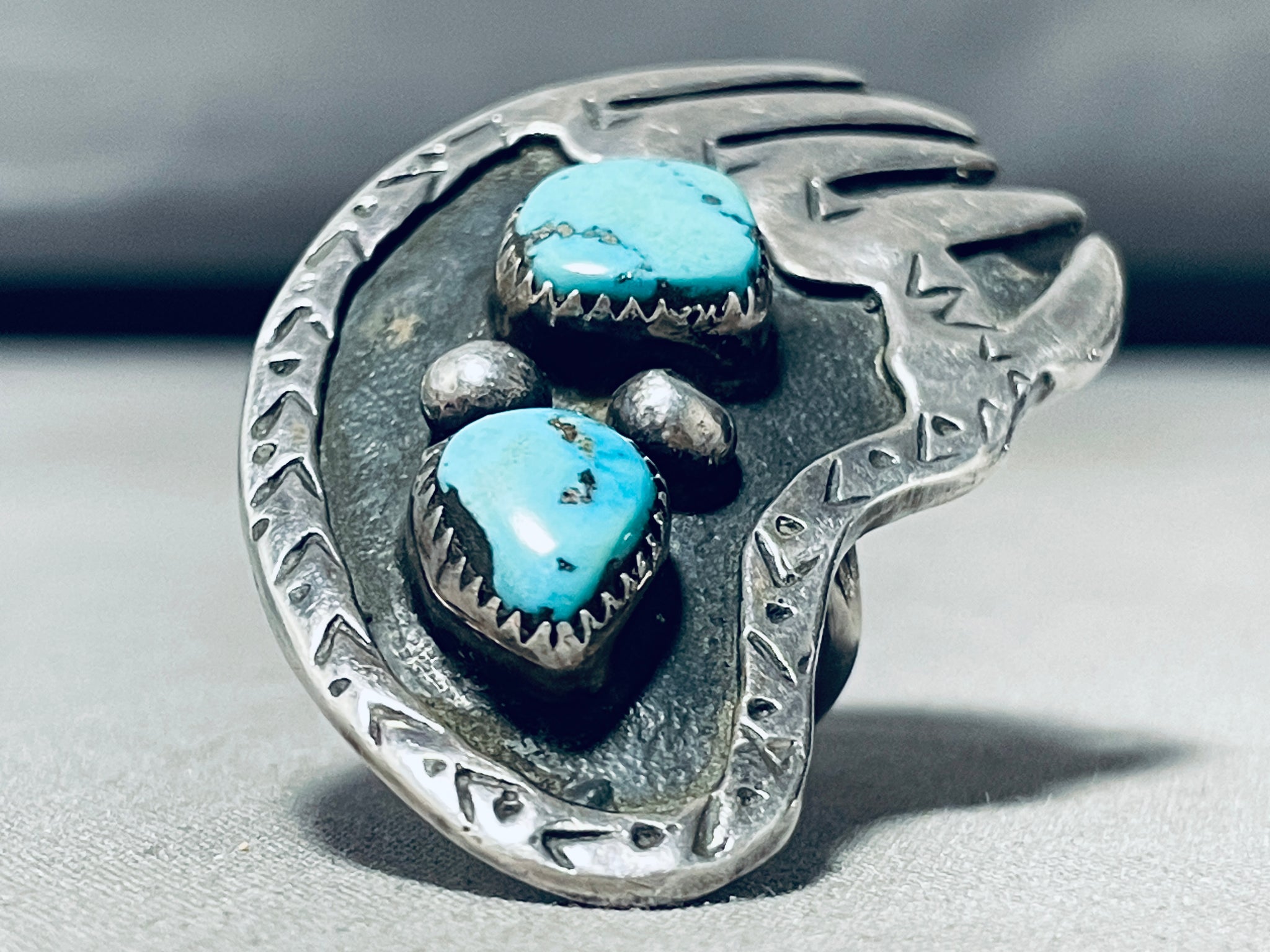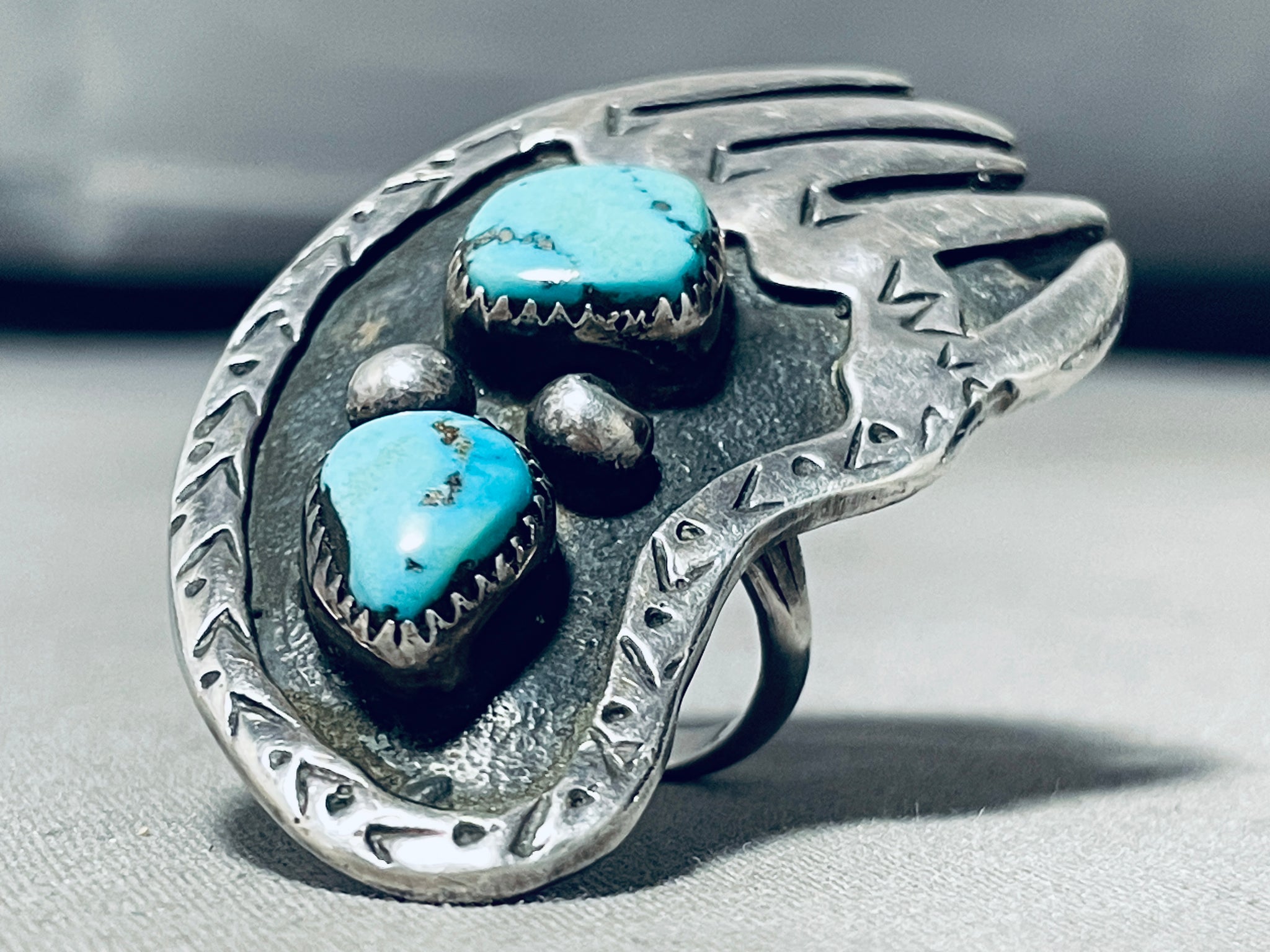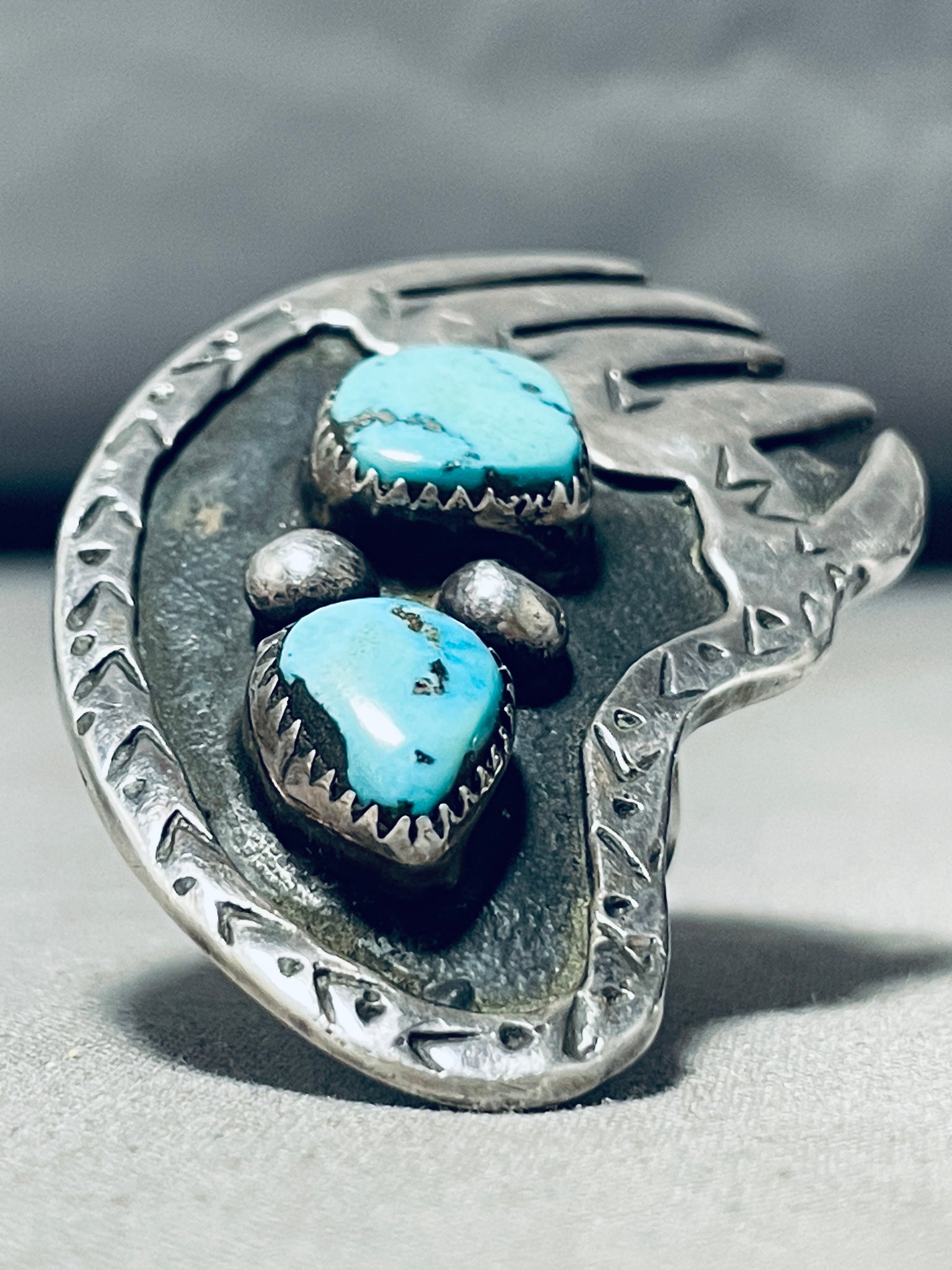 Hueg And Old!! Vintage Native American Navajo Turquoise Sterling Silver Bearpaw Ring