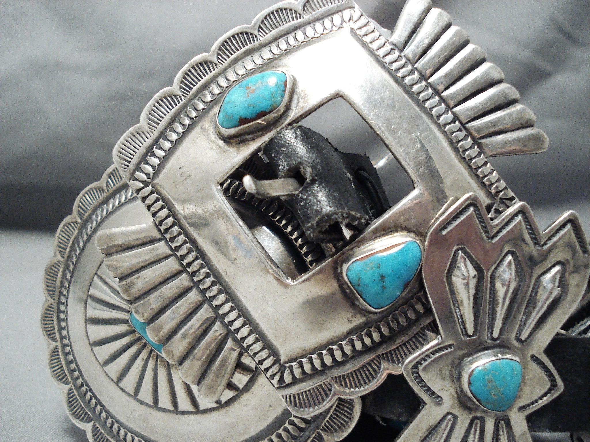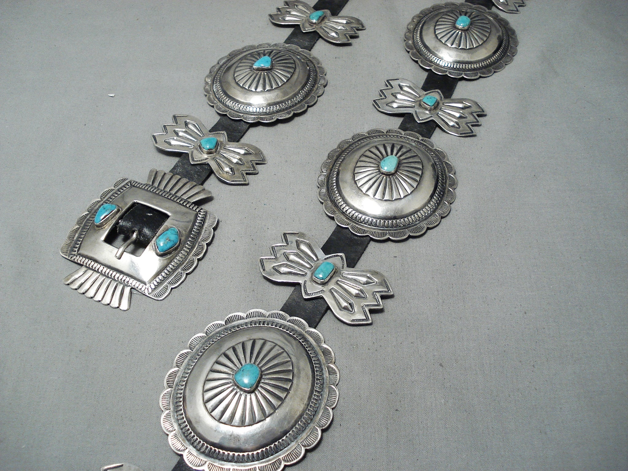 This is a museum quality vintage Navajo turquoise and silver concho belt. This outstanding piece contains 15 old silver conchos. This piece is extremely old and consists of a remarkable turquoise stone that is placed in each concho as well as 2 on the amazing large silver buckle. Each rounded silver concho measures around 3-1/8" X 2-3/4". The incredible large silver buckle measures around 3-1/4" X 2-1/2". The turquoise appears to be from the wonderful Blue Gem turquoise mine. The surrounding silver works include sun stampings, channel patterns and repoussed shells. The stones measure around 1/2" x 3/8". Sterling silver. Cir. Mid century . This belt will fit a waist size between 42-3/4" and 47". Sturdy 541 grams.