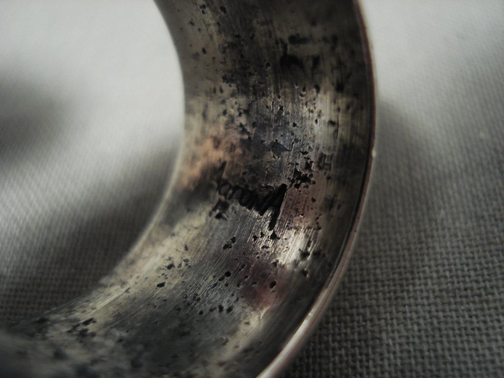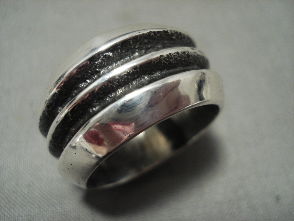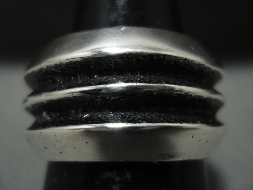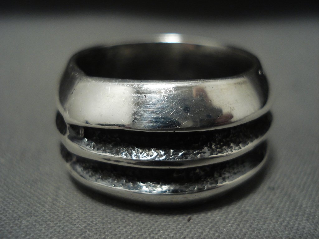 This is a remarkable vintage Navajo Native American jewelry Native American jewelry all silver ring. This piece was handmade by the famous artist Aaron Anderson. The ring is very thick and heavy and consists of beautiful deep line segments that wrap around the entire shank. The width of the ring measures around 1/2 and the ring measures to be a size 10.5. Aaron is one of the most famous tufa cast artists. Signed by Navajo Native American jewelry Native American jewelry artist, Aaron Anderson . Sterling silver. Sturdy 24 grams.
