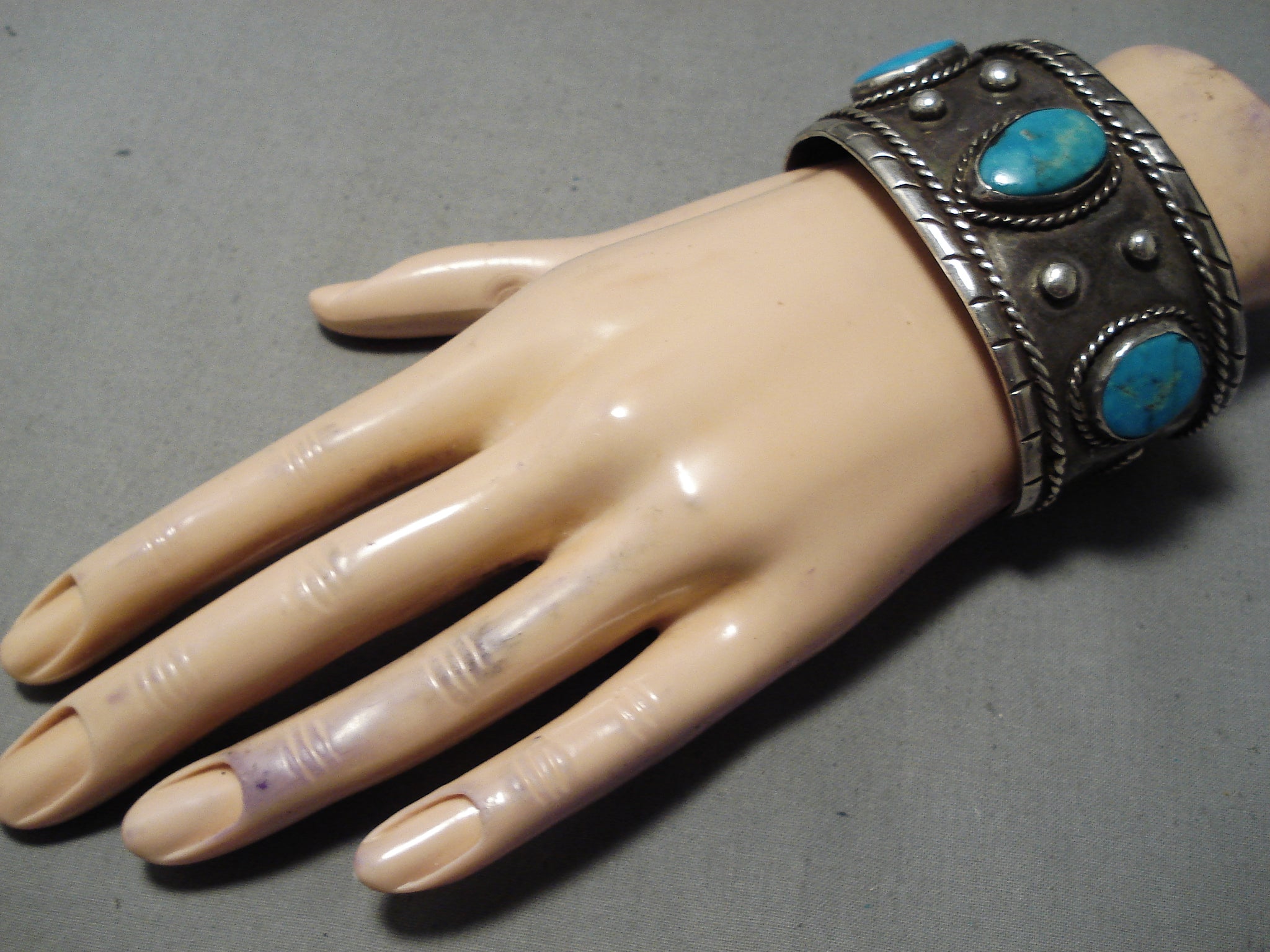 Huge Authentic Men's Vintage Native American Navajo Turquoise Sterling Silver Bracelet Old