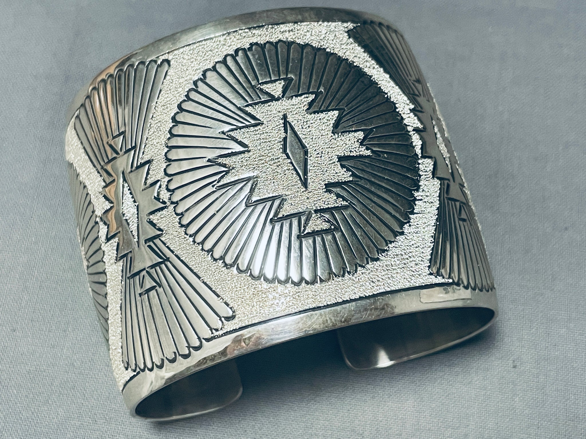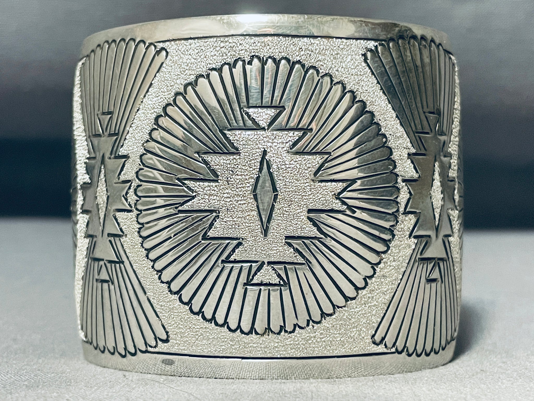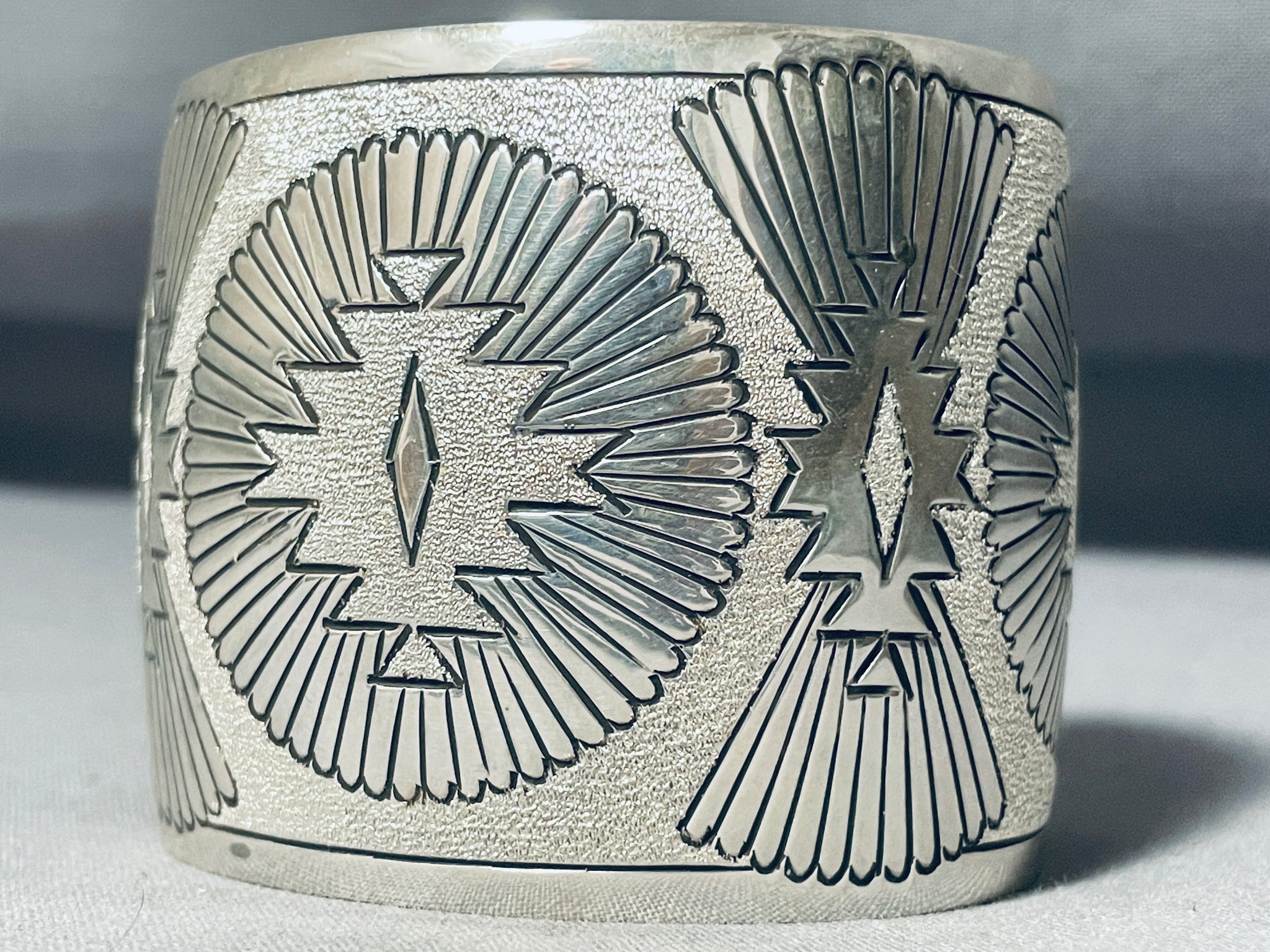 This is a magnificent vintage Navajo all silver wide cuff bracelet. This remarkable bracelet contains unique and beautiful hand carved silver concho patterns that rest from one end of the cuff to the other. The stamped concho patterns are just spectacular and so precise with center hand carved pueblo patterns. The multiple textures on this cuff is just phenomenal and so amazing as well as the workmanship. The width of the bracelet measures around 2". Signed by Navajo artist, T. Sterling silver, marked. The inside end to end measures around 5-1/2" with an additional 3/4" gap. Sturdy 68 grams.
