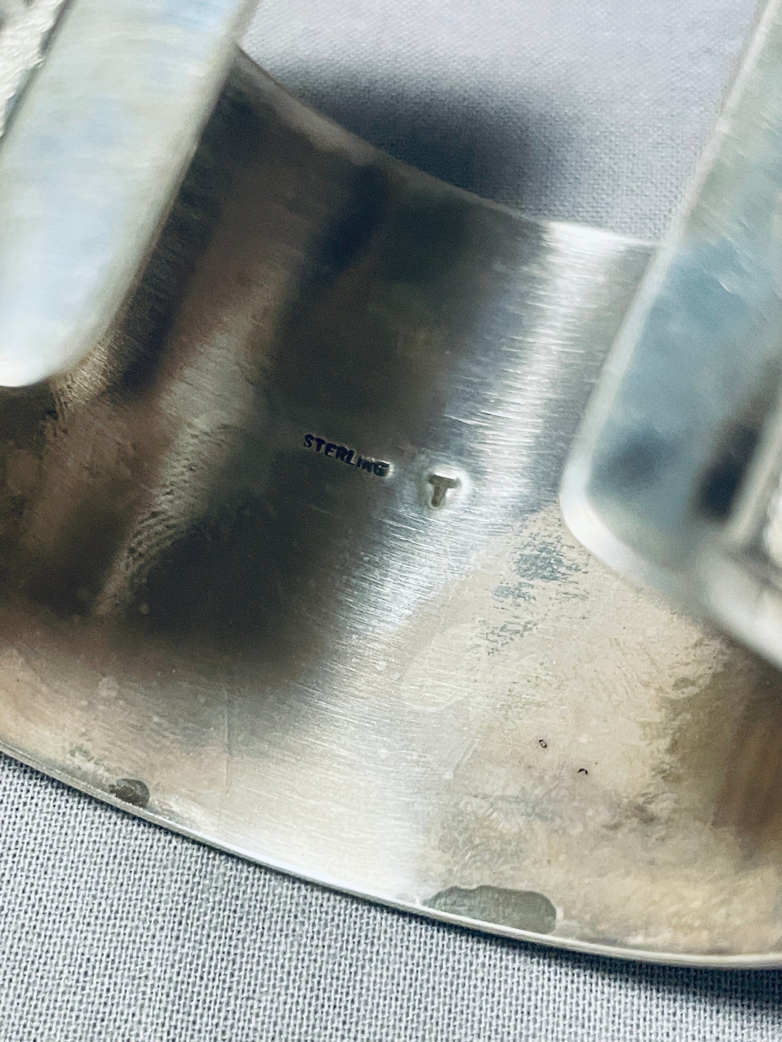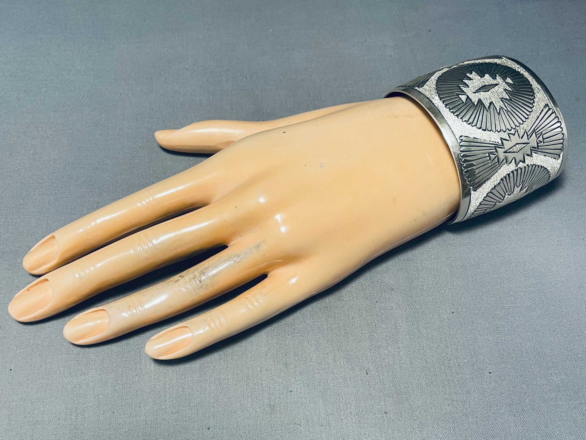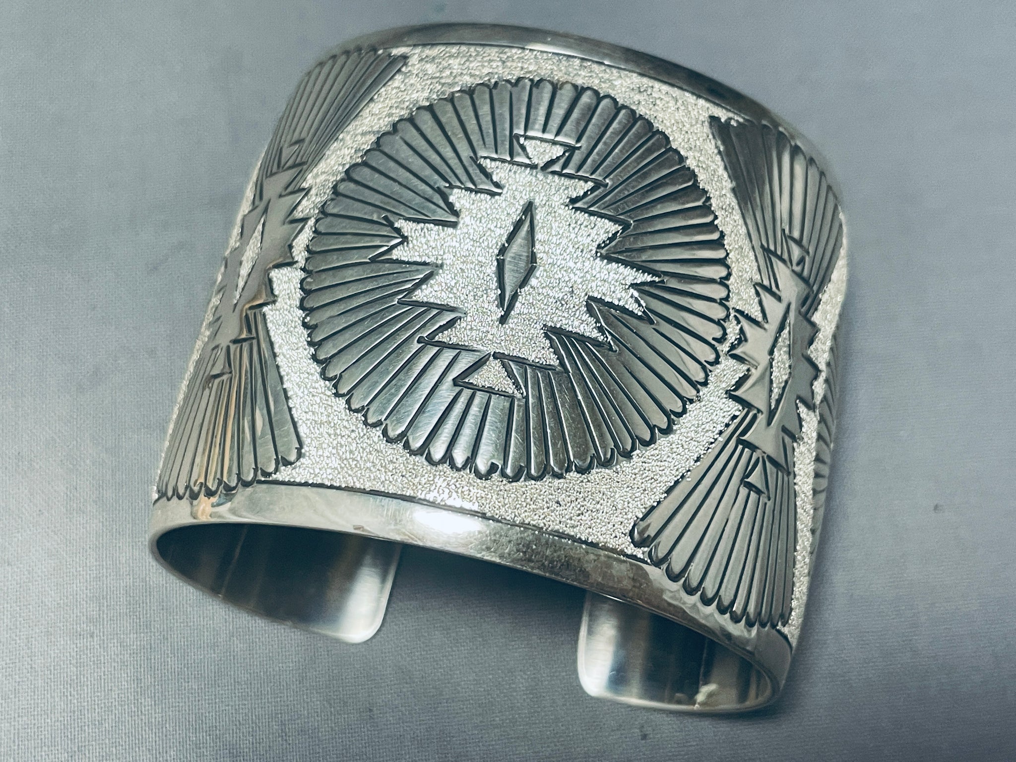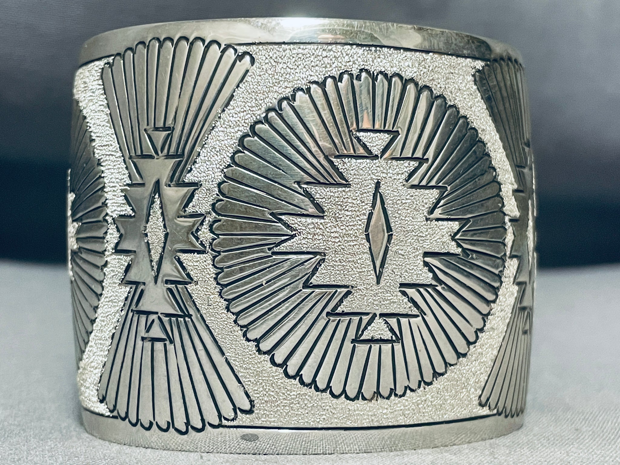This is a magnificent vintage Navajo all silver wide cuff bracelet. This remarkable bracelet contains unique and beautiful hand carved silver concho patterns that rest from one end of the cuff to the other. The stamped concho patterns are just spectacular and so precise with center hand carved pueblo patterns. The multiple textures on this cuff is just phenomenal and so amazing as well as the workmanship. The width of the bracelet measures around 2". Signed by Navajo artist, T. Sterling silver, marked. The inside end to end measures around 5-1/2" with an additional 3/4" gap. Sturdy 68 grams.