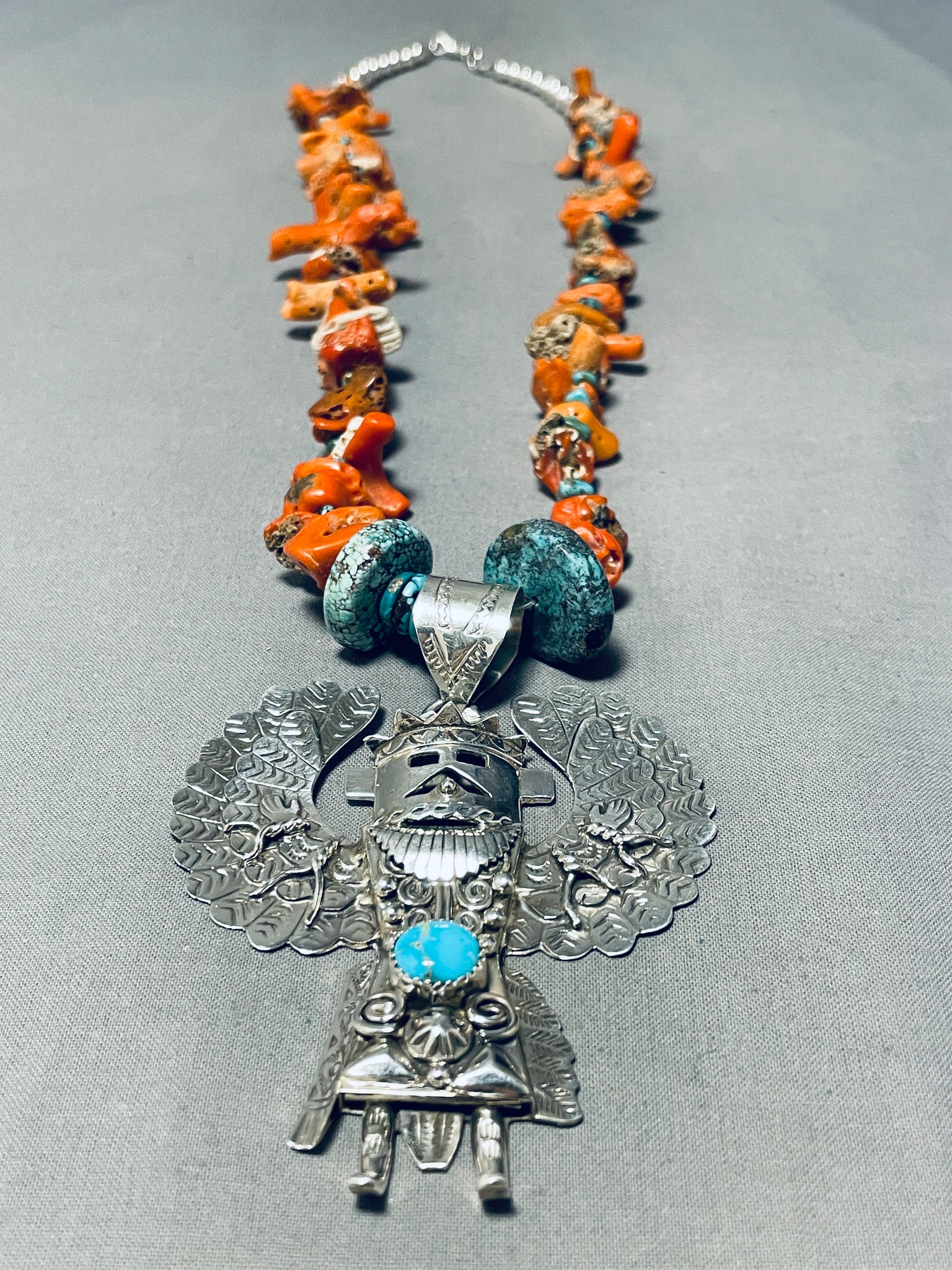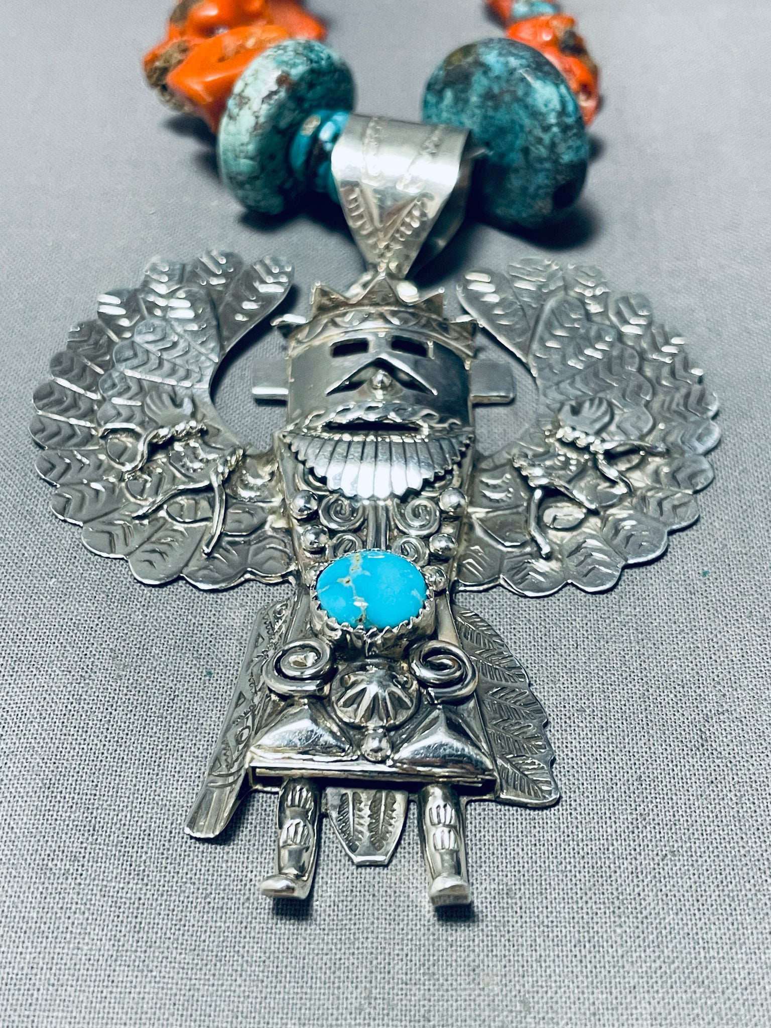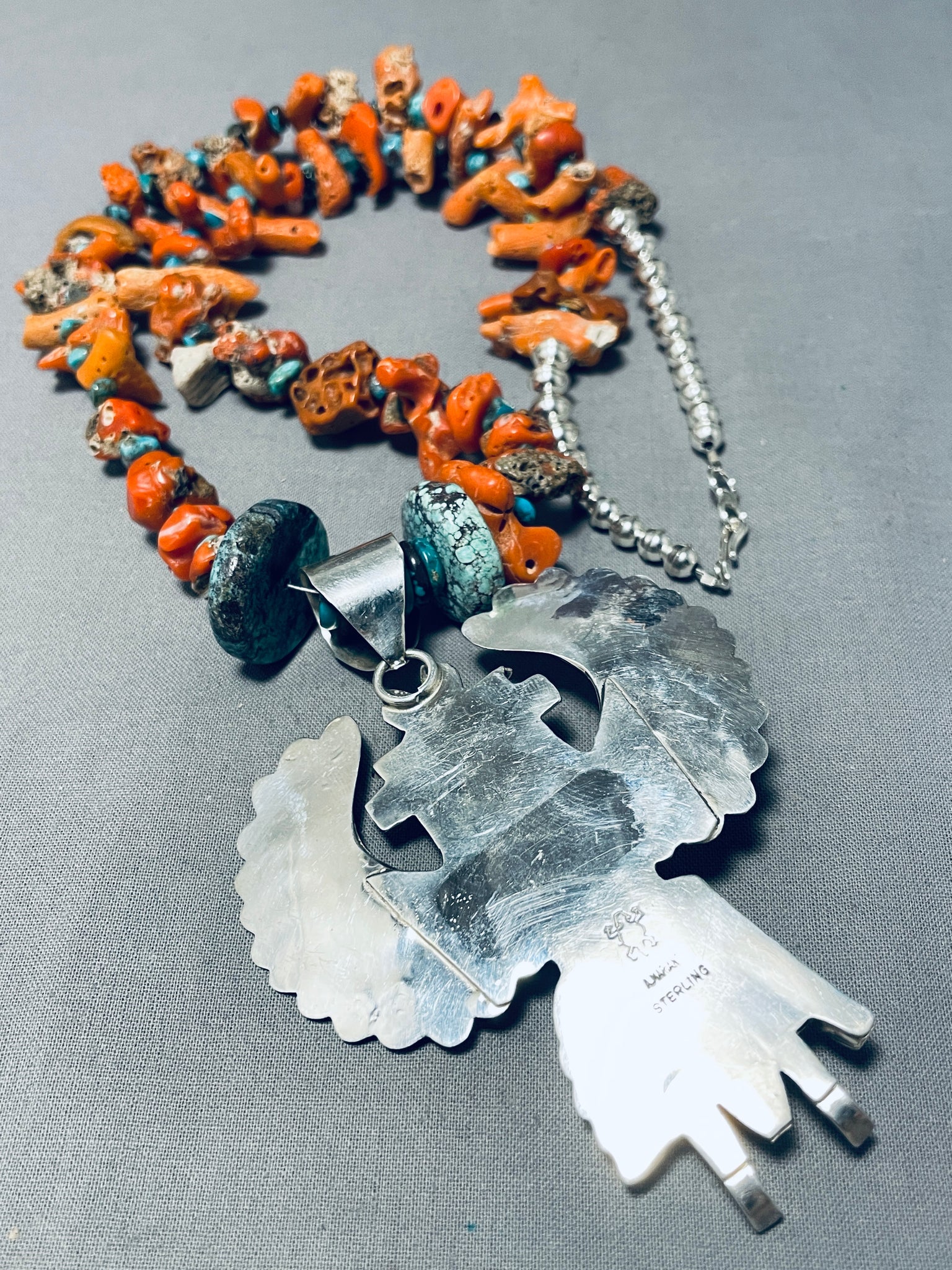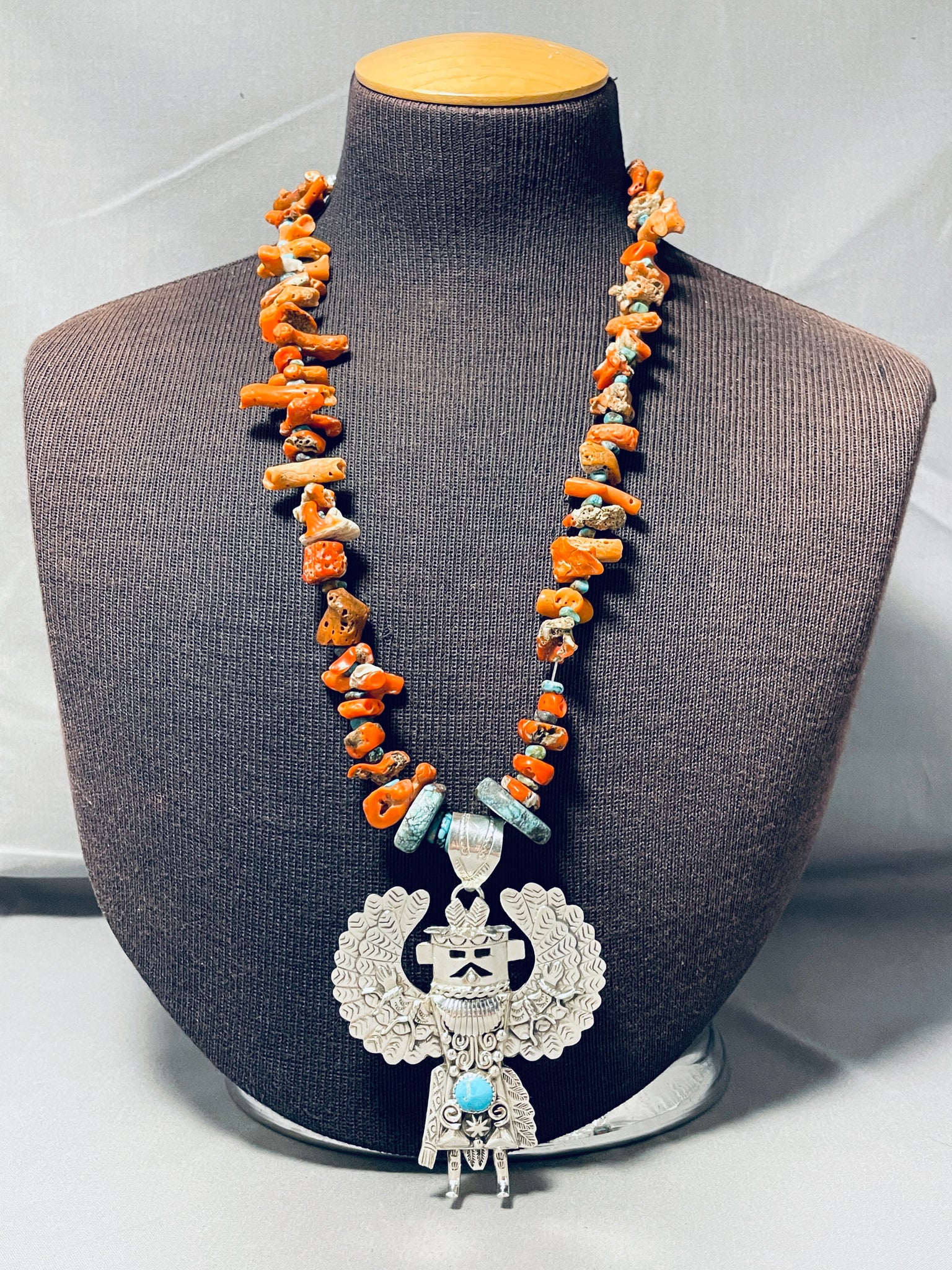 Huge Coral Chunk Native American Navajo Sterling Silver Kachina Doll Necklace
