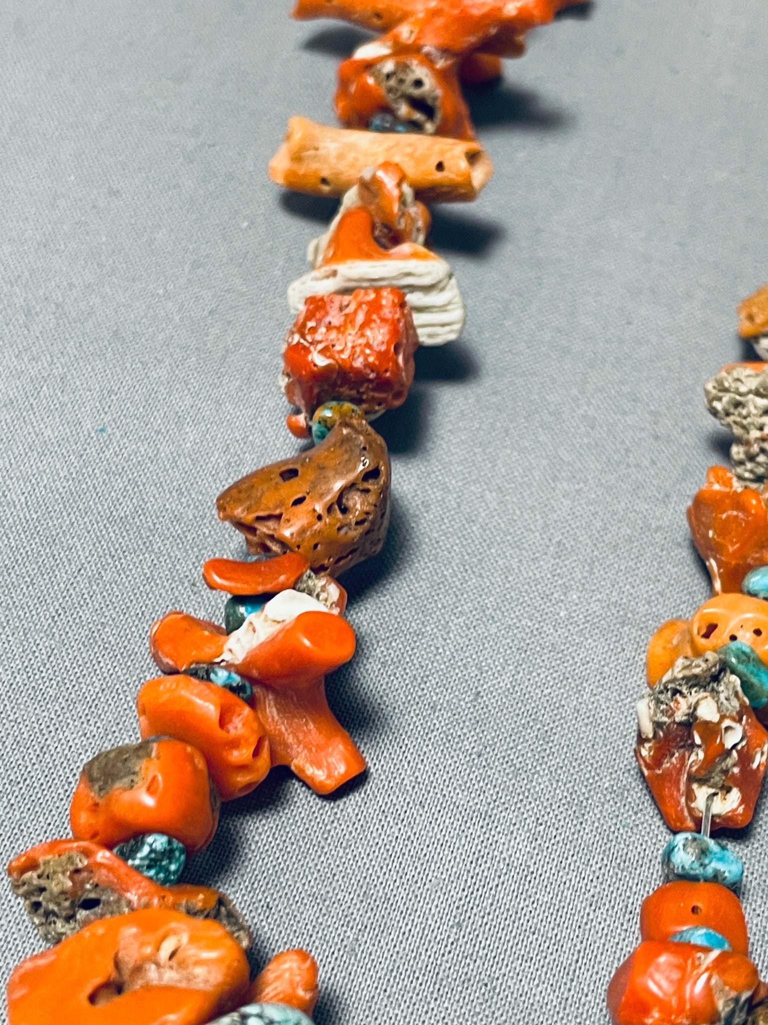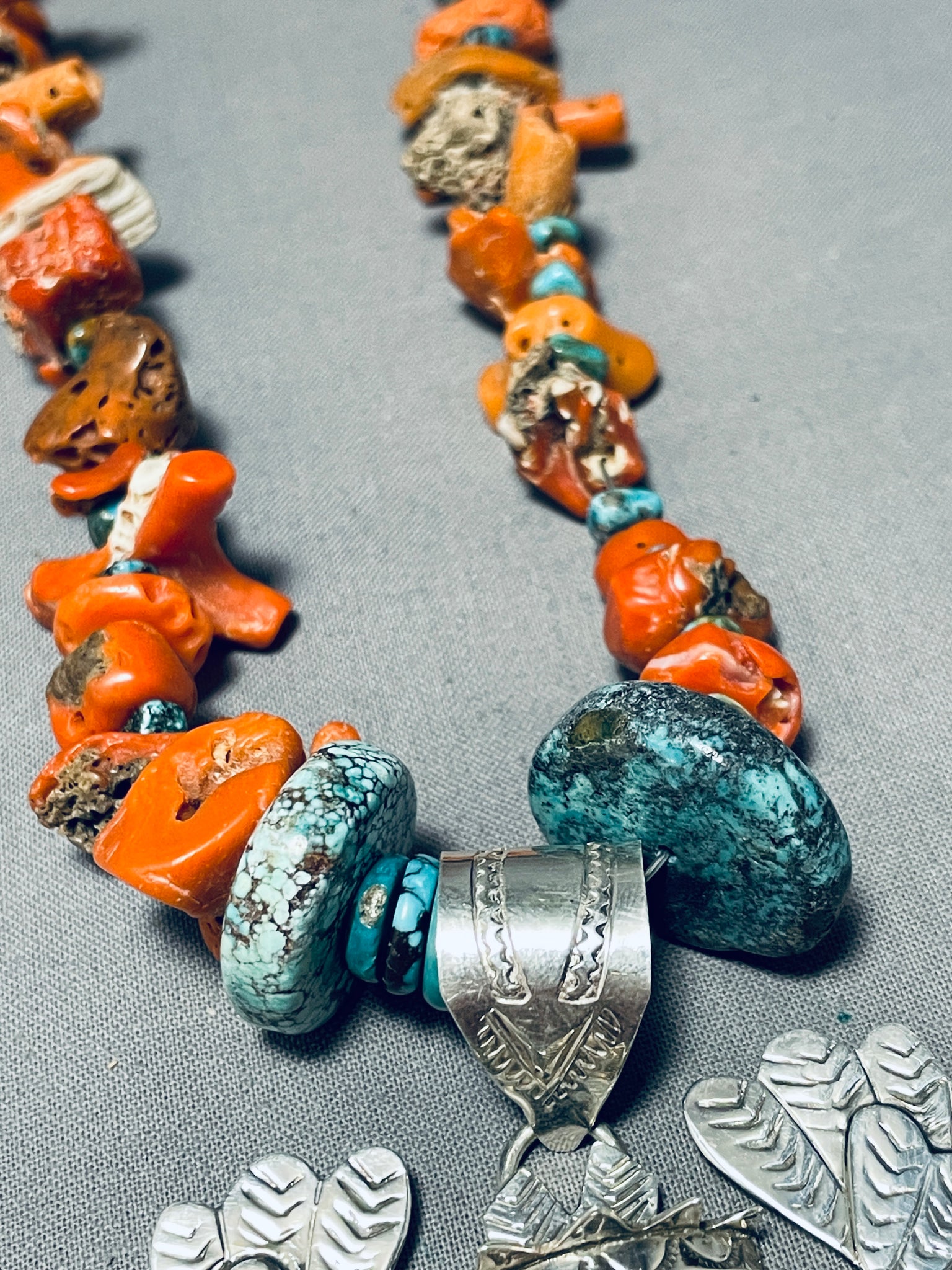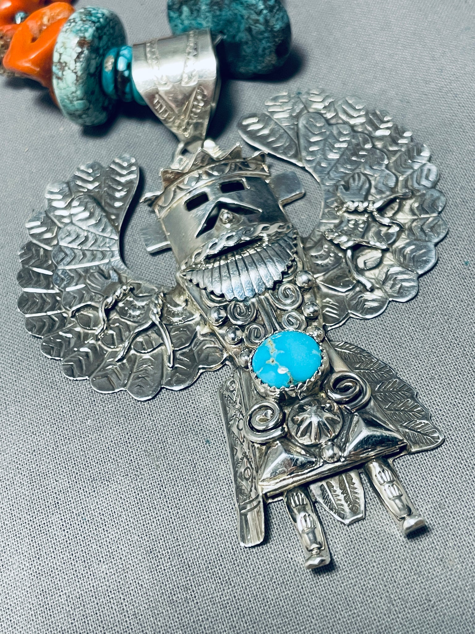 Huge Coral Chunk Native American Navajo Sterling Silver Kachina Doll Necklace