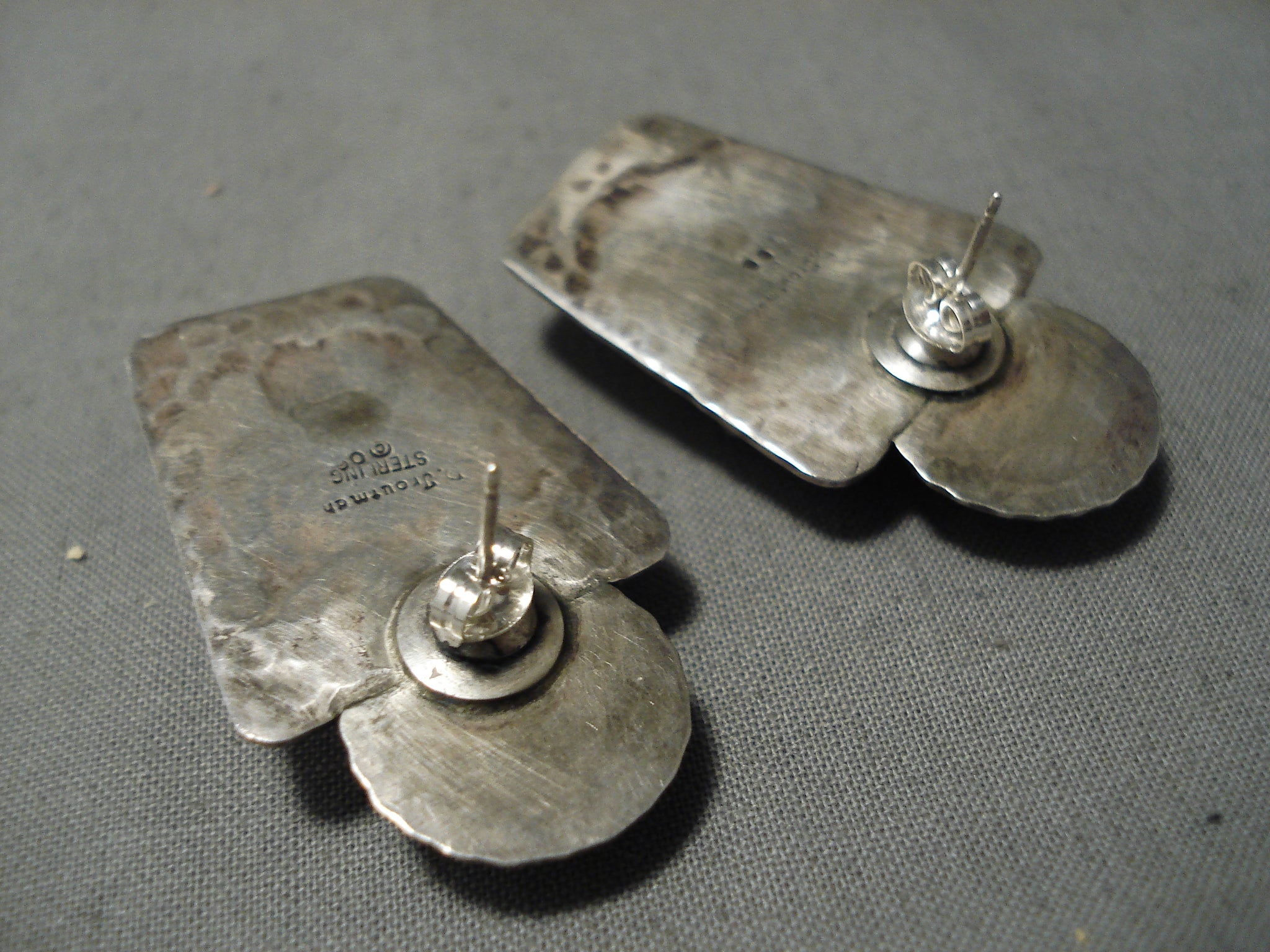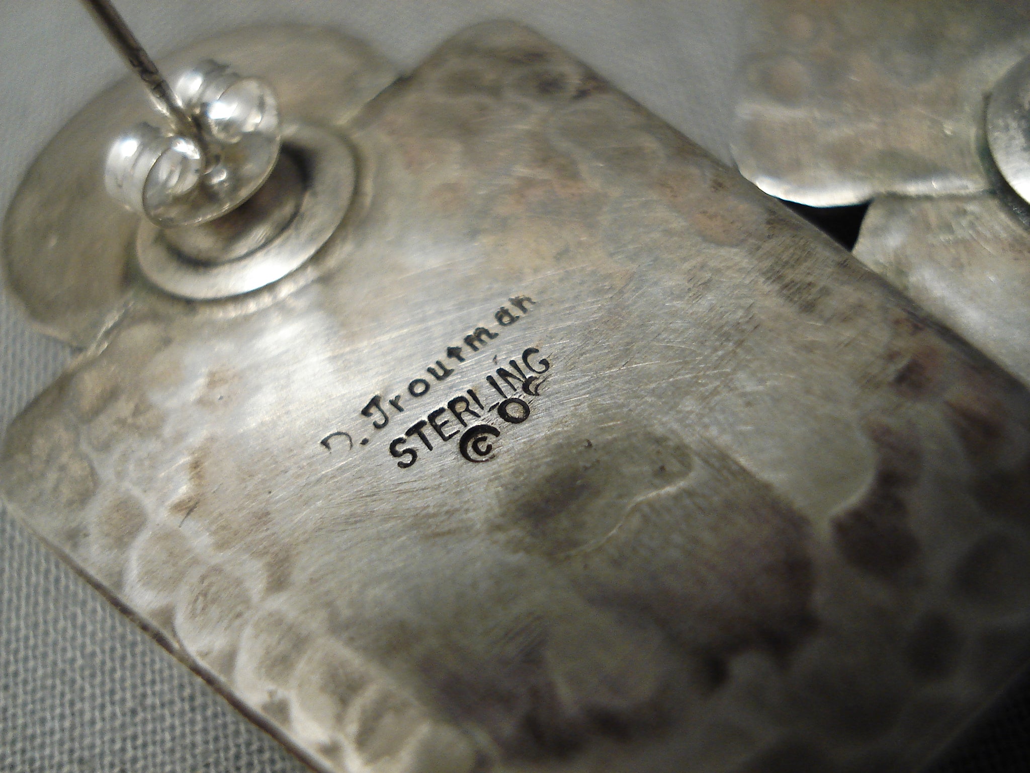 This is a remarkable vintage Navajo large silver earrings. Each earring appears to look like a cactus with a large accenting cactus shaped turquoise stone that measures around 5/8" X 1/2". Located around the stones are incredible silver stampings. Each earring measures around 1-1/2" X 1". Sterling silver, marked. Signed by Navajo artist, Dave Troutman . Cir. 1970's+. The earrings weigh around 20 grams.