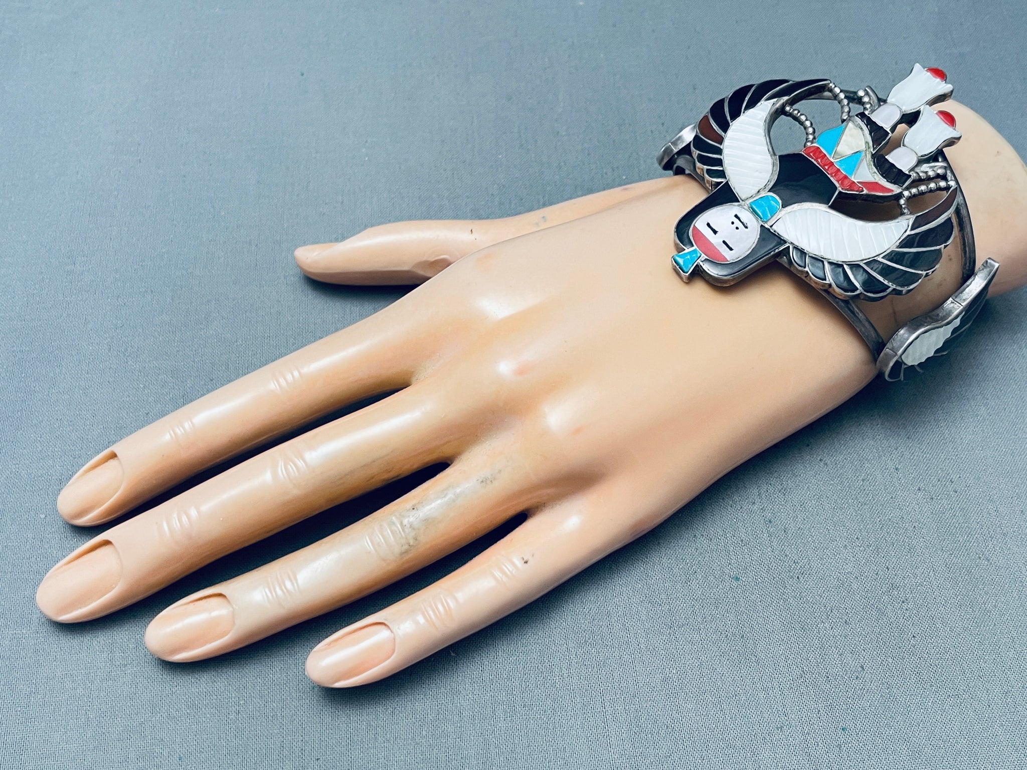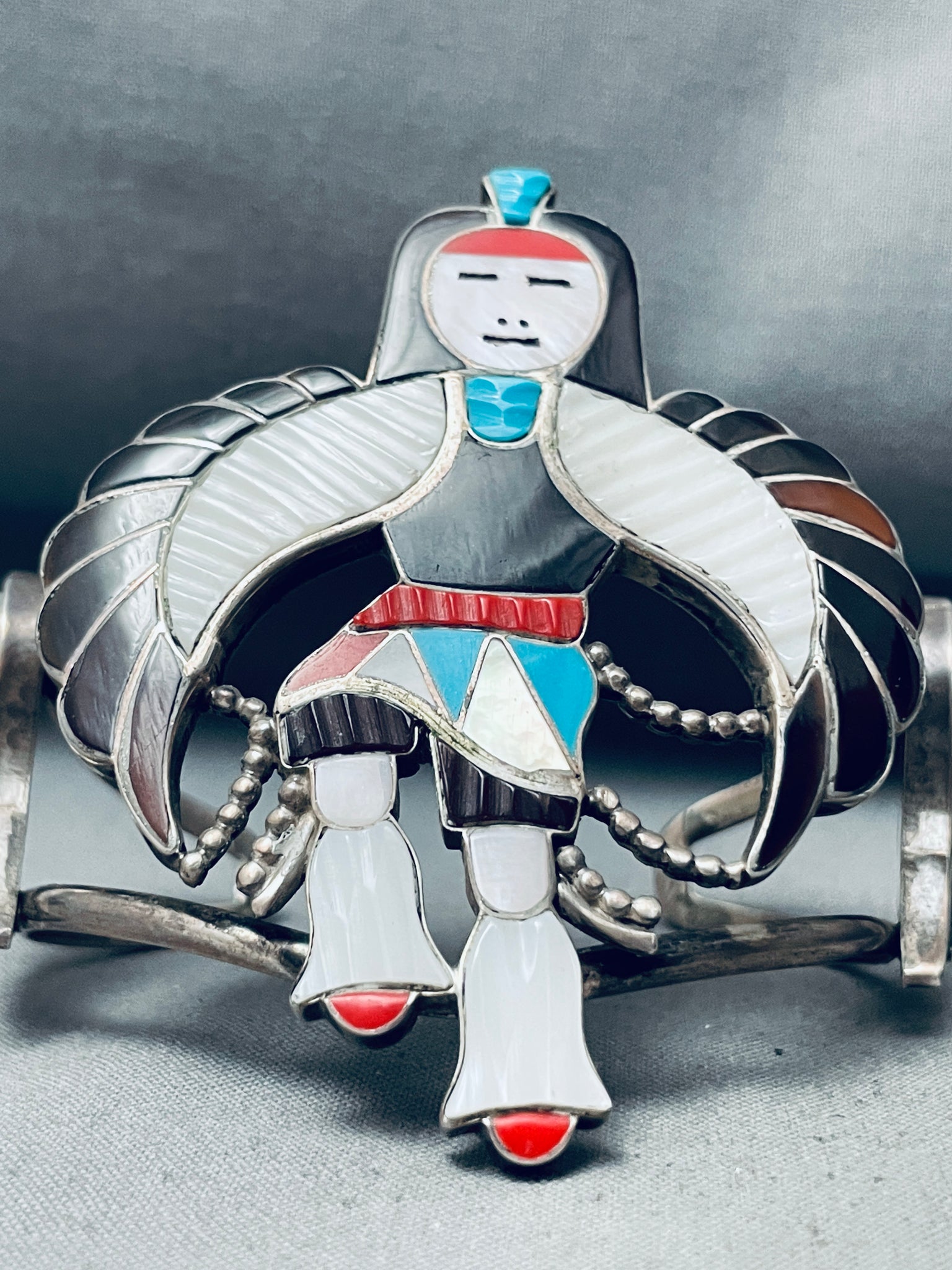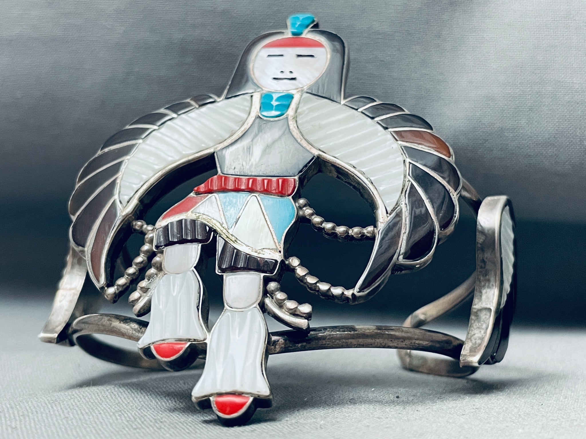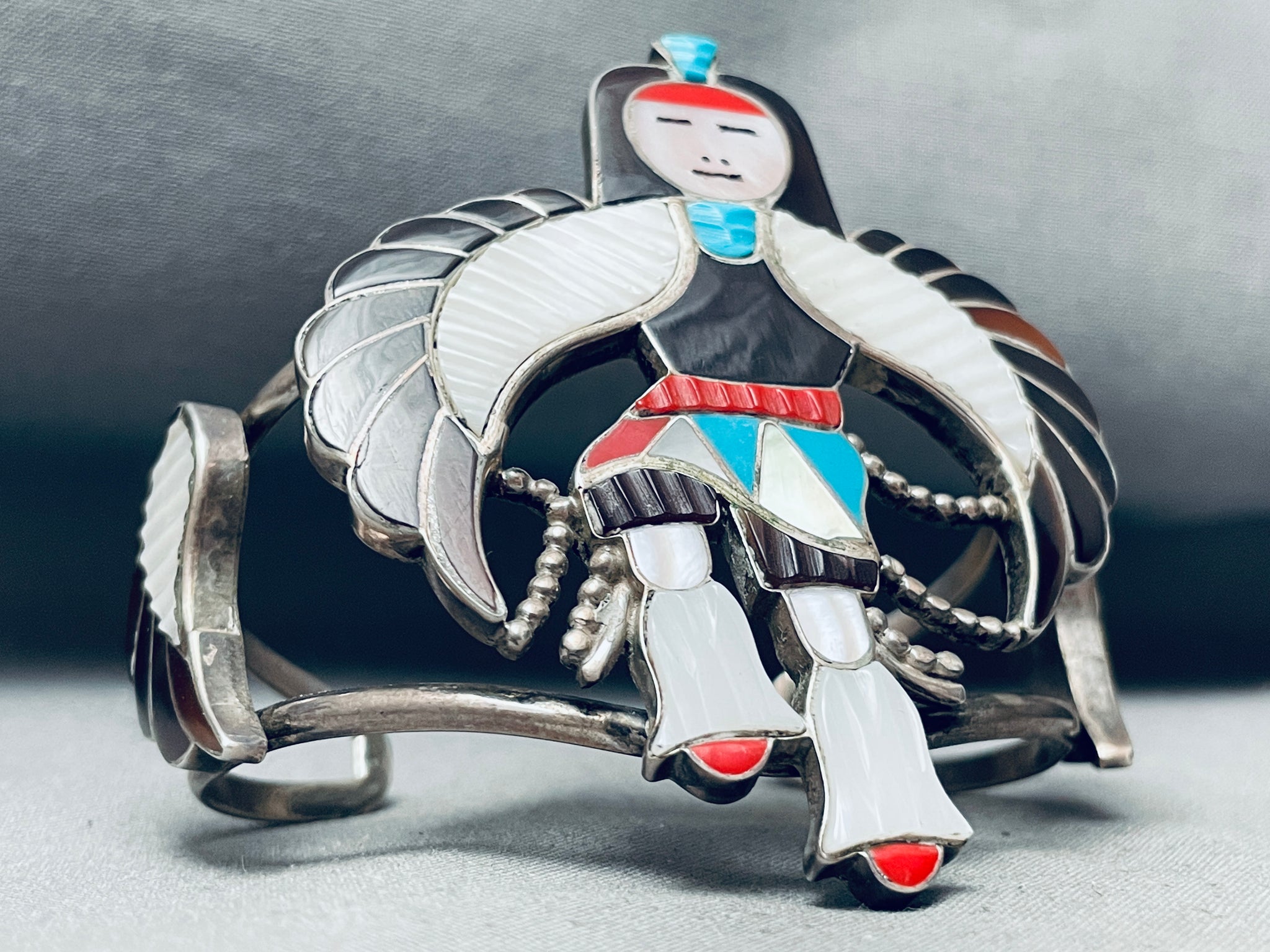 Huge Eagle Dancer Vintage Native American Zuni Turquoise Inlay Sterling Silver Bracelet