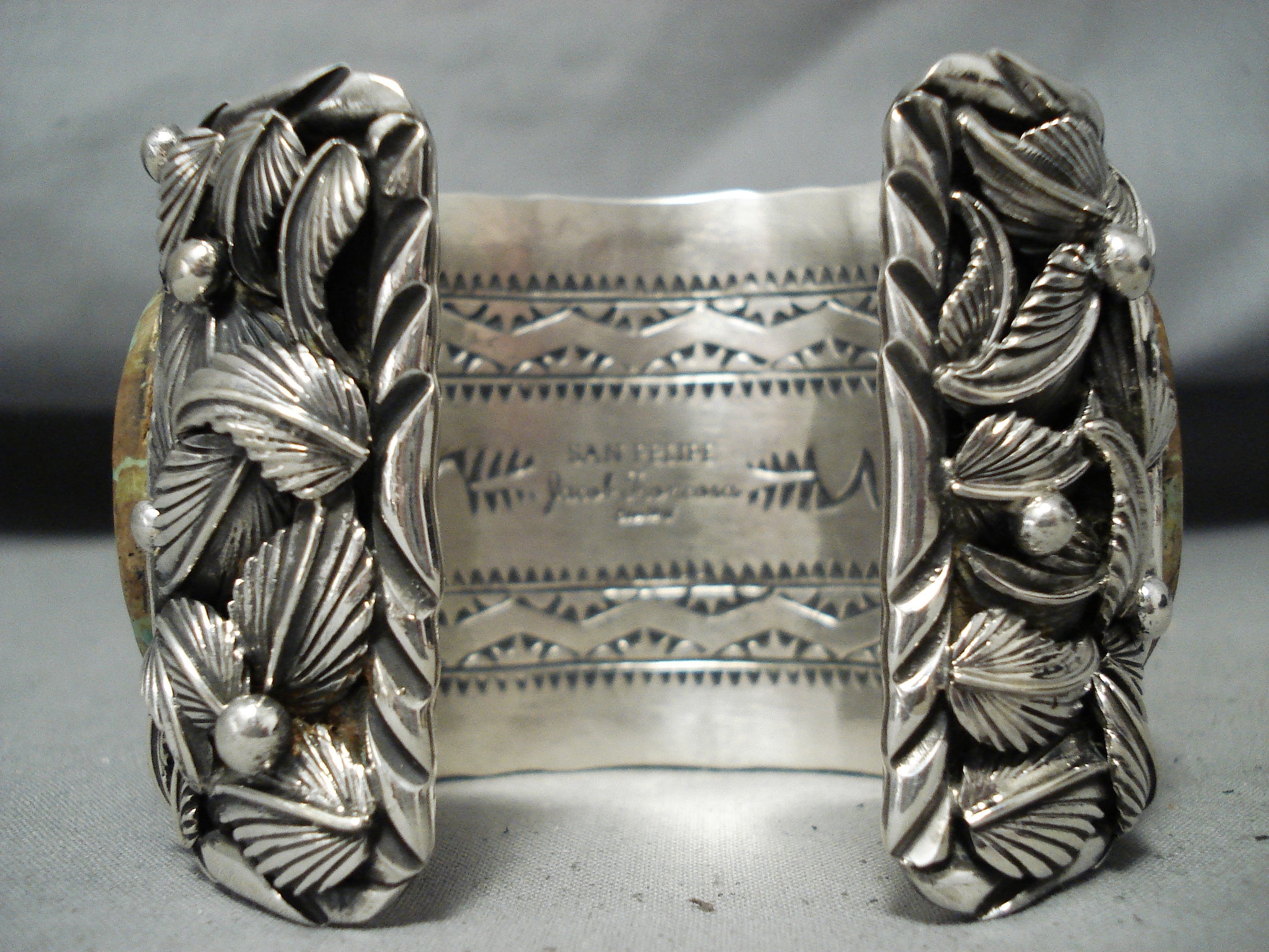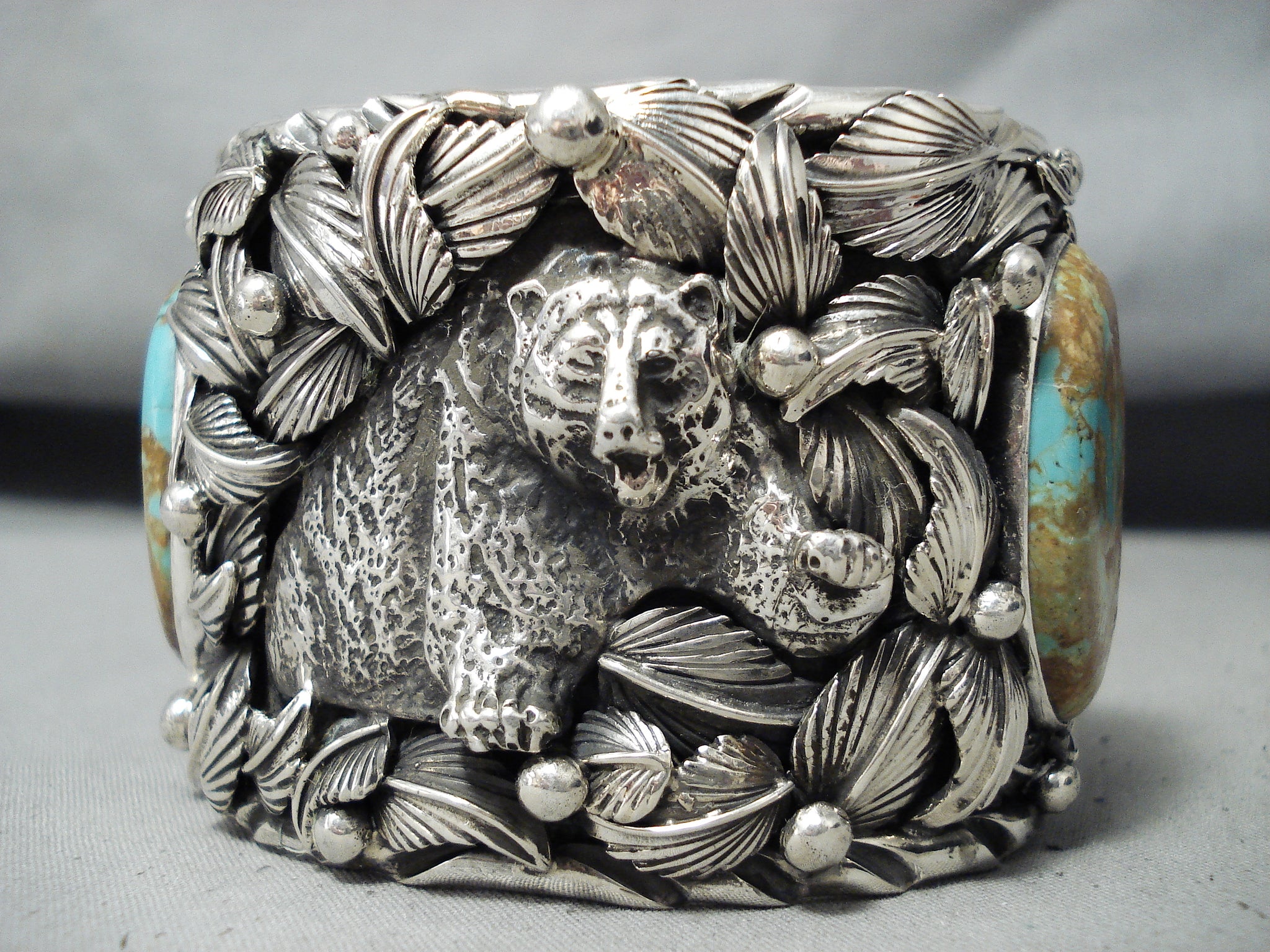 We are proud to offer this striking San Felipe silver bracelet. Nestled among a marvelous array of silver leaves and beads, this superior wide cuff has a large oval Royston turquoise stone set at each of the sides - and at the center is the realistic dimensional bear as it's emerging from its cave! So Cool! The stones measure around 1-3/8" x 1". The width of the bracelet measures around 2-1/8". San Felipe artist Jake Froncosa. Sterling silver, marked. The inside end to end measures around 6" with an additional 1-1/8" gap. Sturdy 174 grams.