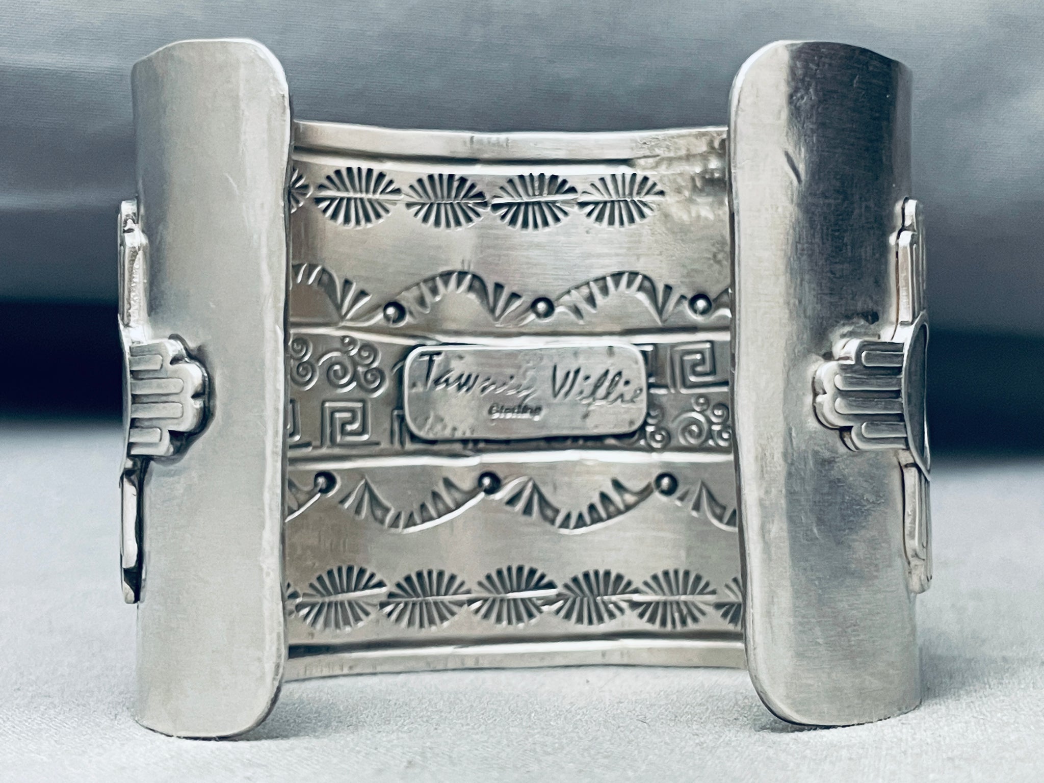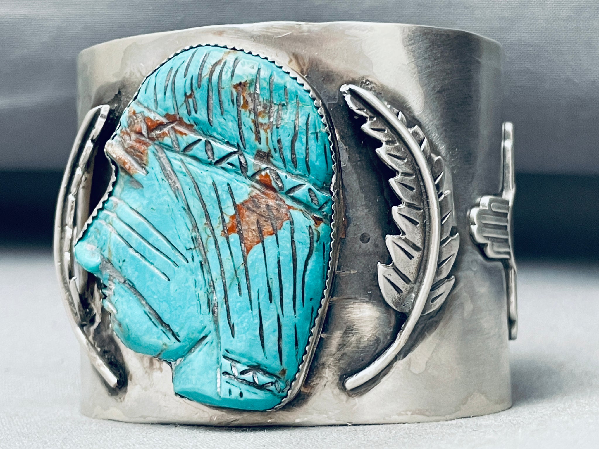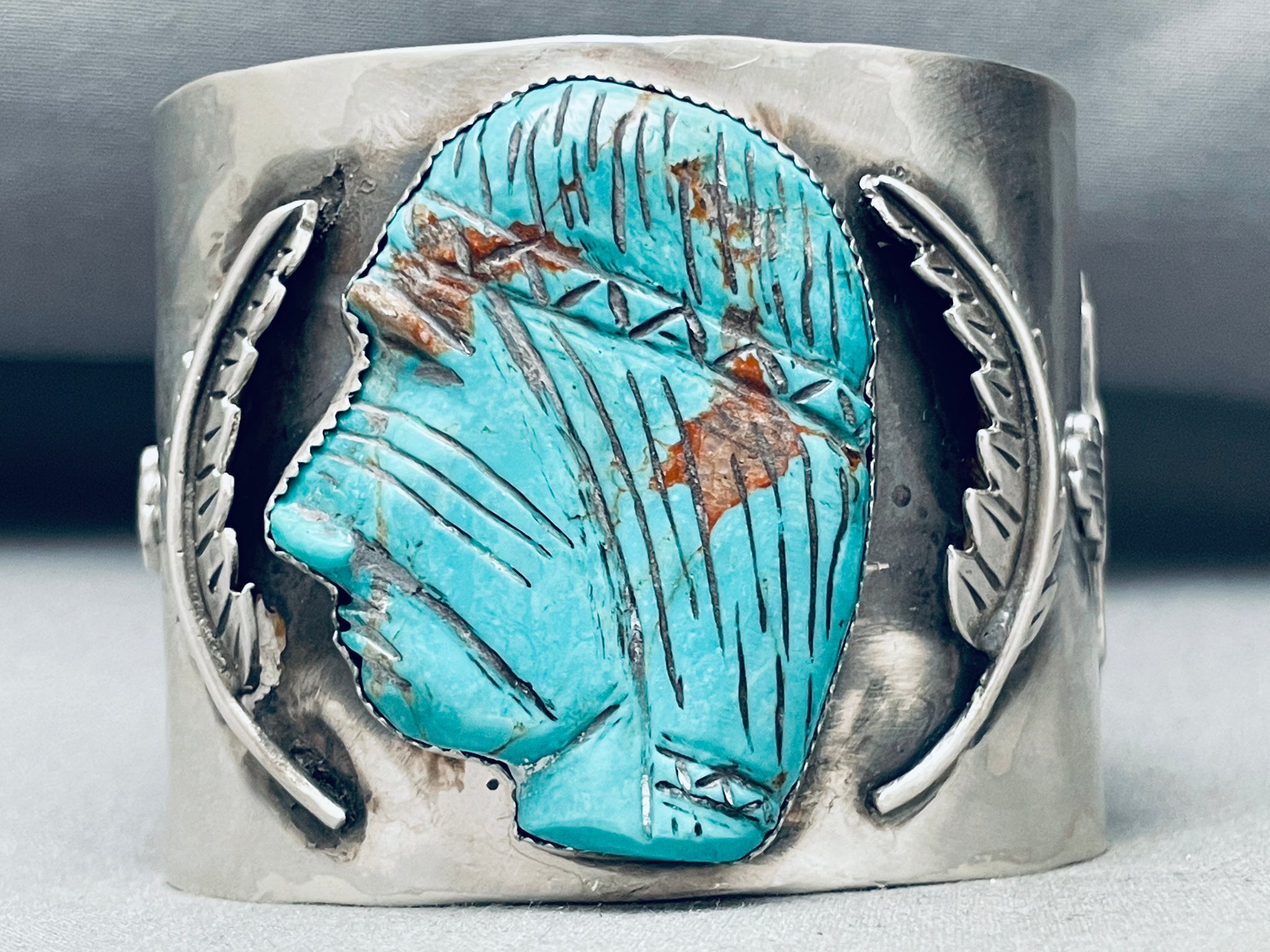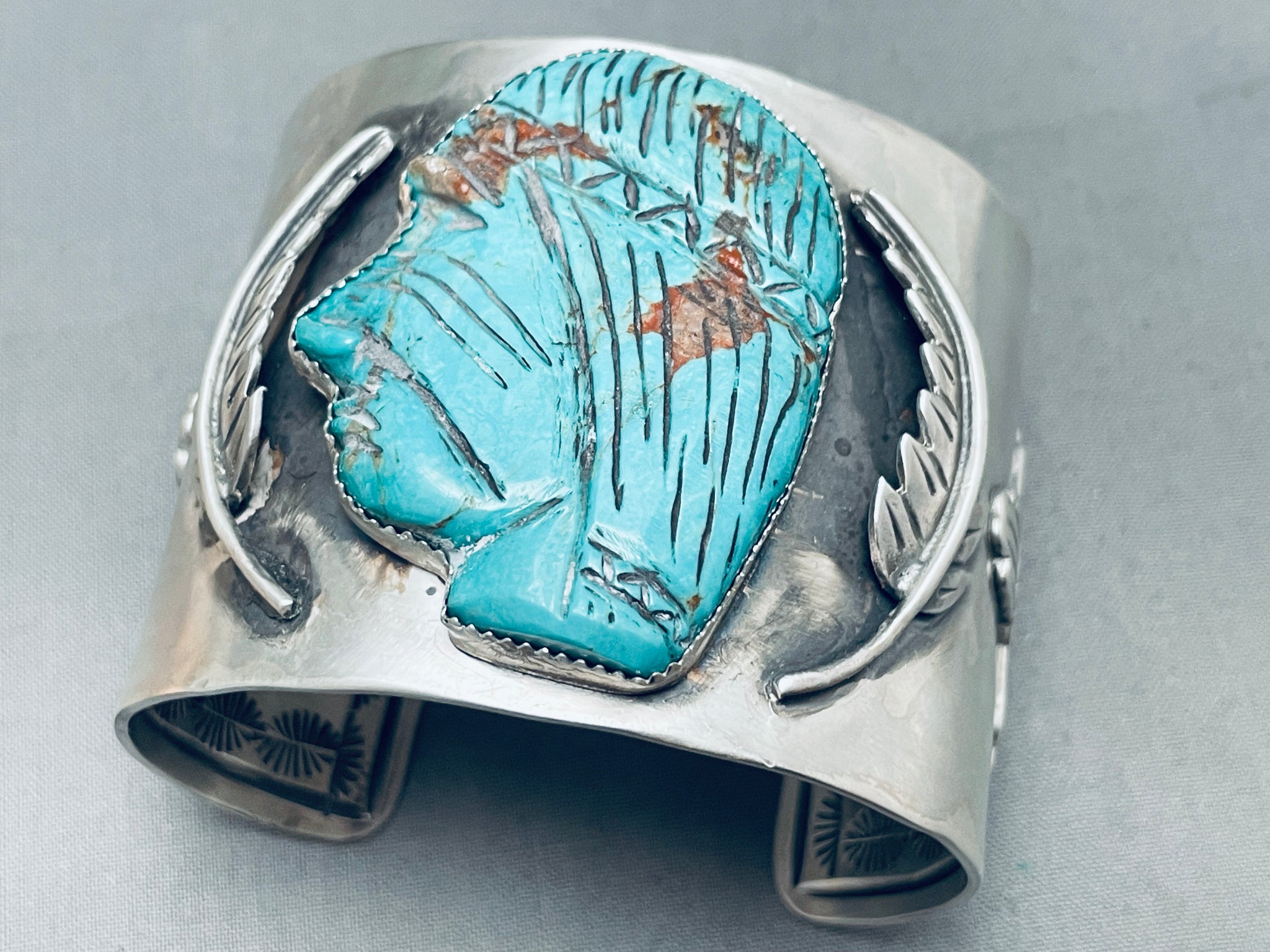 Huge Hand Carved Indian Head Native American Navajo Sterling Silver Bracelet