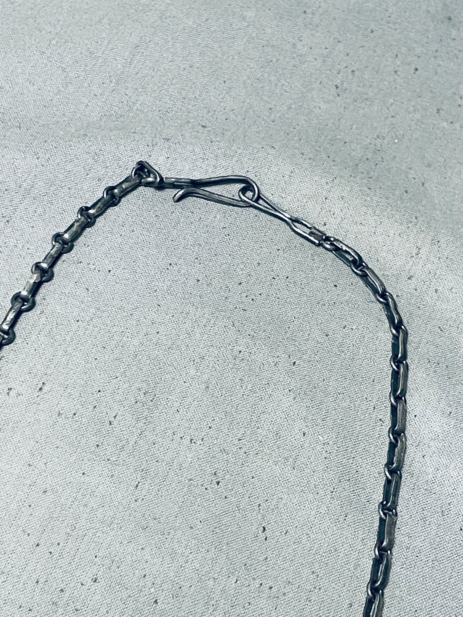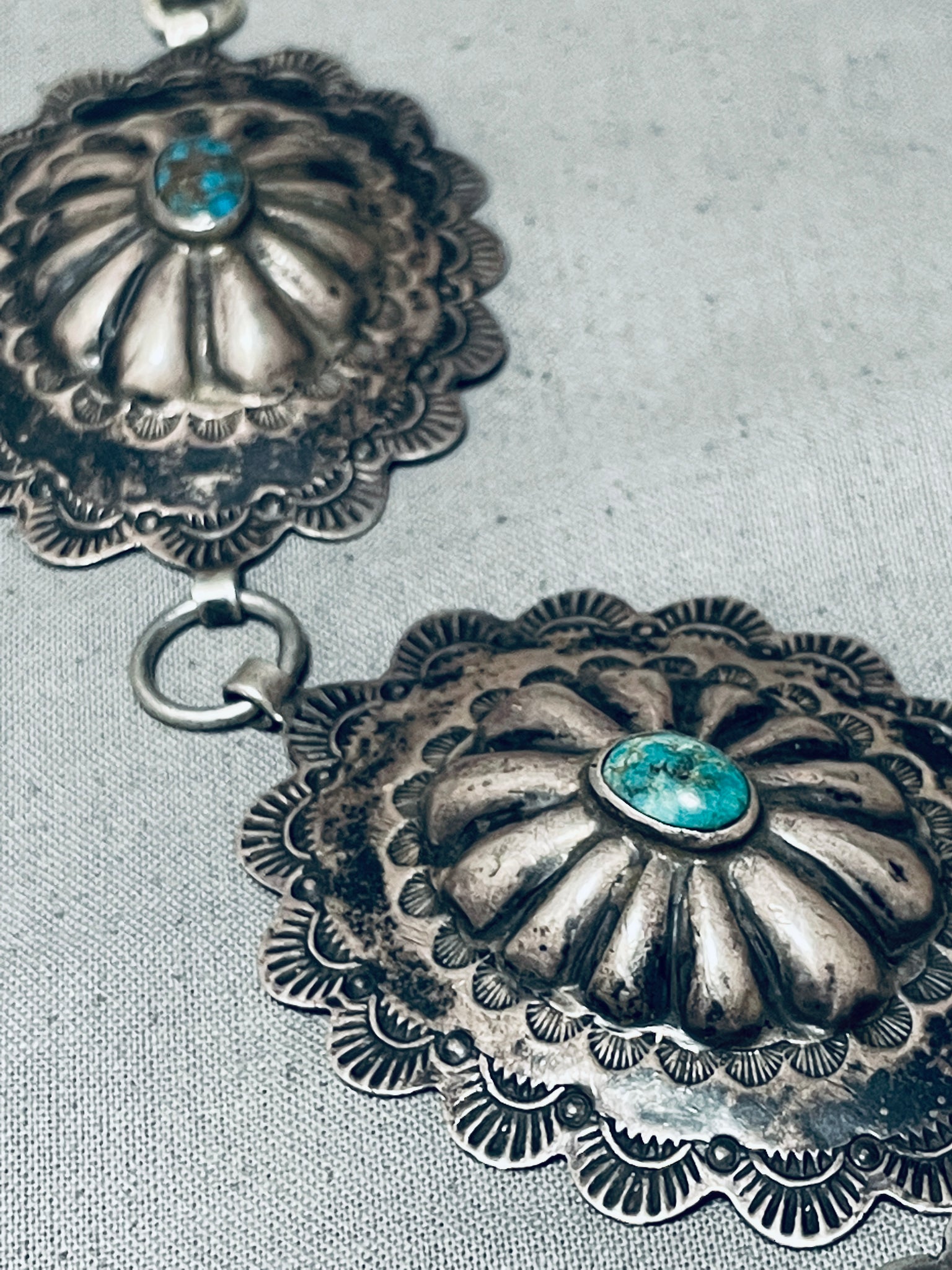 This is an incredible vintage Navajo turquoise and silver concho necklace. This phenomenal necklace contains five outstanding handmade large repoussed silver conchos with the largest bottom concho pendant measuring a whopping 3-5/8" X 3". Situated in the center of each concho is a beautiful turquoise stone that appears to be from both the Royston and Bisbee turquoise mine. I absolutely love the surrounding silver works that consist of sun bursting patterns, line segments, plants and sun stampings. This necklace contains a wonderful handmade silver link chain with a traditional silver clasp. Located throughout the entire necklace is stunning patina. Sterling silver. Cir. Mid century . The length of the necklace measures around 29". Sturdy 119 grams.