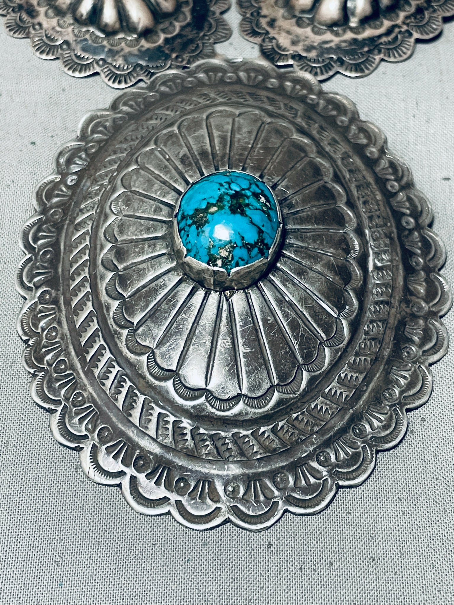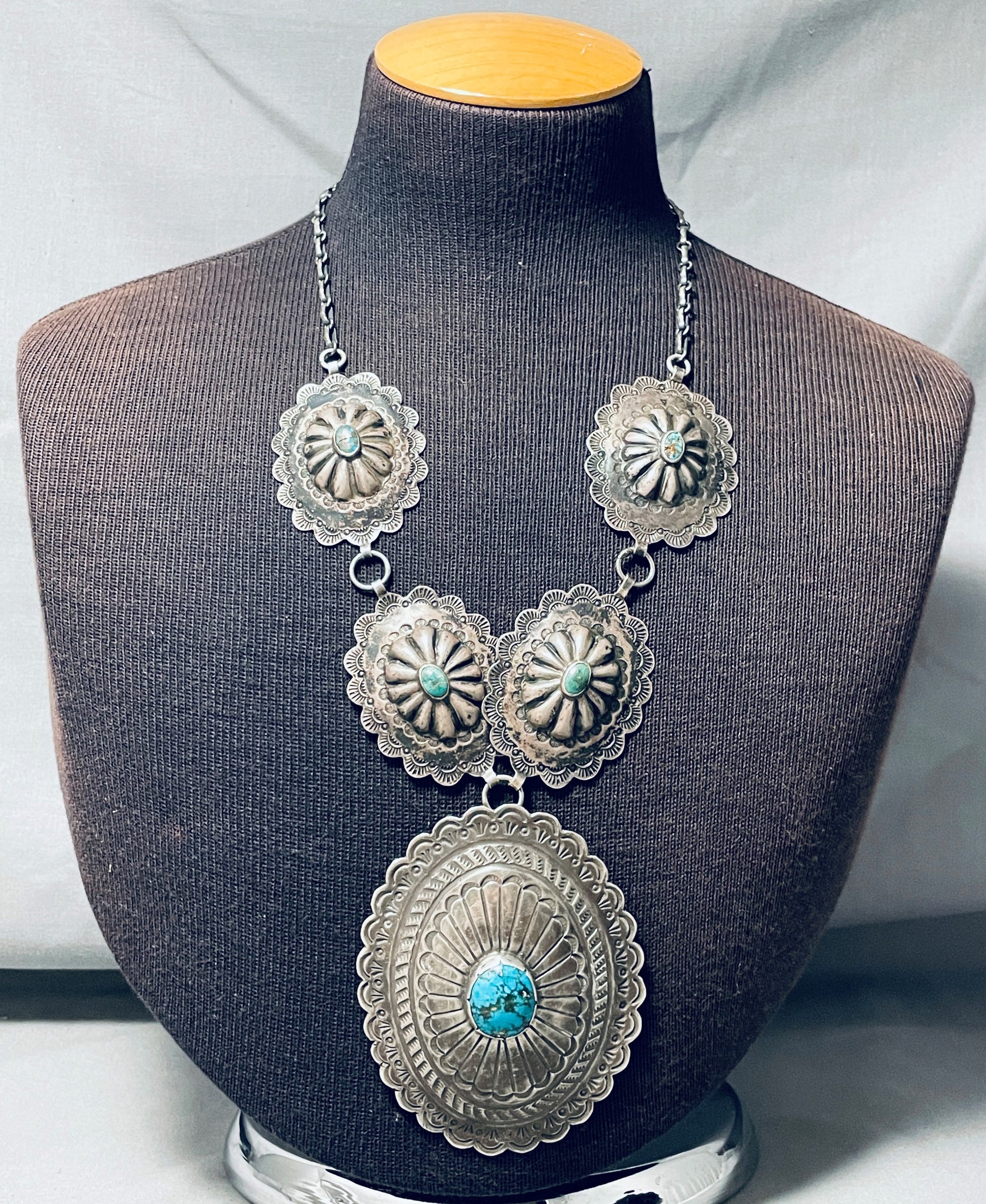 Huge Hand Tooled Vintage Native American Navajo Turquoise Sterling Silver Concho Necklace