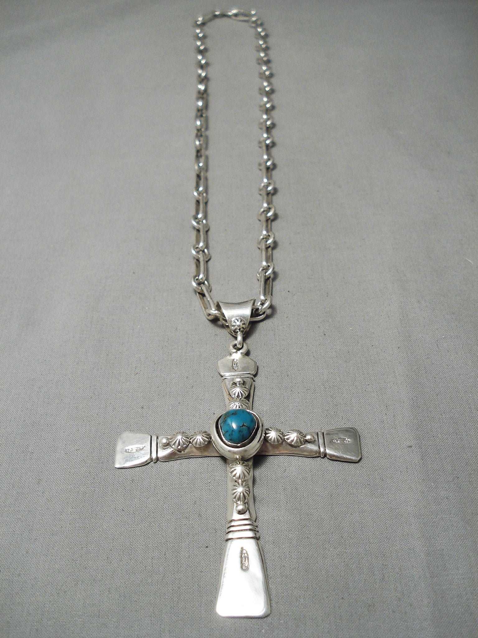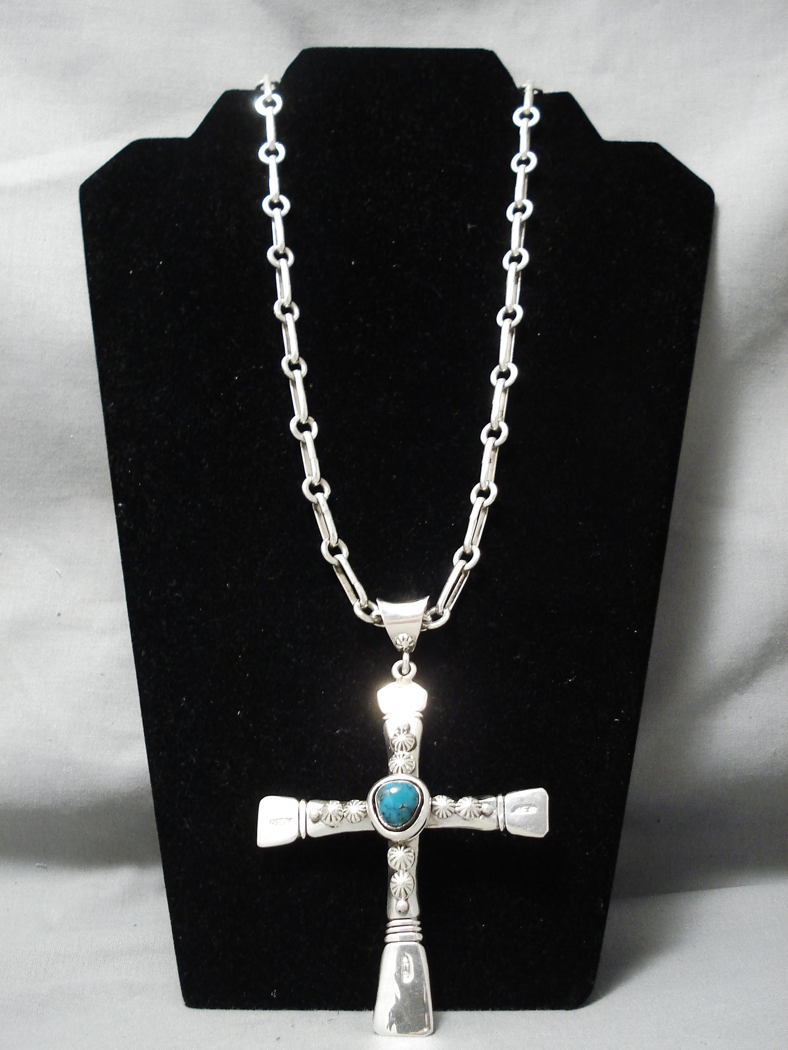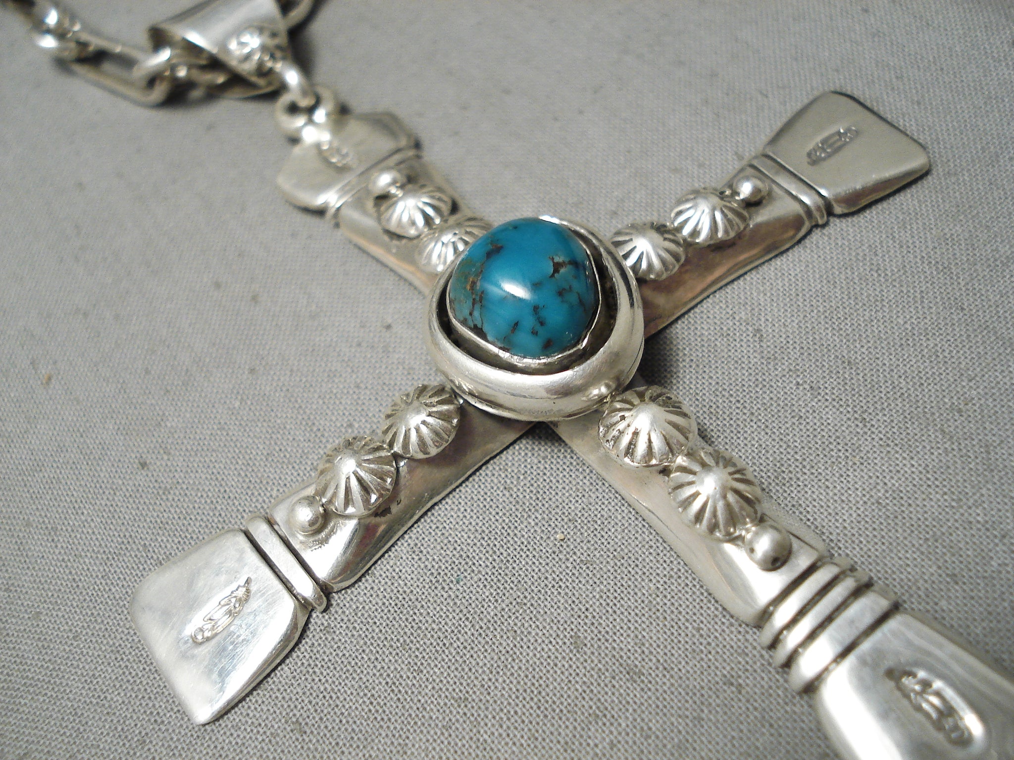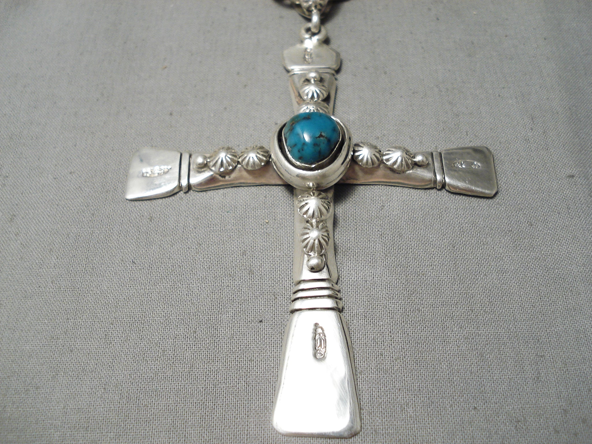 Huge Heavy 100 Gram Native American Navajo Sterling Silver Cross Turquoise Necklace