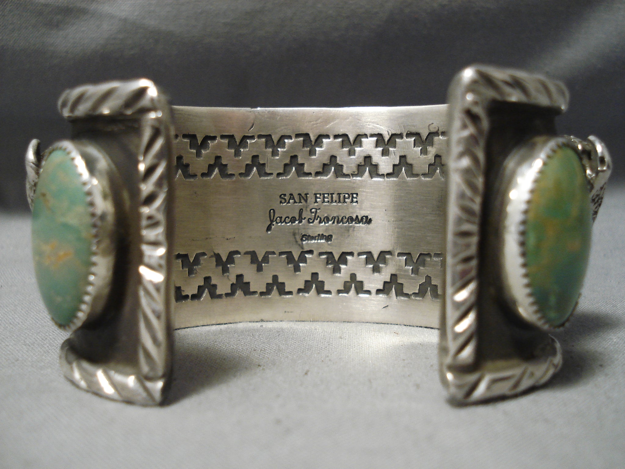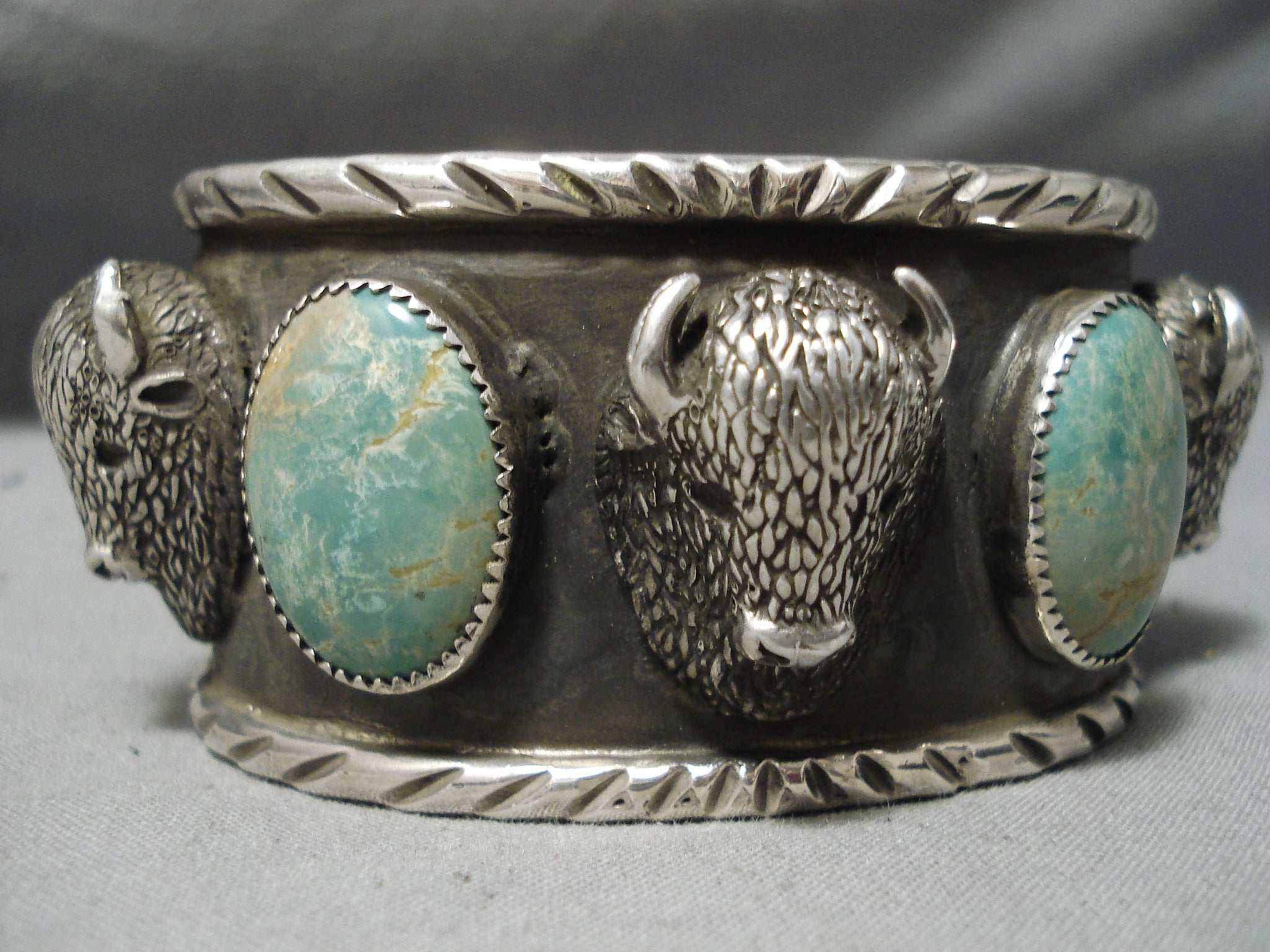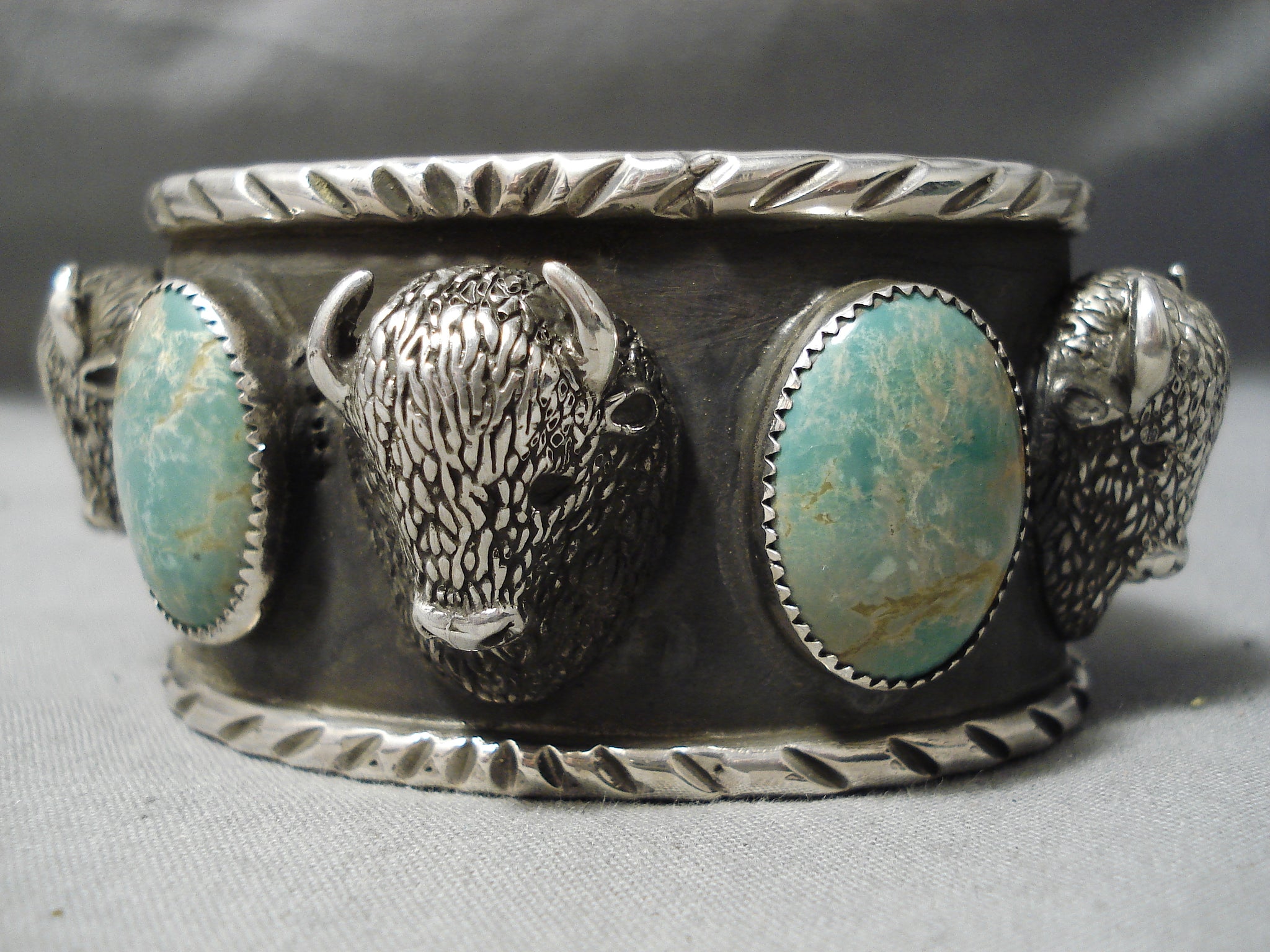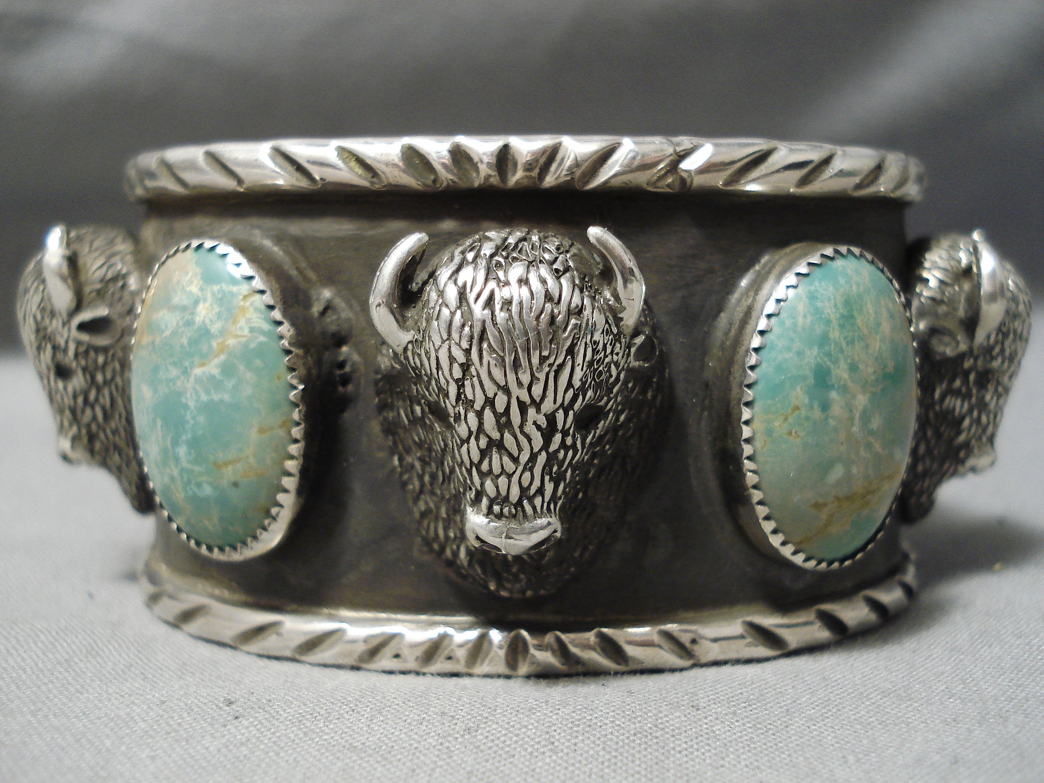 Huge Heavy Buffalo Green Turquoise Native American Sterling Silver Bracelet