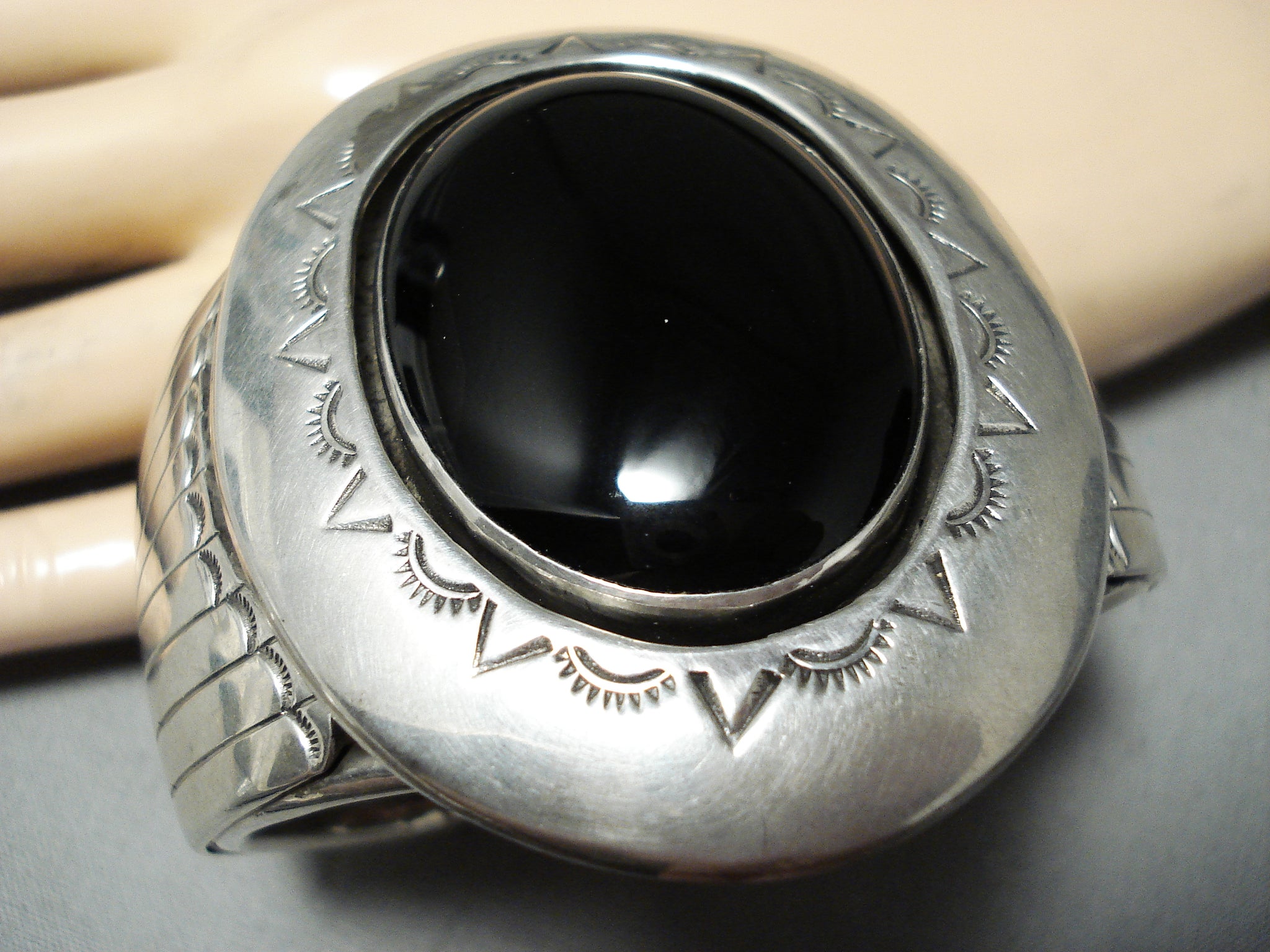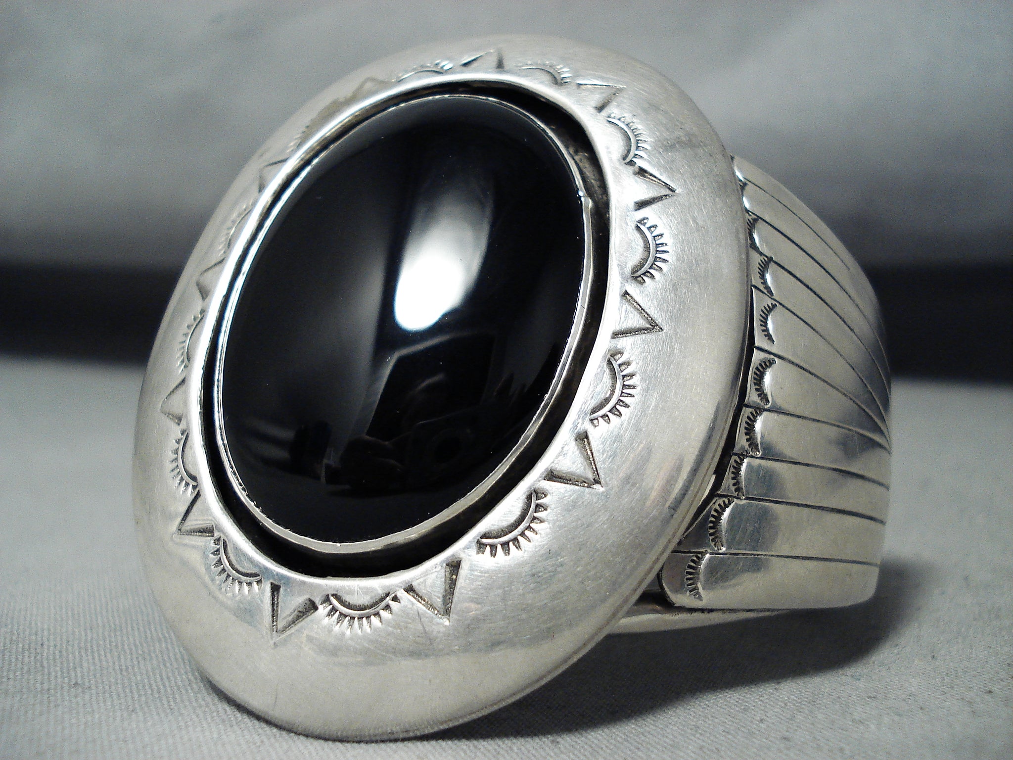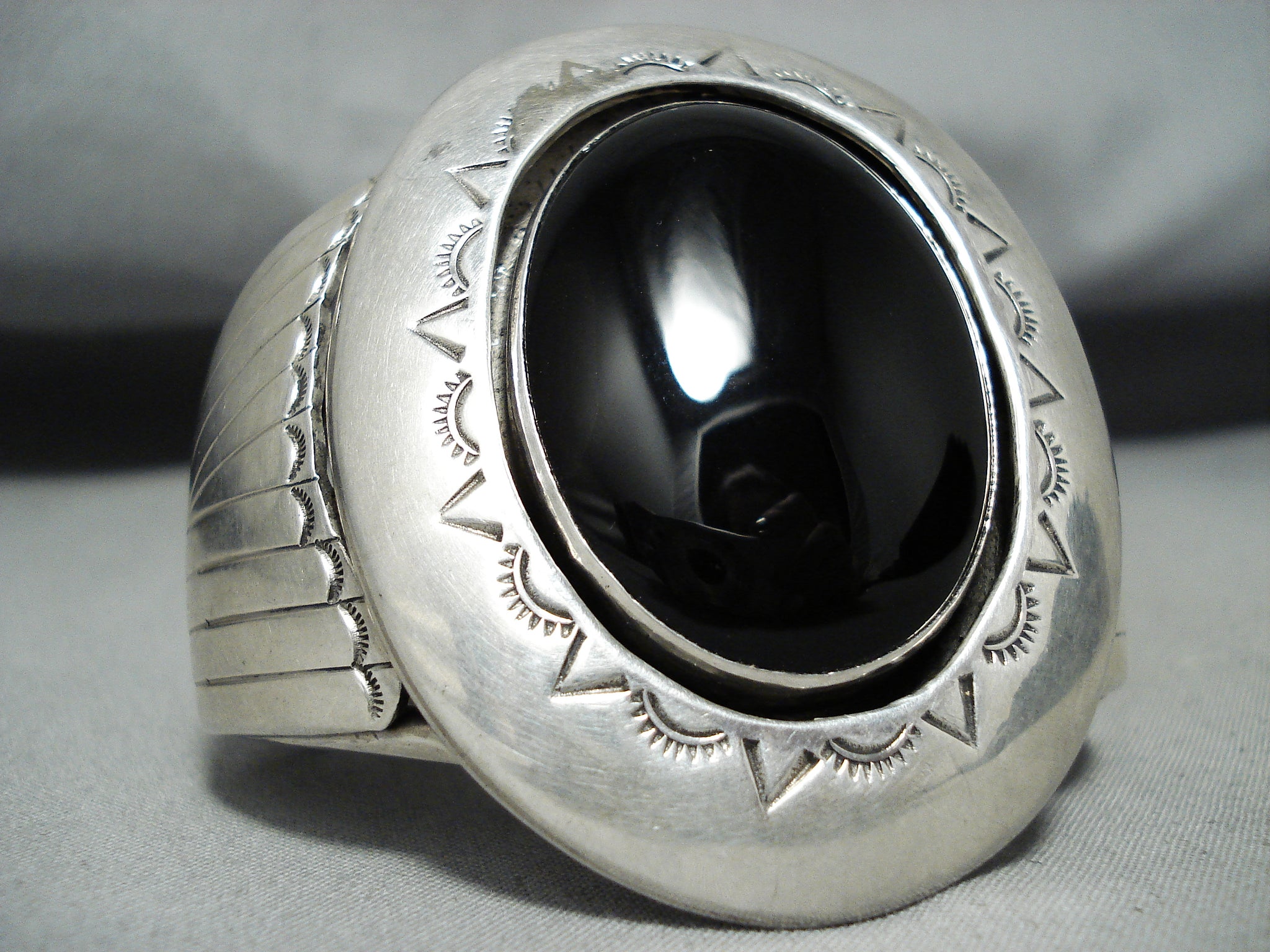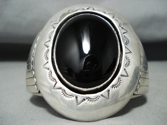 Huge Heavy Signed Vintage Native American Navajo Jet Sterling Silver Bracelet