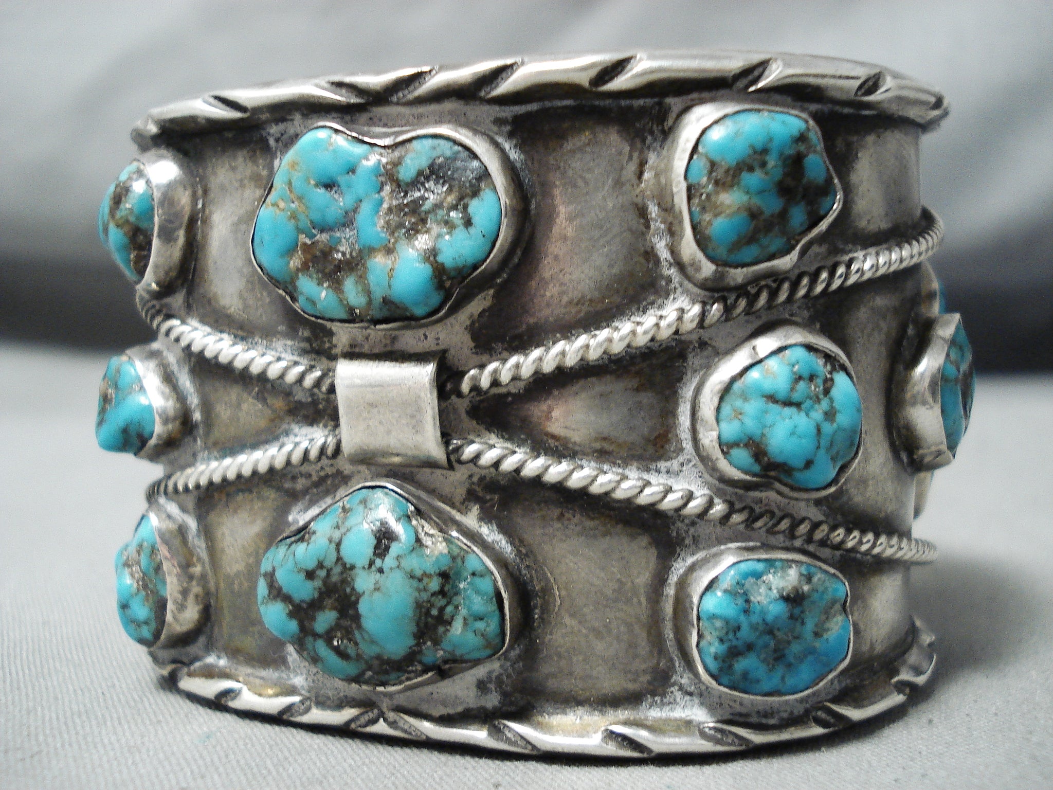 This is a magnificent vintage Navajo wide silver bracelet. This amazing piece contains a beautiful plethora of either old Sleeping Beauty or old Morenci turquoise stones, a total of 14 stones. I love the remarkable coiled patterns that run in a huge X pattern in the center. The largest stone measures around 3/4" x 1/2". The width of the bracelet measures around 1-7/8". Sterling silver. Cir. Mid century . The inside end to end measures around 5-3/4" with an additional 1-1/4" gap. Sturdy 109 grams.