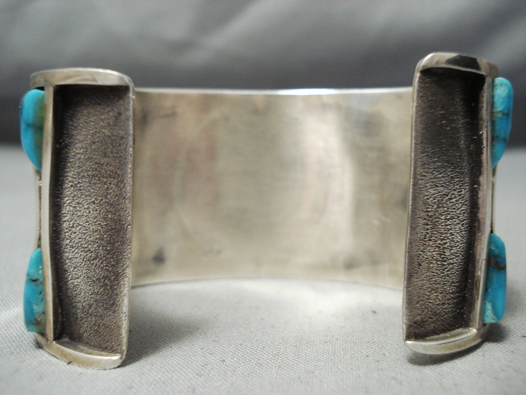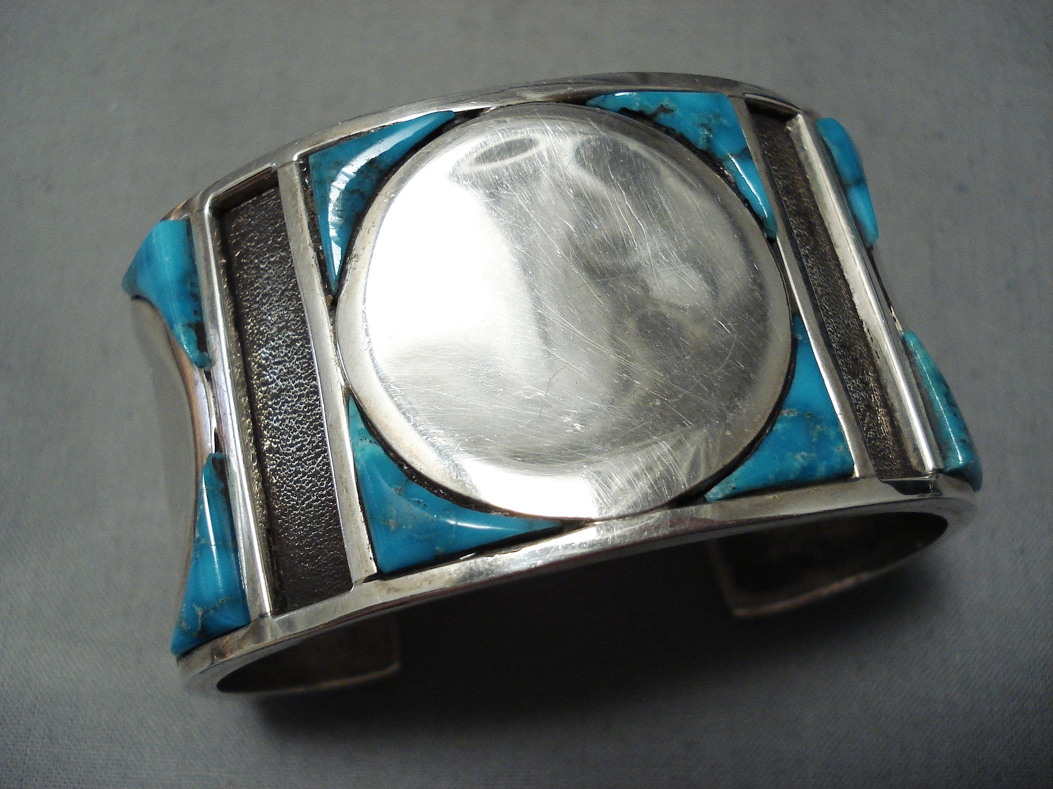 Huge Heavy Unique Vintage Native American Navajo Turquoise Inlay Sterling Silver Bracelet Old