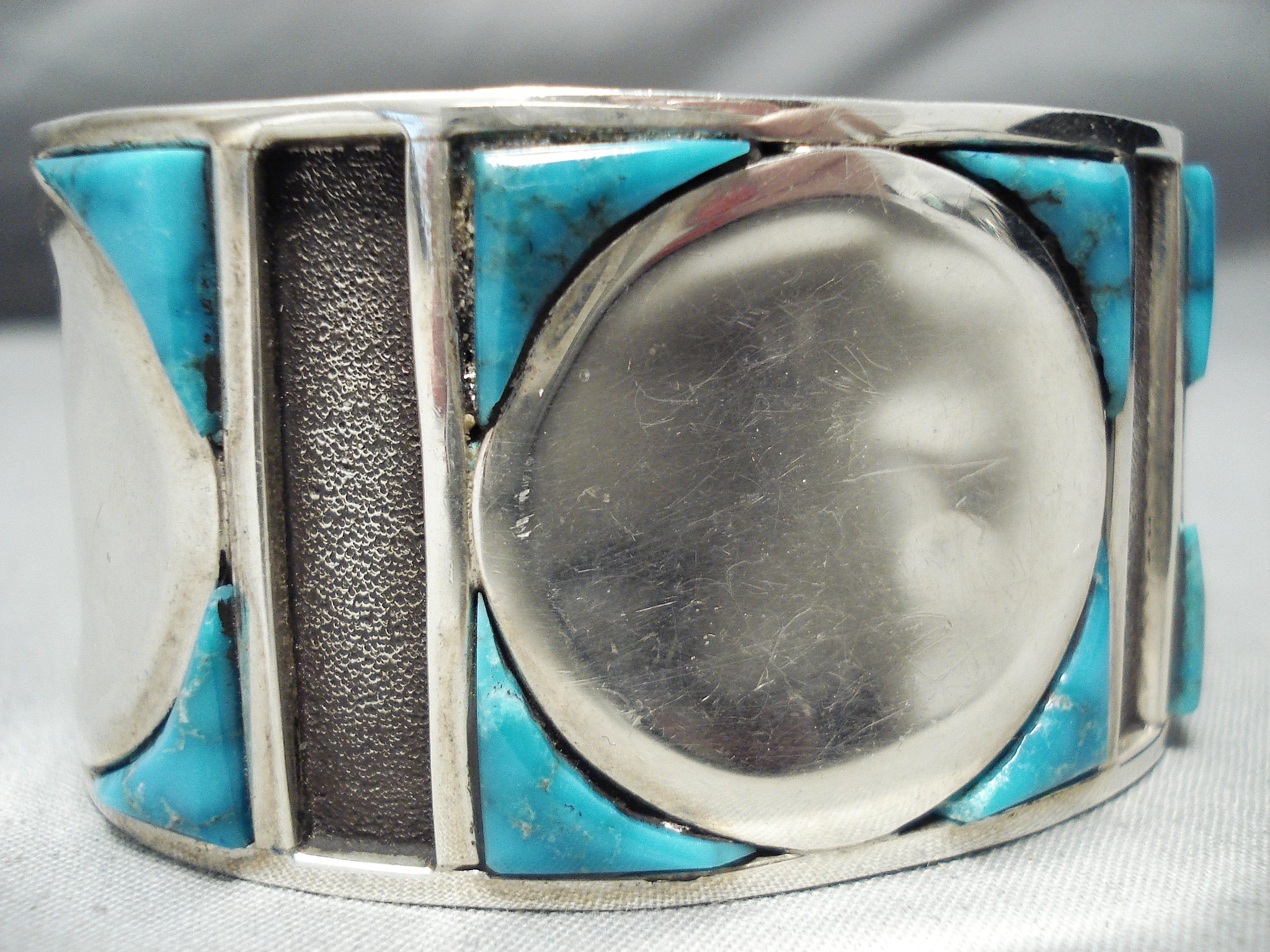 This is an incredible vintage Navajo inlaid silver bracelet. This piece contains impeccable very rare Blue Diamond turquoise stones that are beautifully inlaid that surround circular solid silver patterns. Accenting the three circular patterns are thick silver channel patterns with a textured background. This bracelet is absolutely thick and sturdy which is such a rare thing to see on pieces as these types of pieces are extremely hard to come across that are this thick. The width of the bracelet measures around 1-3/8". Sterling silver. Cir. Mid century . The inside end to end measures around 5-1/4" with an additional 1-1/4" gap. Sturdy 95 grams.
