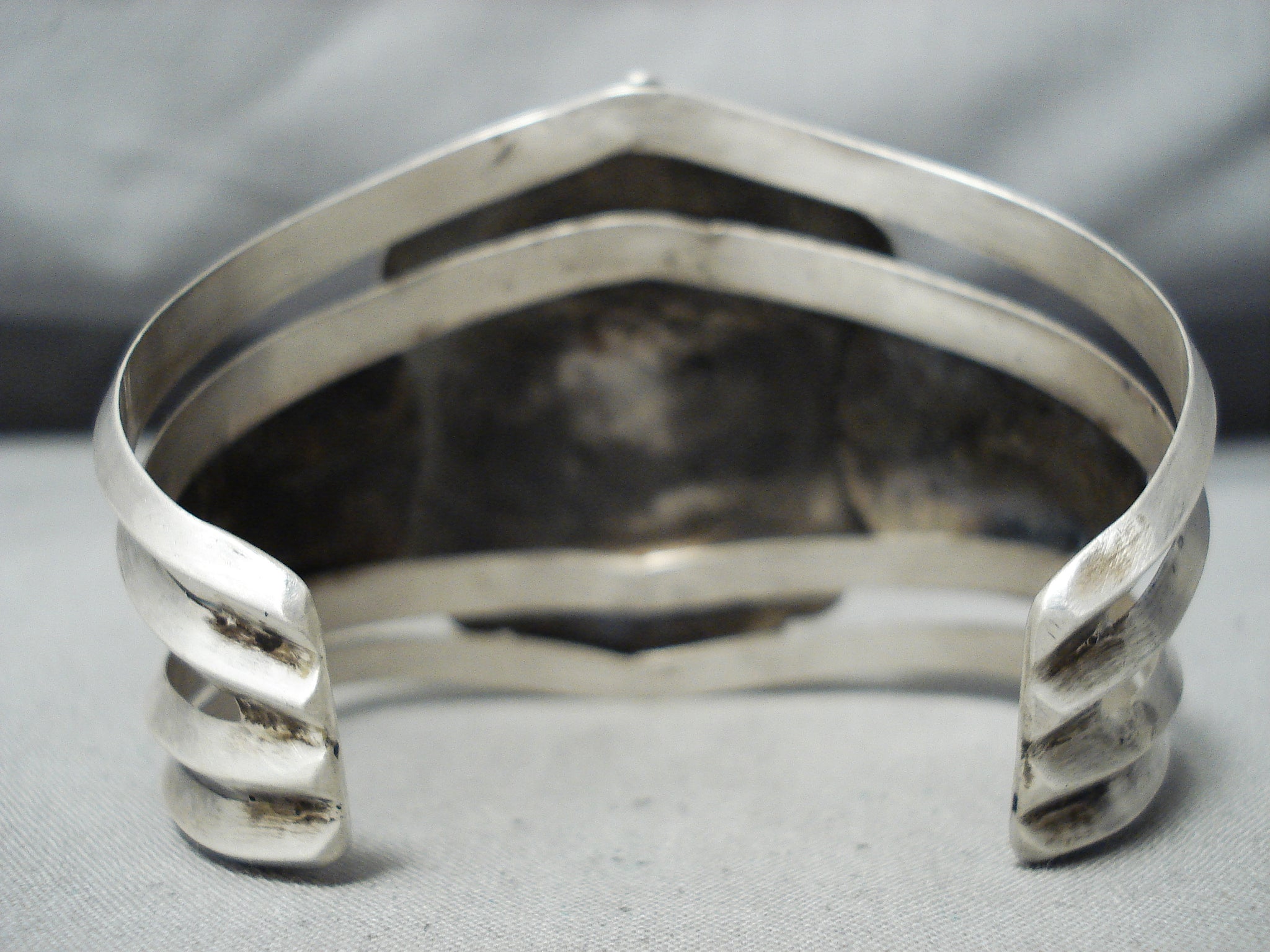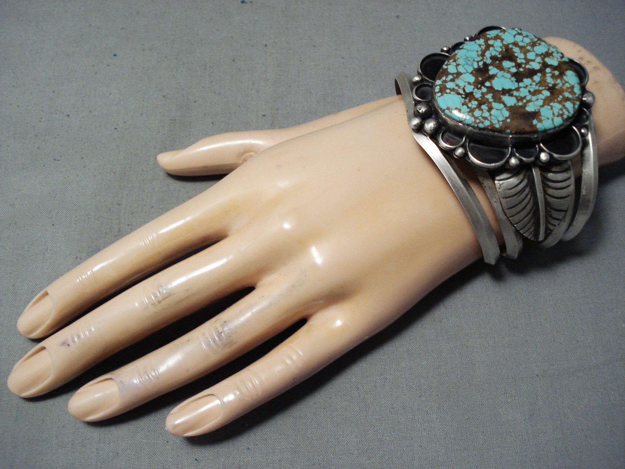 This is a magnificent vintage Navajo large single stone silver bracelet. This bracelet contains a wonderfully huge Number 8 turquoise stone. Surrounding the stone are impeccable silver works that consist of wave patterns and raindrops. Situated at the sides of the quadruple shank silver cuff are amazing silver hand carved leaves. The center stone measures around 1-3/4" x 1-1/2". The width of the bracelet measures around 2-1/4". Sterling silver. Cir. Mid century . The inside end to end measures around 5-3/4" with an additional 1-1/2" gap. Sturdy 91 grams.