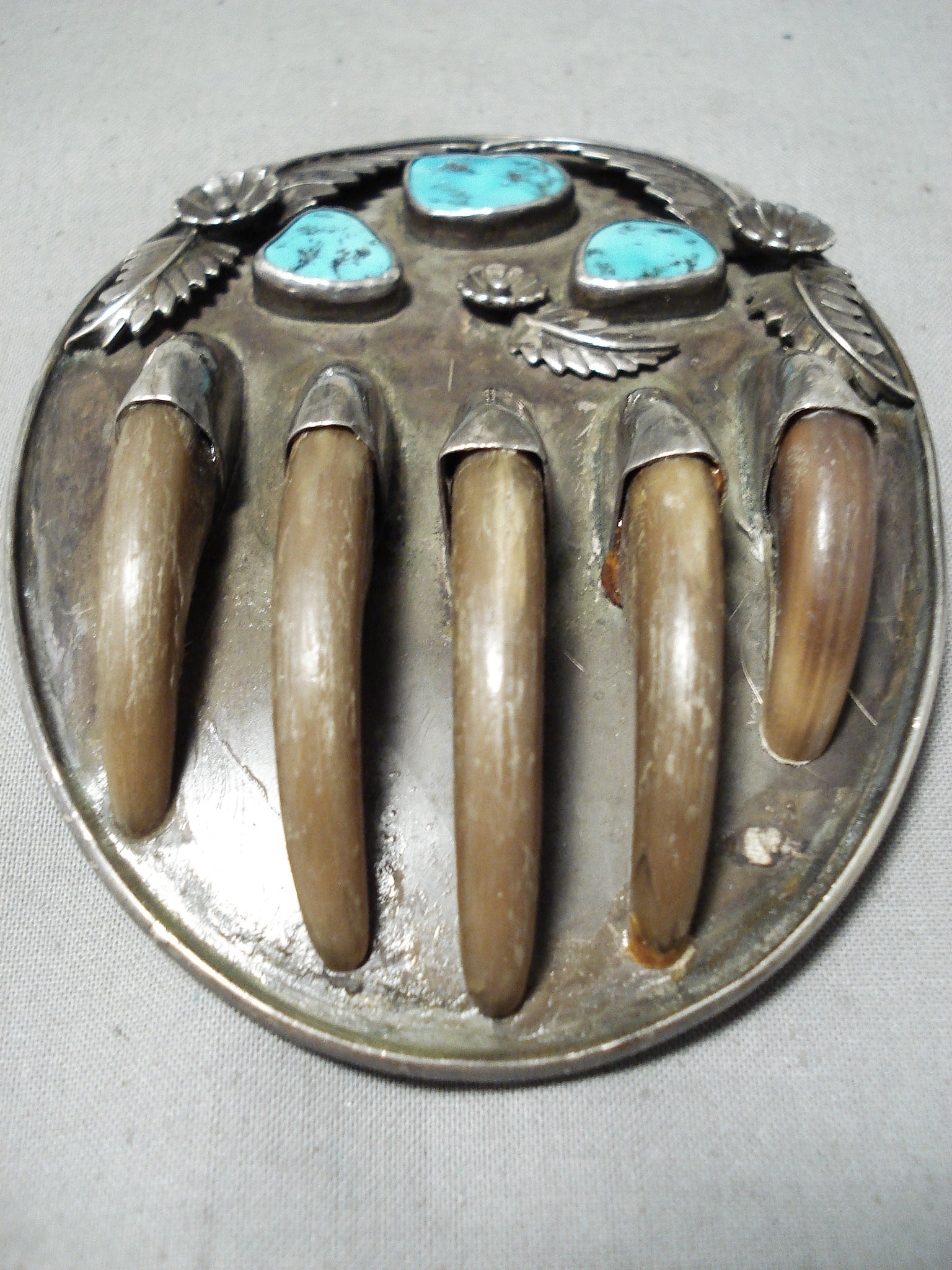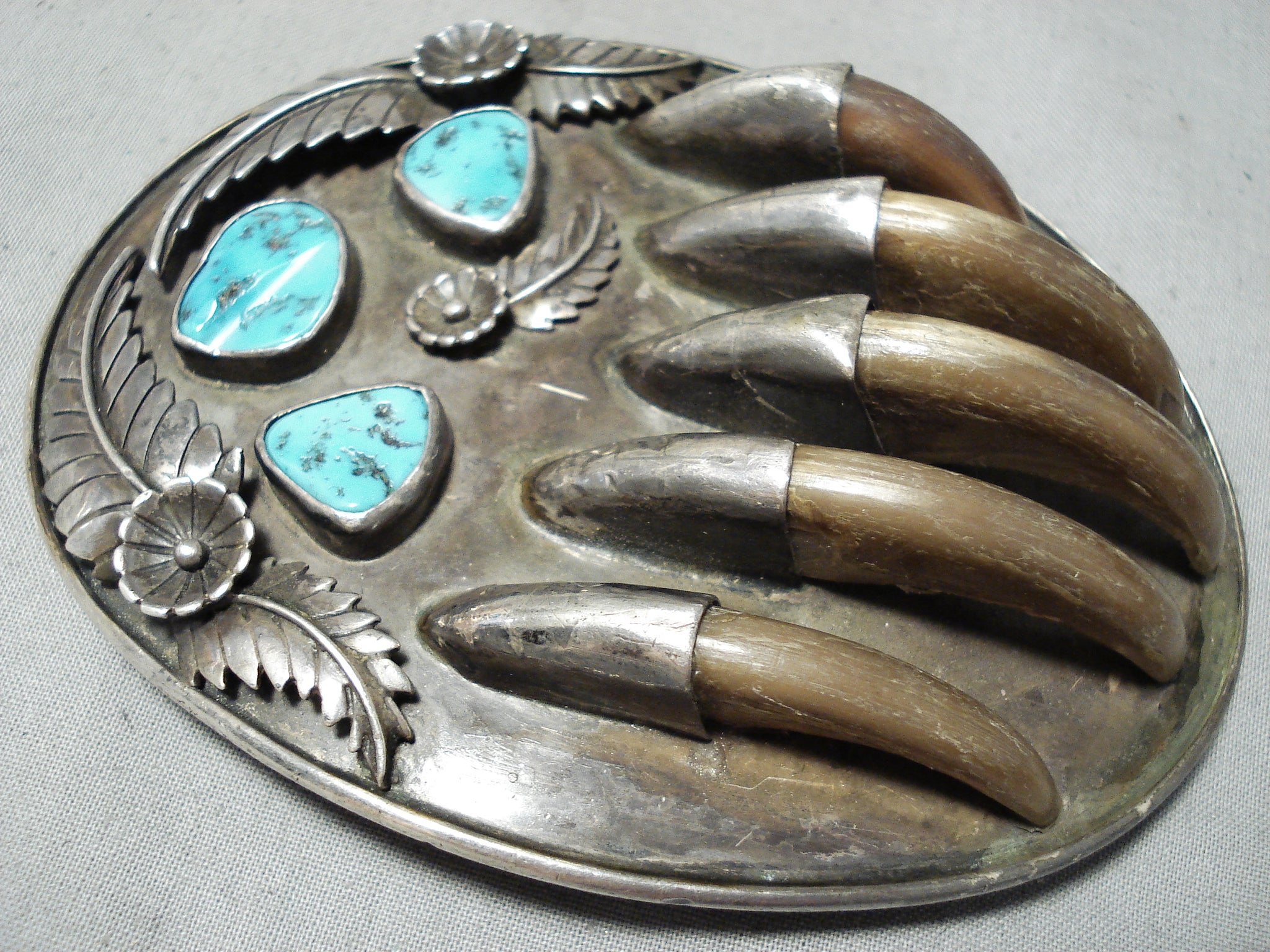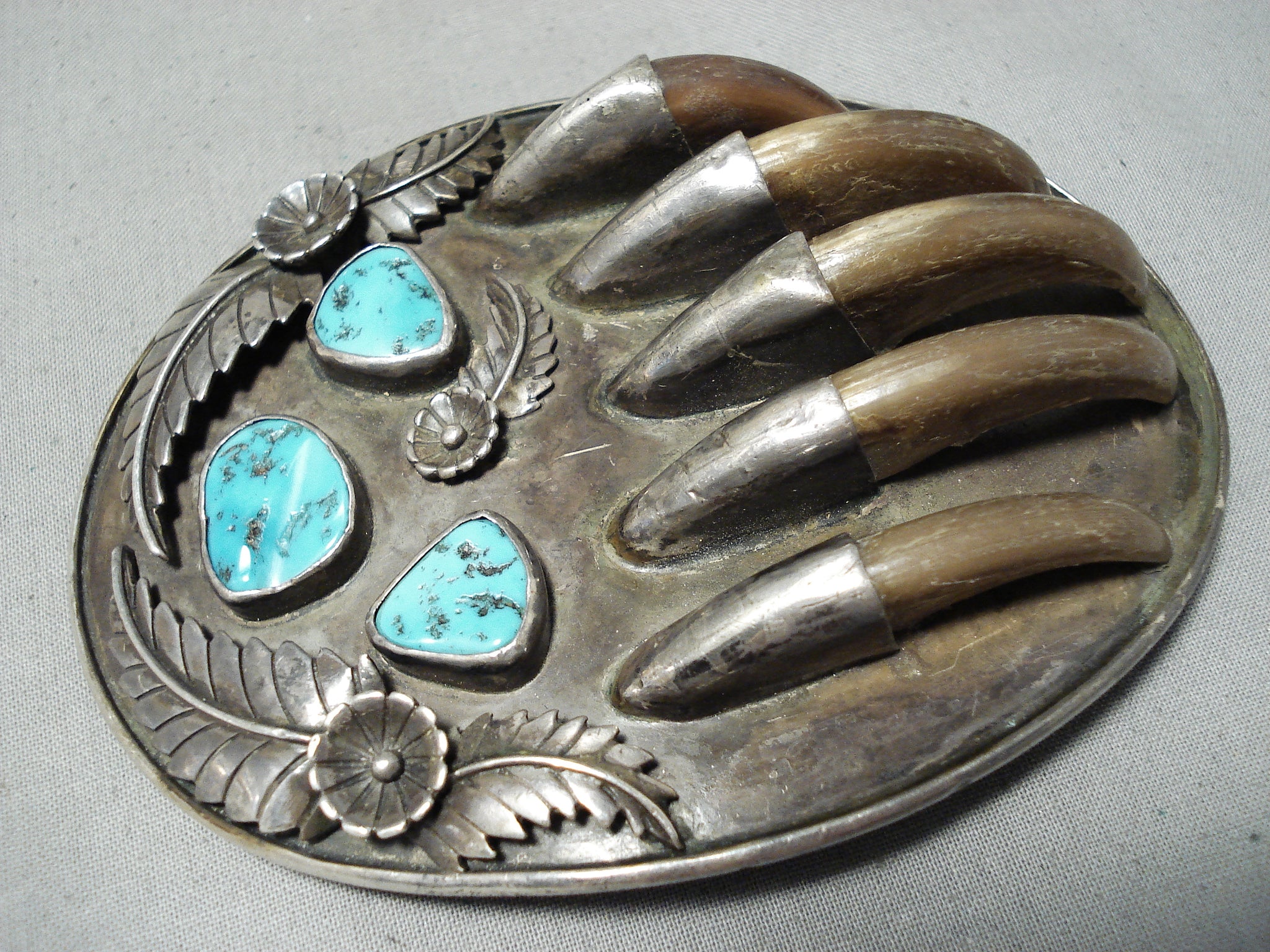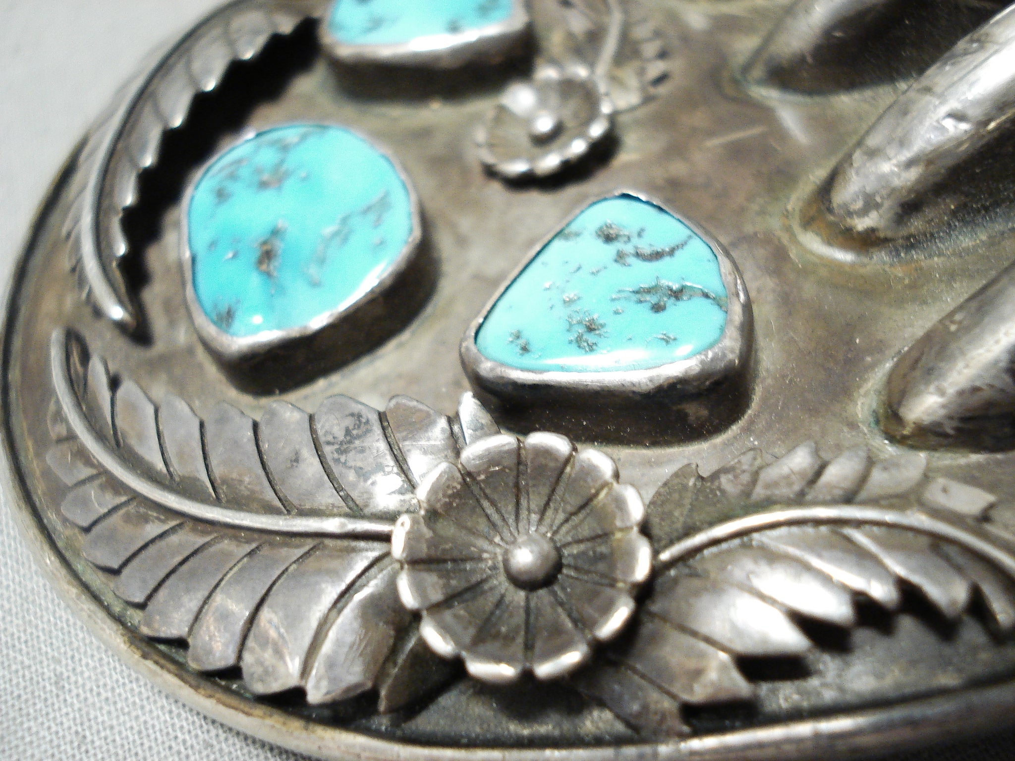 This is a tremendous vintage Navajo turquoise silver buckle being one of the biggest and best buckles we have collected. This buckle contains three large old Sleeping Beauty turquoise stones. Situated throughout the stones are impeccable graduating hand carved 3D silver leaves with accenting silver flowers. The buckle measures a mind blowing 4-1/8" X 3-1/8" and can fit a belt width of about 1-1/2" or less. The largest stone measures around 5/8" x 1/2". Sterling silver. Cir. Mid century . Sturdy 115 grams.