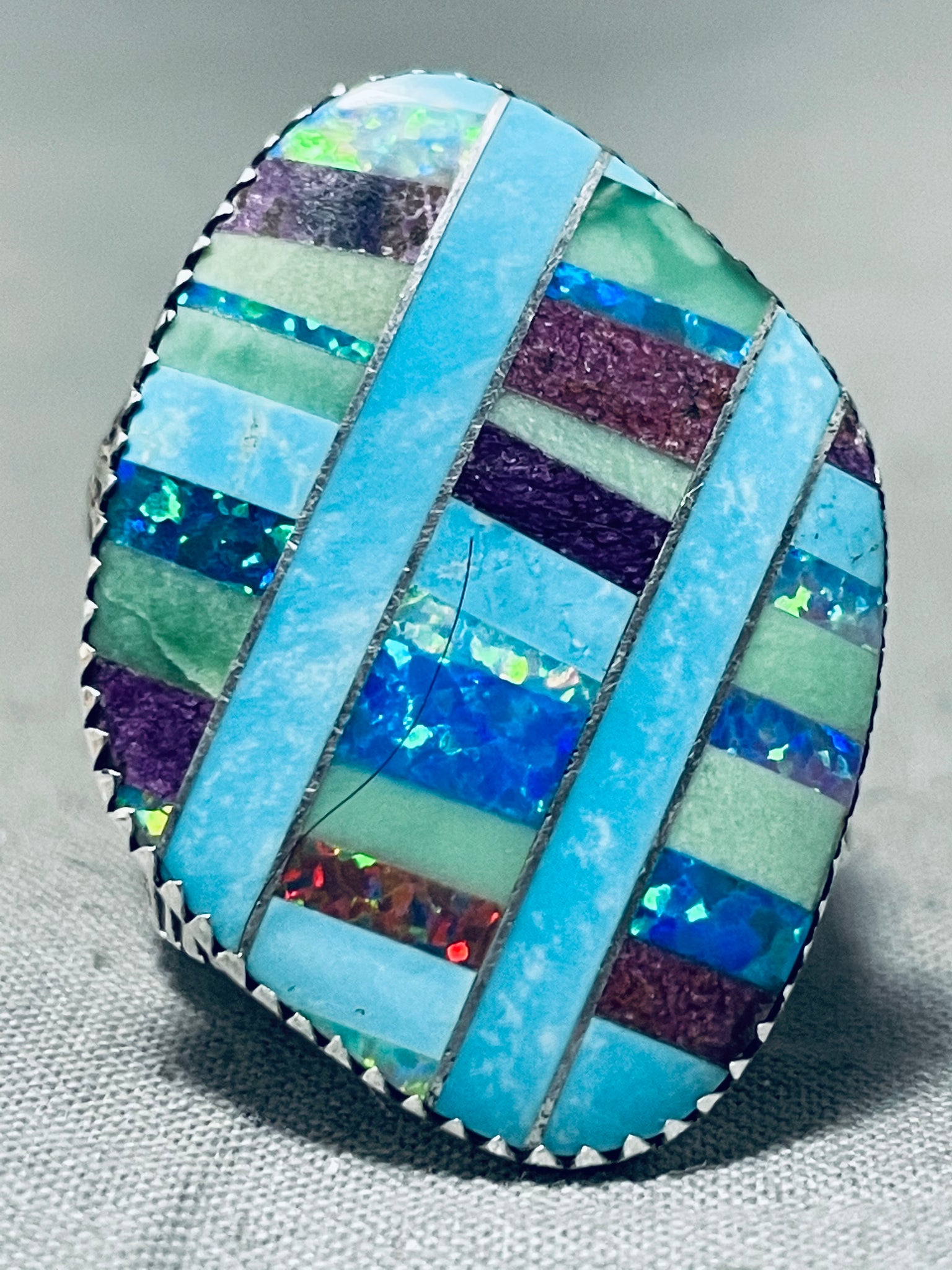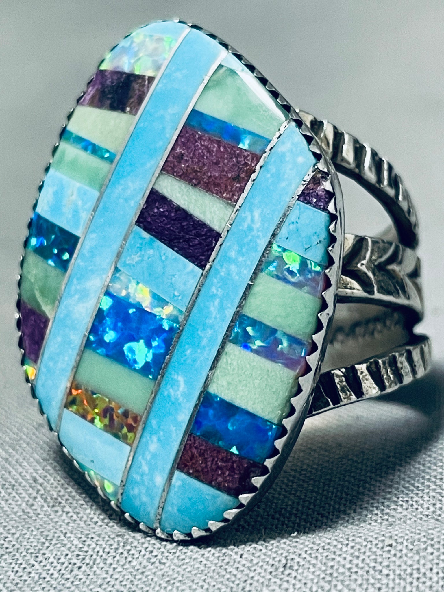 Huge Intricate Native American Turquoise Sterling Silver Inlay Ring