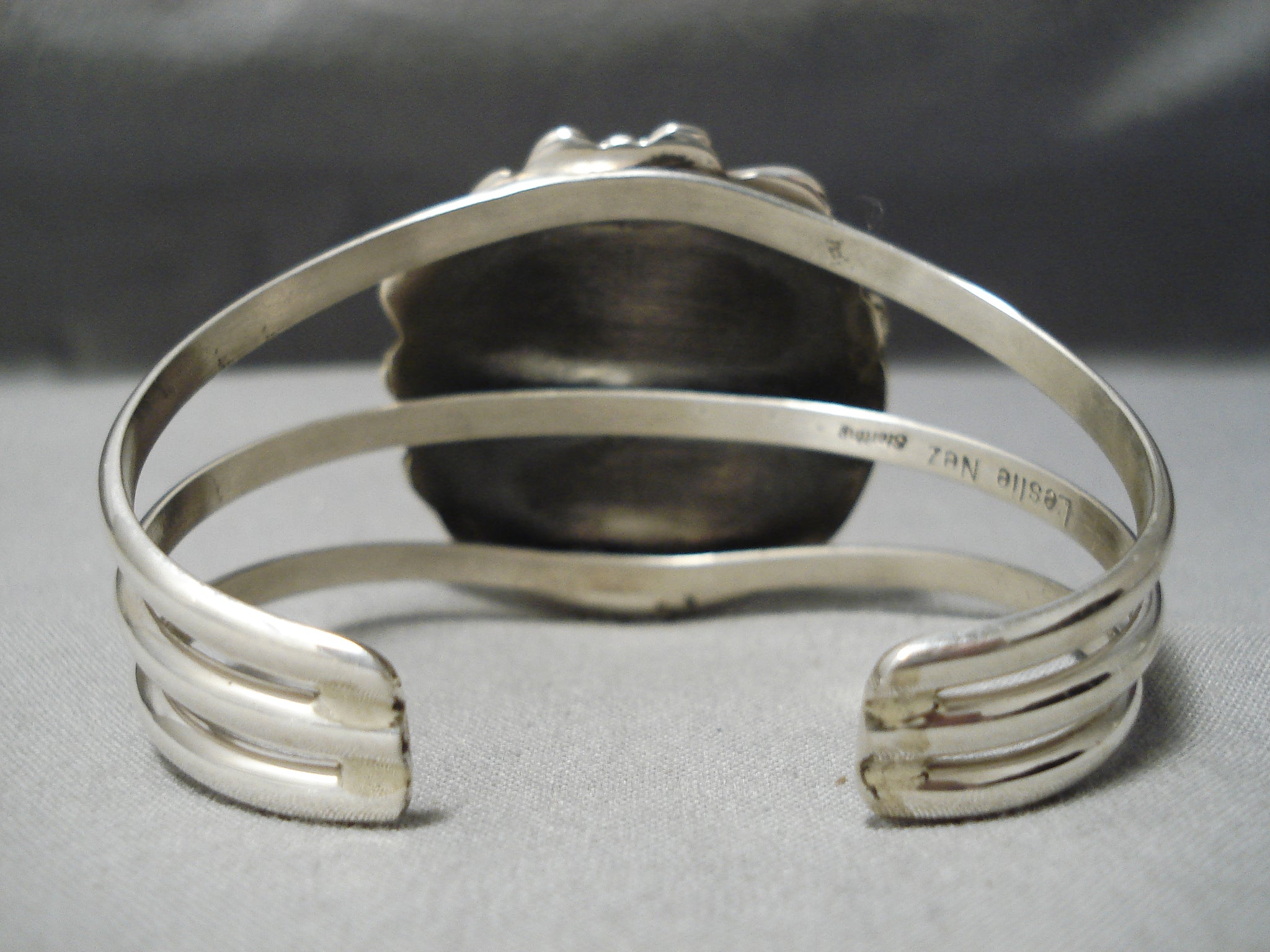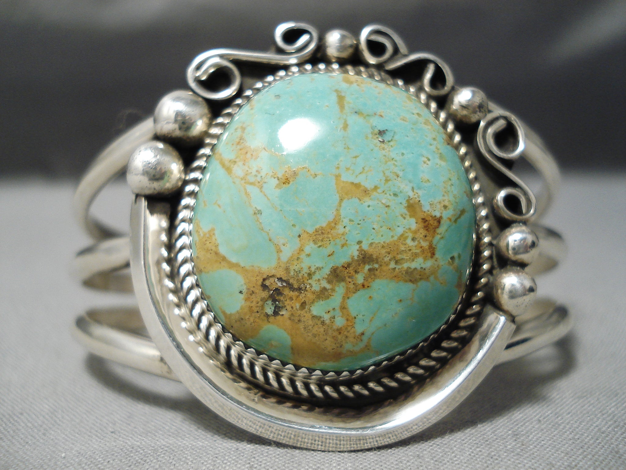An incredible Navajo silver bracelet. This huge, dramatic Royston turquoise stone is surrounded with silver rope as it’s then placed upon its silver platform with a partial beveled border, silver swirls and beads! The center stone measures around 1-1/8" x 1". The width of the bracelet measures around 1-5/8". Signed by Navajo artist, Leslie Nez. Sterling silver. The inside end to end measures around 5-3/4" with an additional 7/8" gap. Sturdy 50 grams.