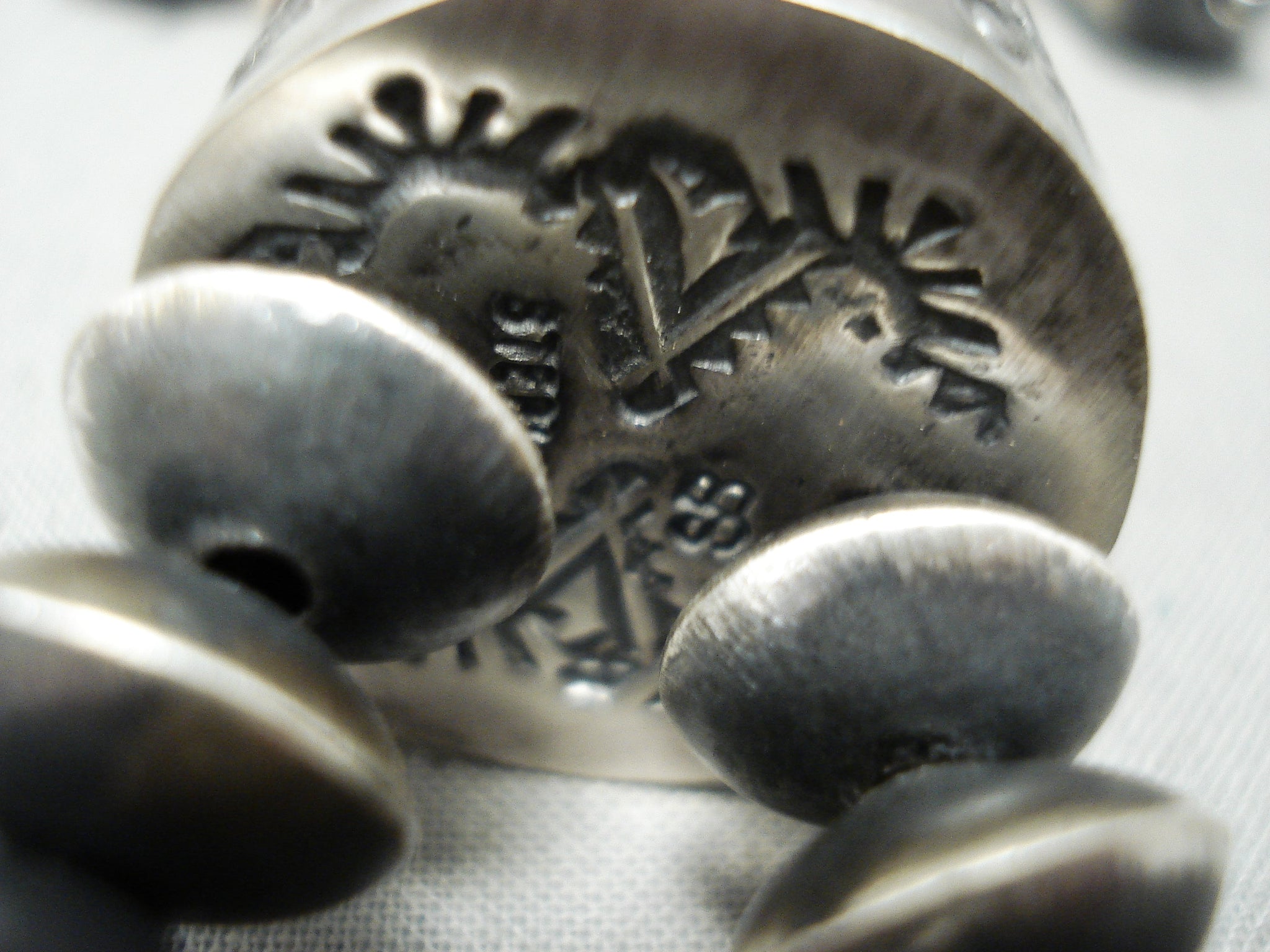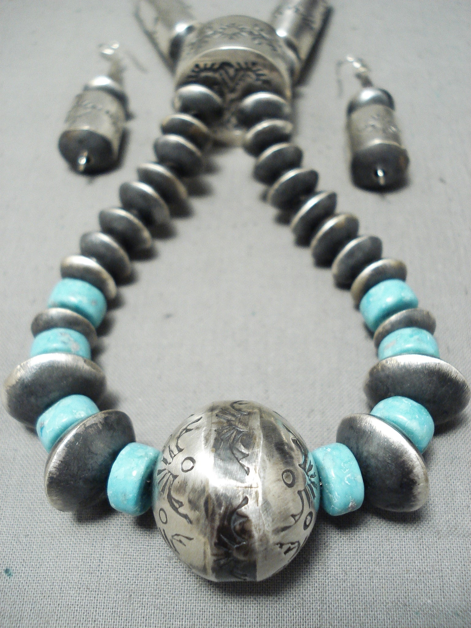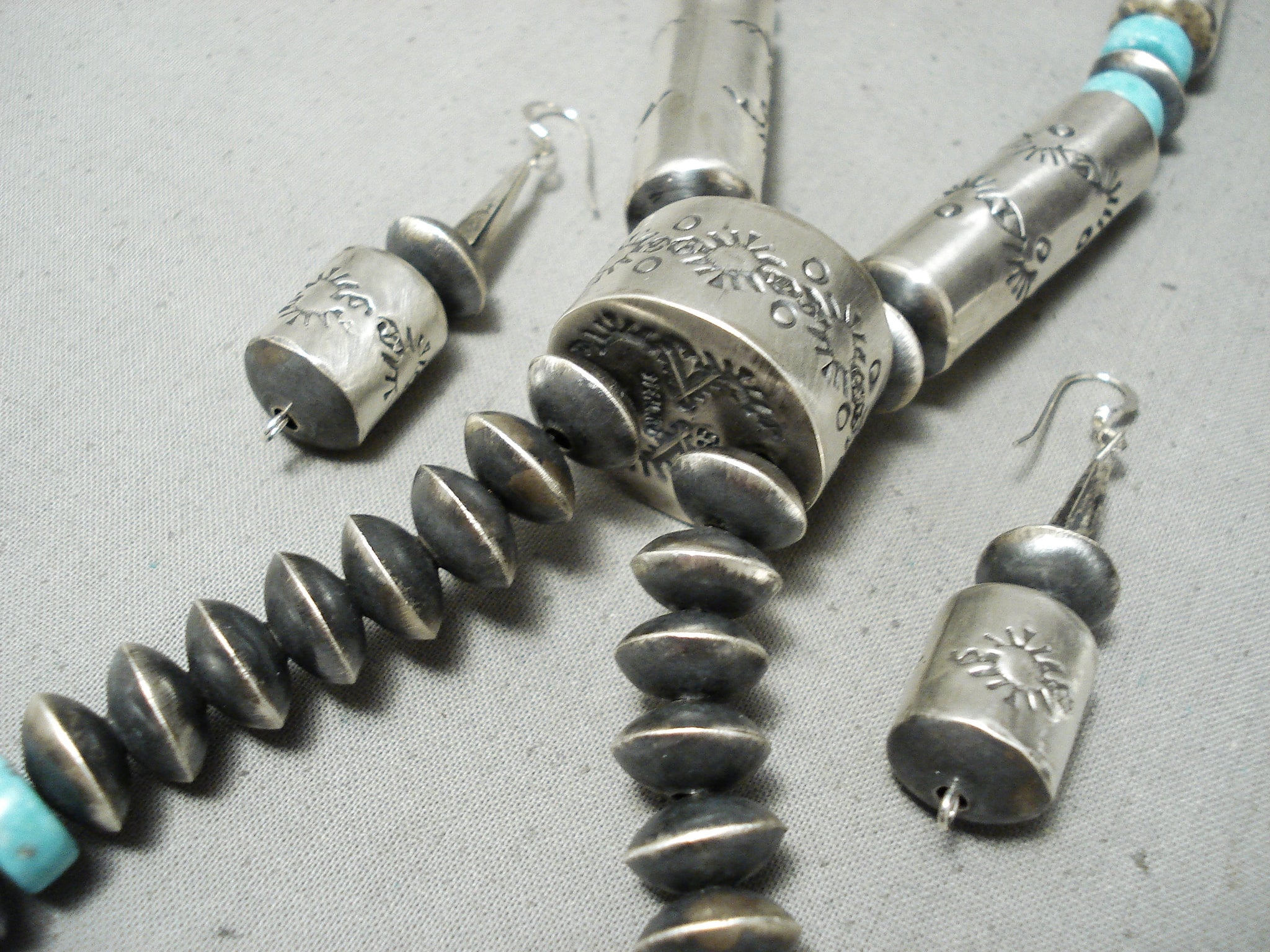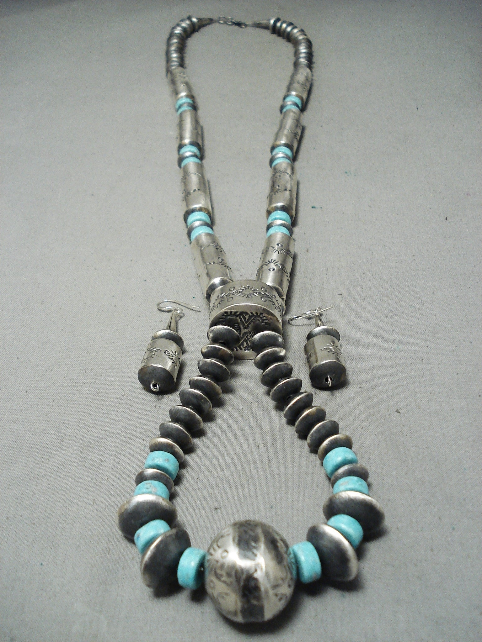 This is a museum quality vintage Navajo turquoise and silver very long necklace. This necklace is very unique as it contains 8 amazing and large hand wrought tubule shaped silver beads that each measure around 1-1/2" X 1/2". Each of the large beads consist of beautiful sun patterns. Situated throughout the larger beads are smaller but still fairly big round silver beads with accenting thick disc shaped Number 8 turquoise stones. Each stone measures around 3/8" in diameter. Seperating the necklace from the naja matching jacla is a huge thick silver bead that measures a whopping 7/8" in diameter and 1/2" thick. This necklace is signed which it is very rare to find necklaces that are signed. What I love even more about this necklace is that it comes with a beautiful matching pair of silver earrings that each measure around 1-1/2" X 1/2". Sterling silver, marked. Cir. 1970's+. Signed by Navajo artist, Sophia Becenti . The length of the necklace measures around 36". Sturdy 151 grams.