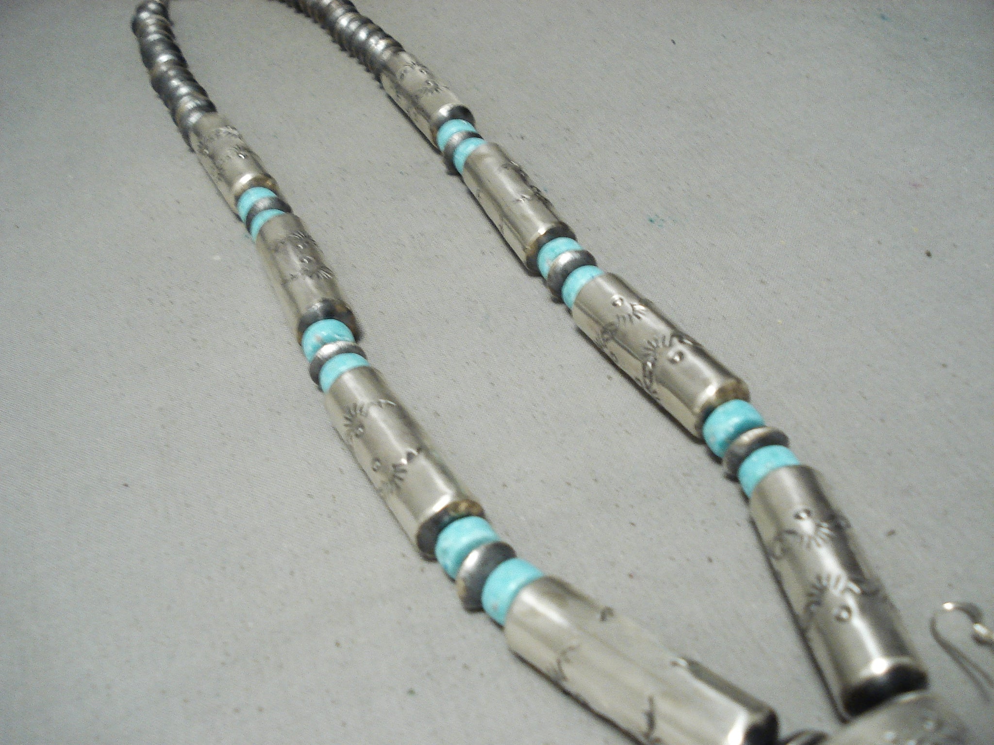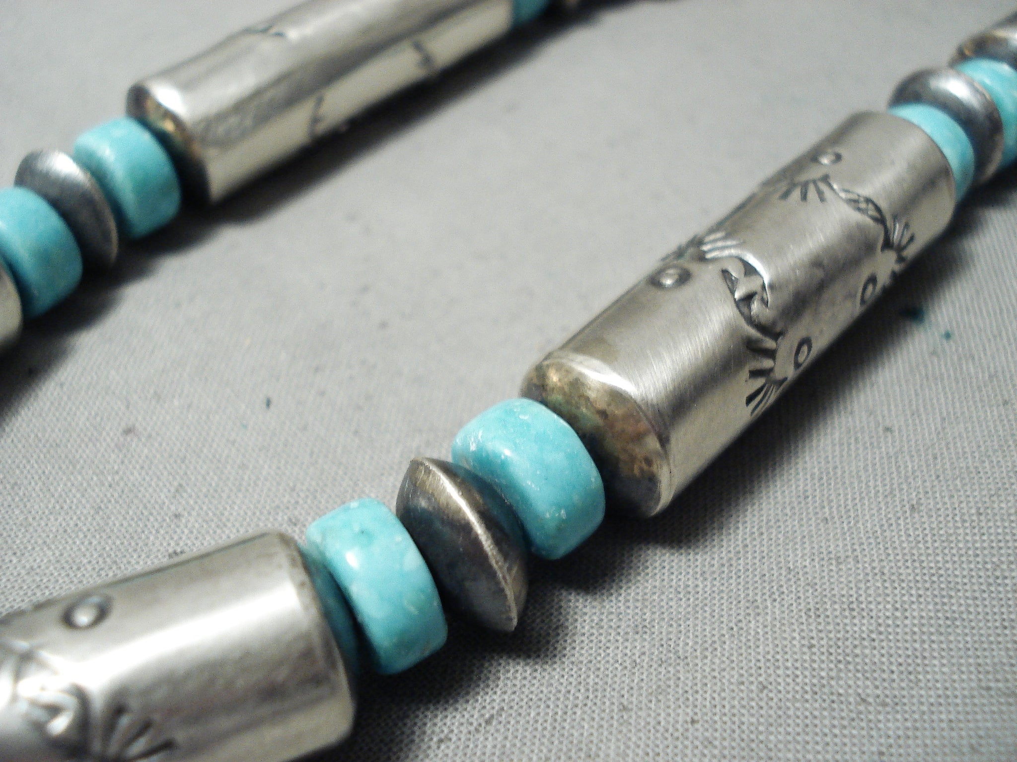 Huge Longer Hand Tooled Native American Navajo Turquoise Sterling Silver Tubule Necklace