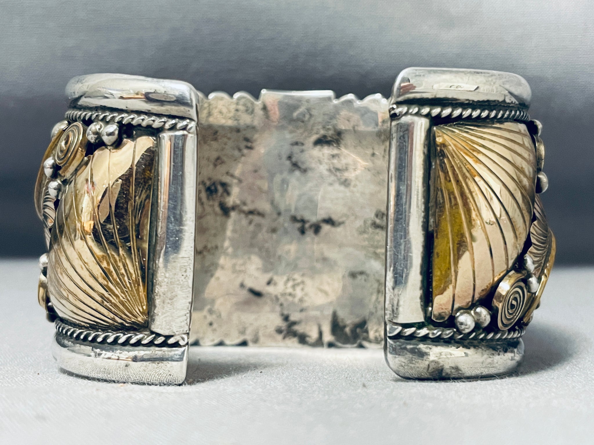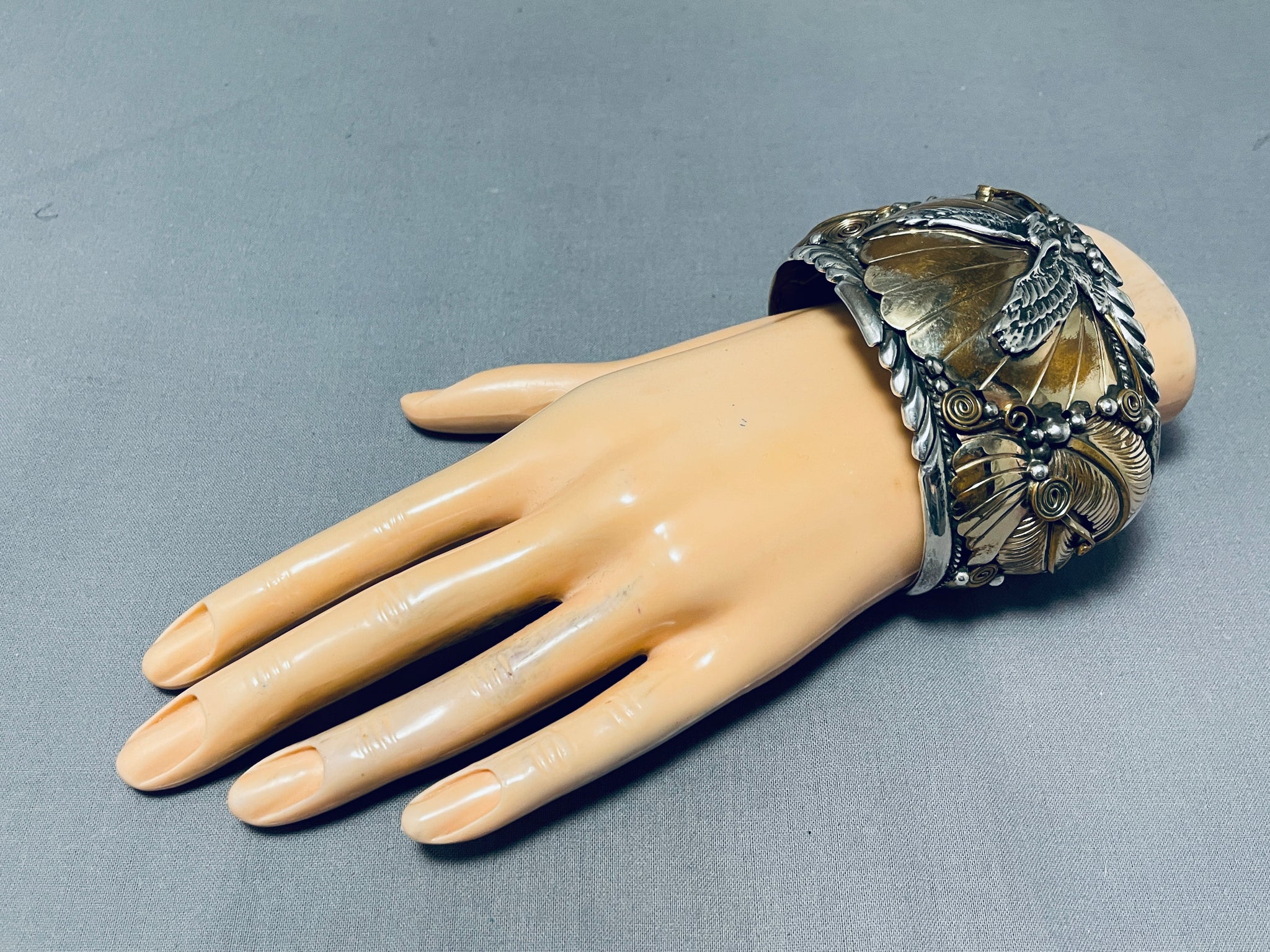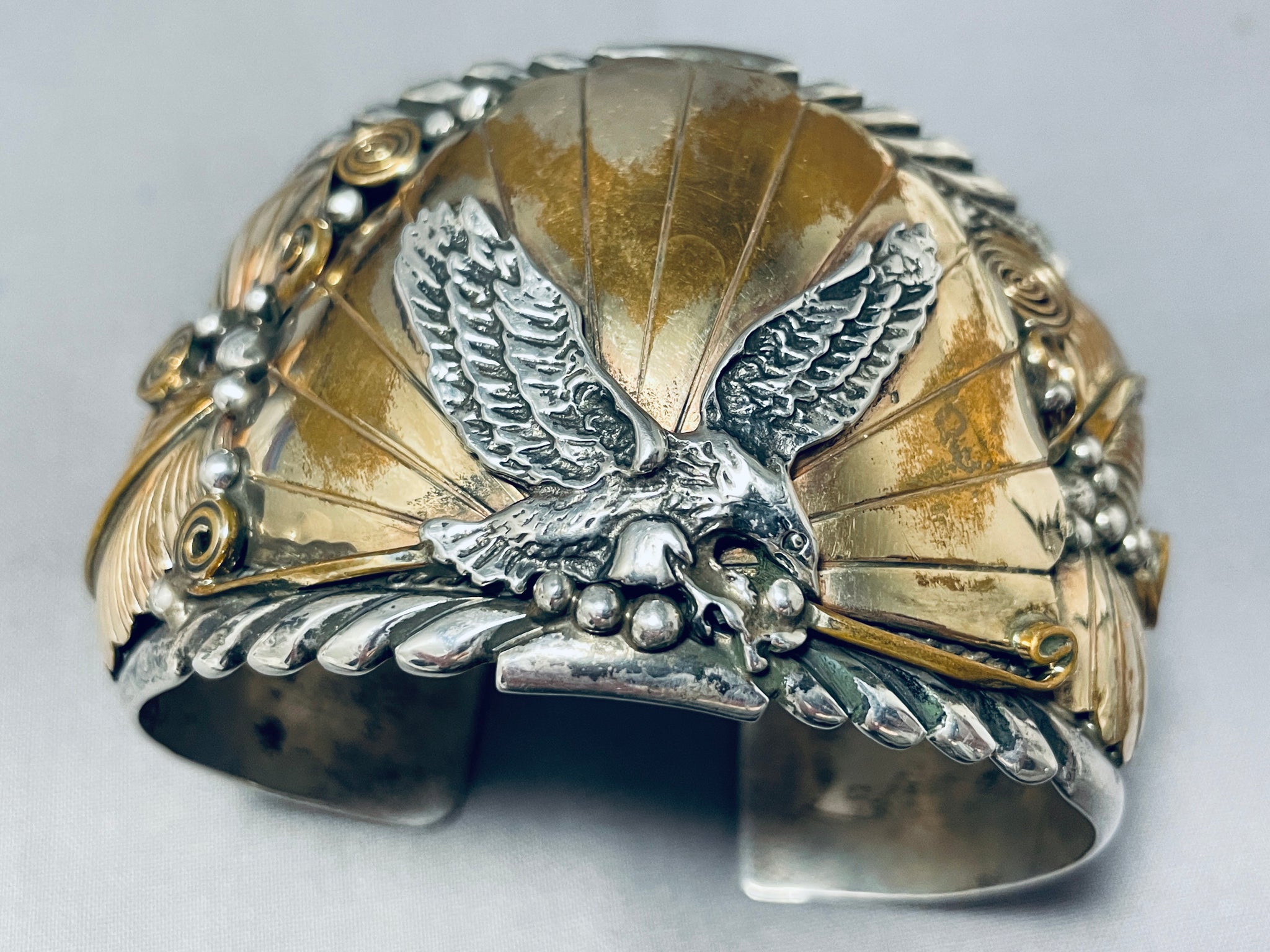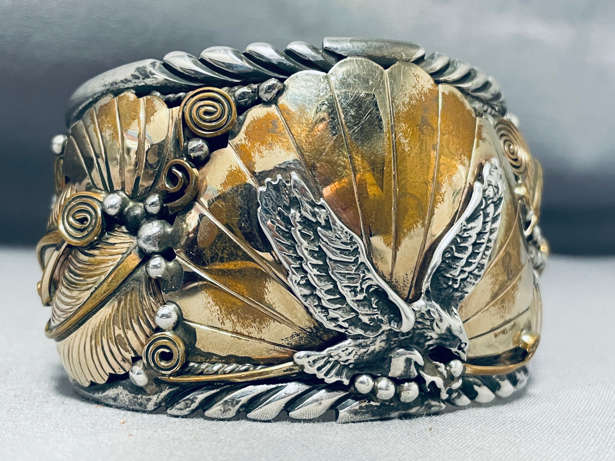 Huge Mens Native American Navajo Signed Sterling Silver Eagle Gold Fill Huge Bracelet