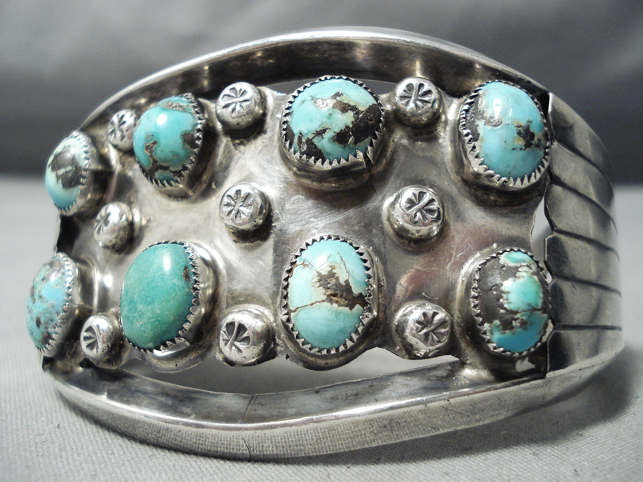 This is a tremendous vintage Navajo two row turquoise silver bracelet. This amazing piece contains 8 old Bisbee turquoise stones that rest in two incredible rows. Situated throughout the stones are superior large silver raindrops. This bracelet contains a heavy and thick double silver shank cuff. Resting at the ends are phenomenal large sun bursting silver flanks. The stones measure around 3/8" x 1/4". The width of the bracelet measures around 1-7/8". Sterling silver. Cir. Mid century . The inside end to end measures around 5-3/4" with an additional 1-1/2" gap. Sturdy 77 grams.