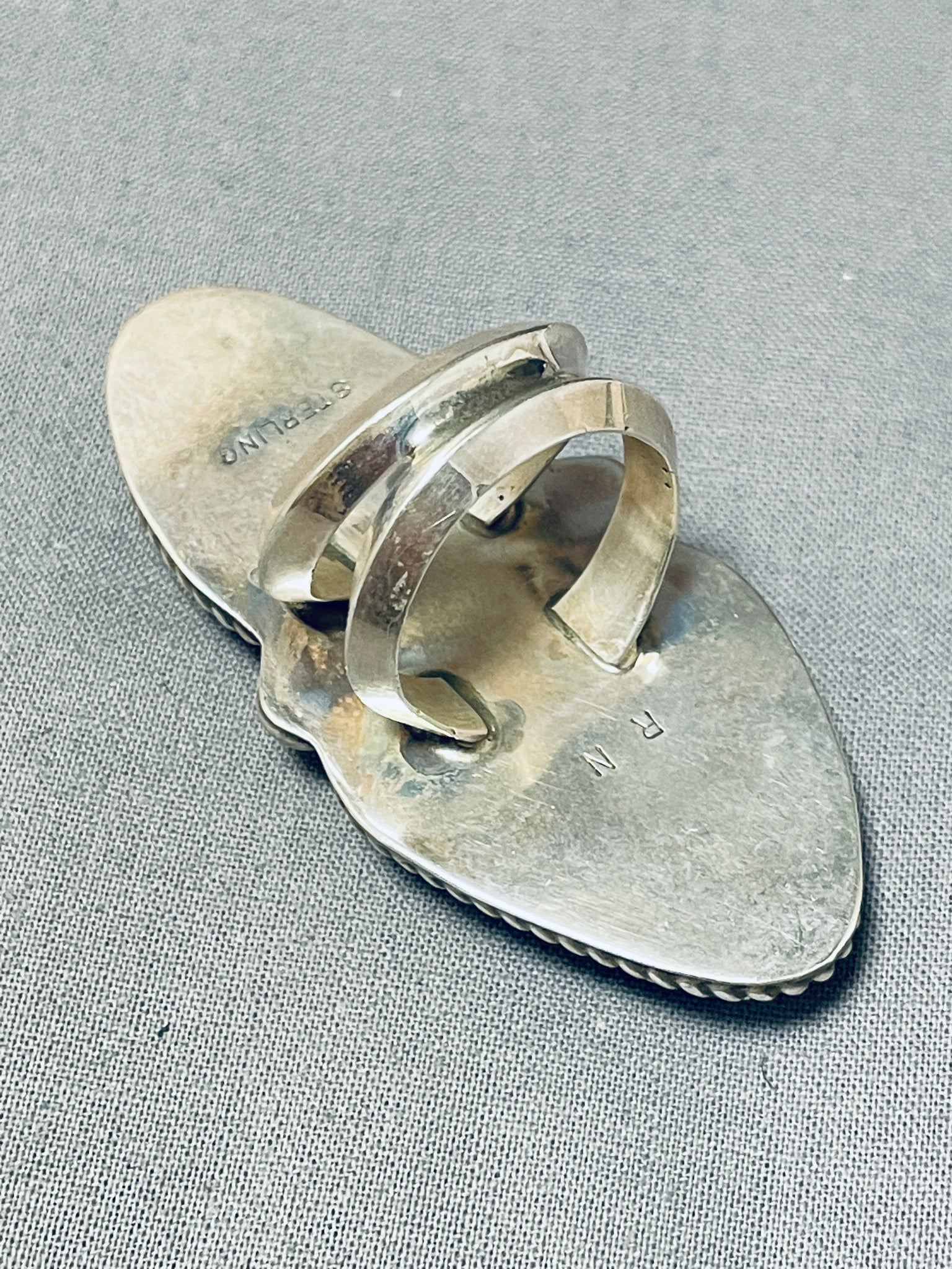 This is a tremendous Navajo very large two stone silver ring. This incredible ring contains two very large Blue Thunder turquoise stones that are hand cut into beautiful fat teardrop shapes. Surrounding the stone are thick silver ropes with two accenting very large silver raindrops. This ring contains one of the largest and thickest double silver shanks we have seen on a ring, so sturdy. The largest stone measures around 1" x 7/8". The ring face measures around 2-3/8" x 1-1/8". Signed by Navajo artist, RN. The ring size is around 8.5. Cir. 1990's+. Sterling silver, marked. Sturdy 31 grams.