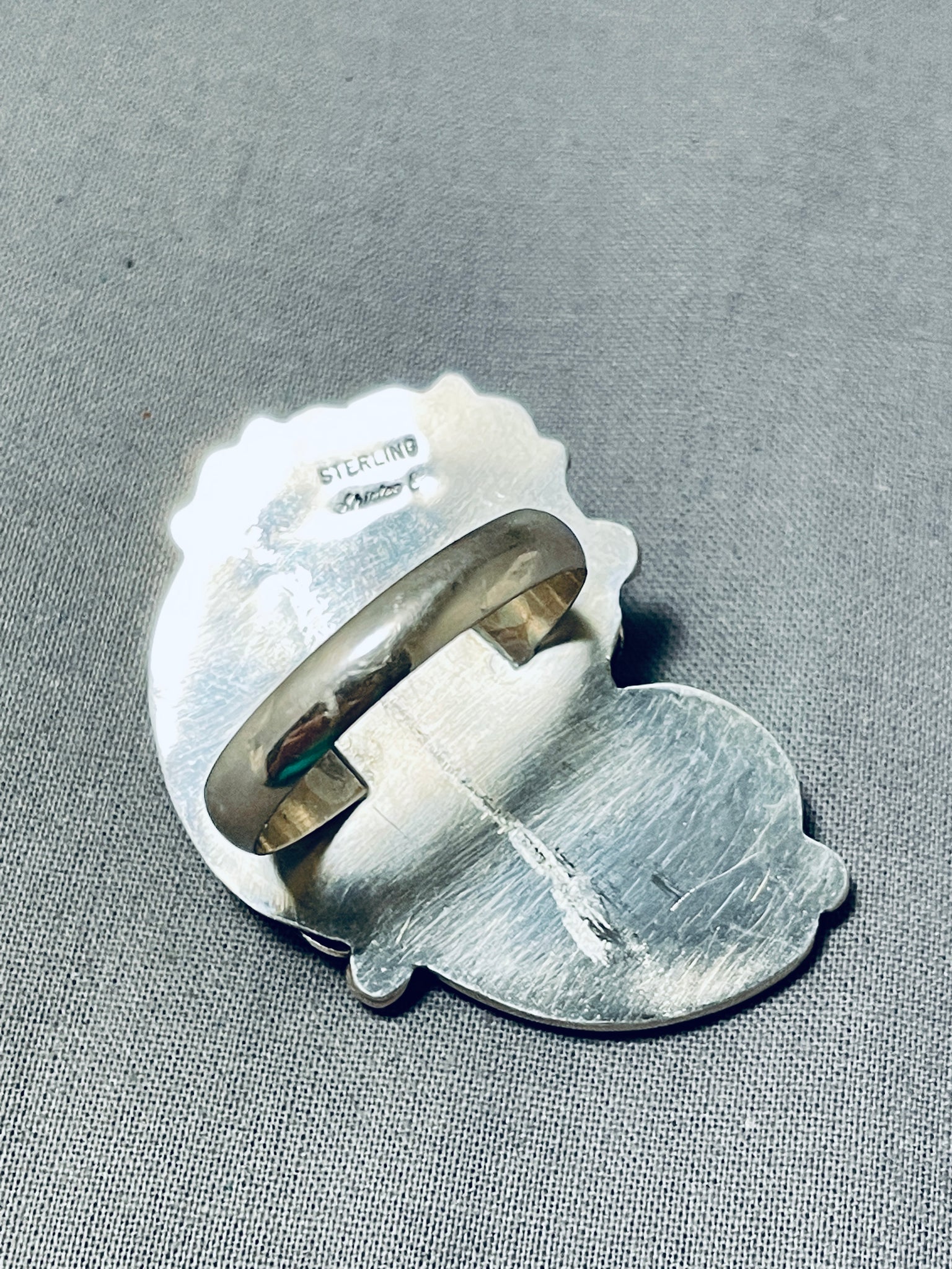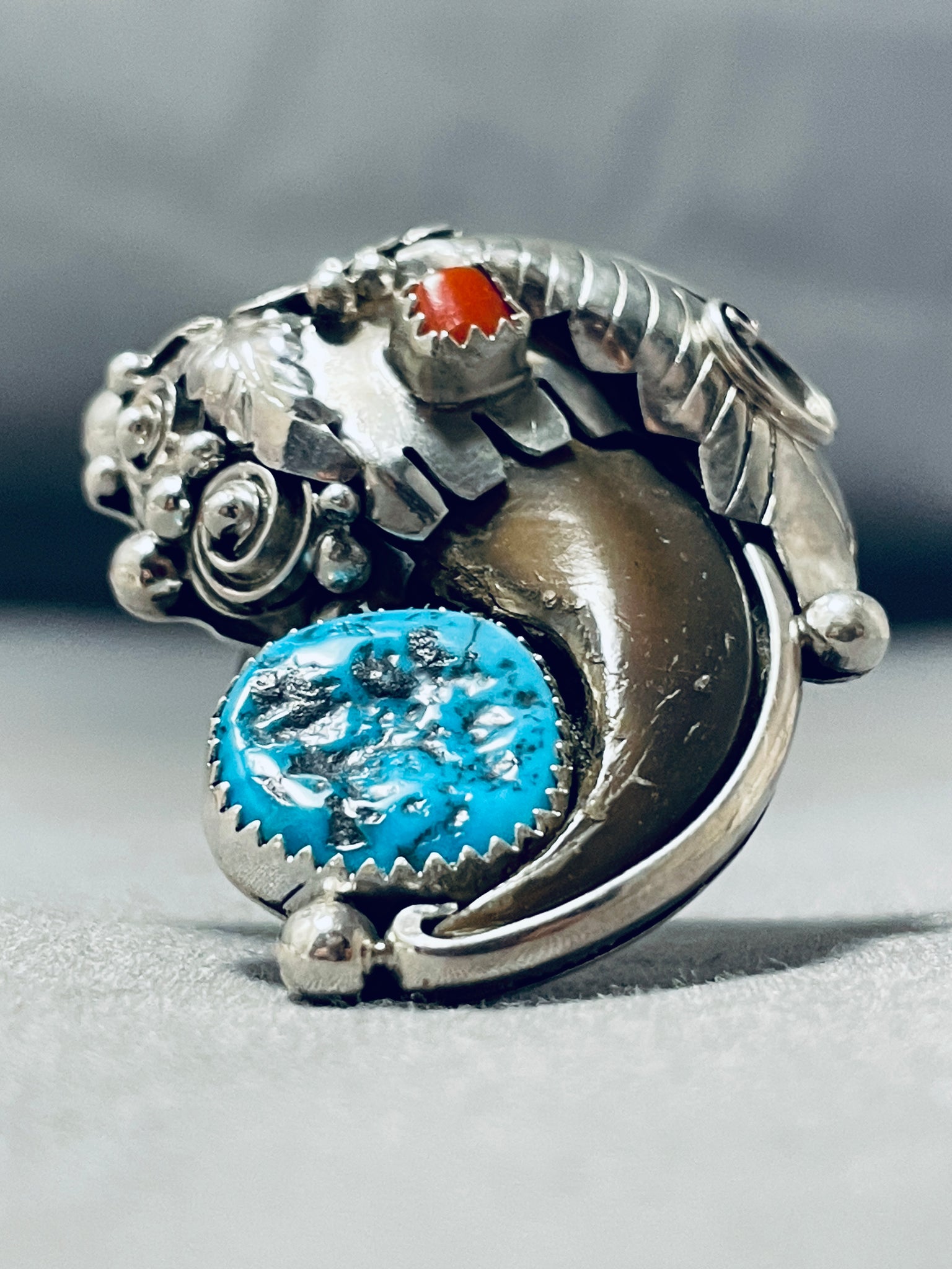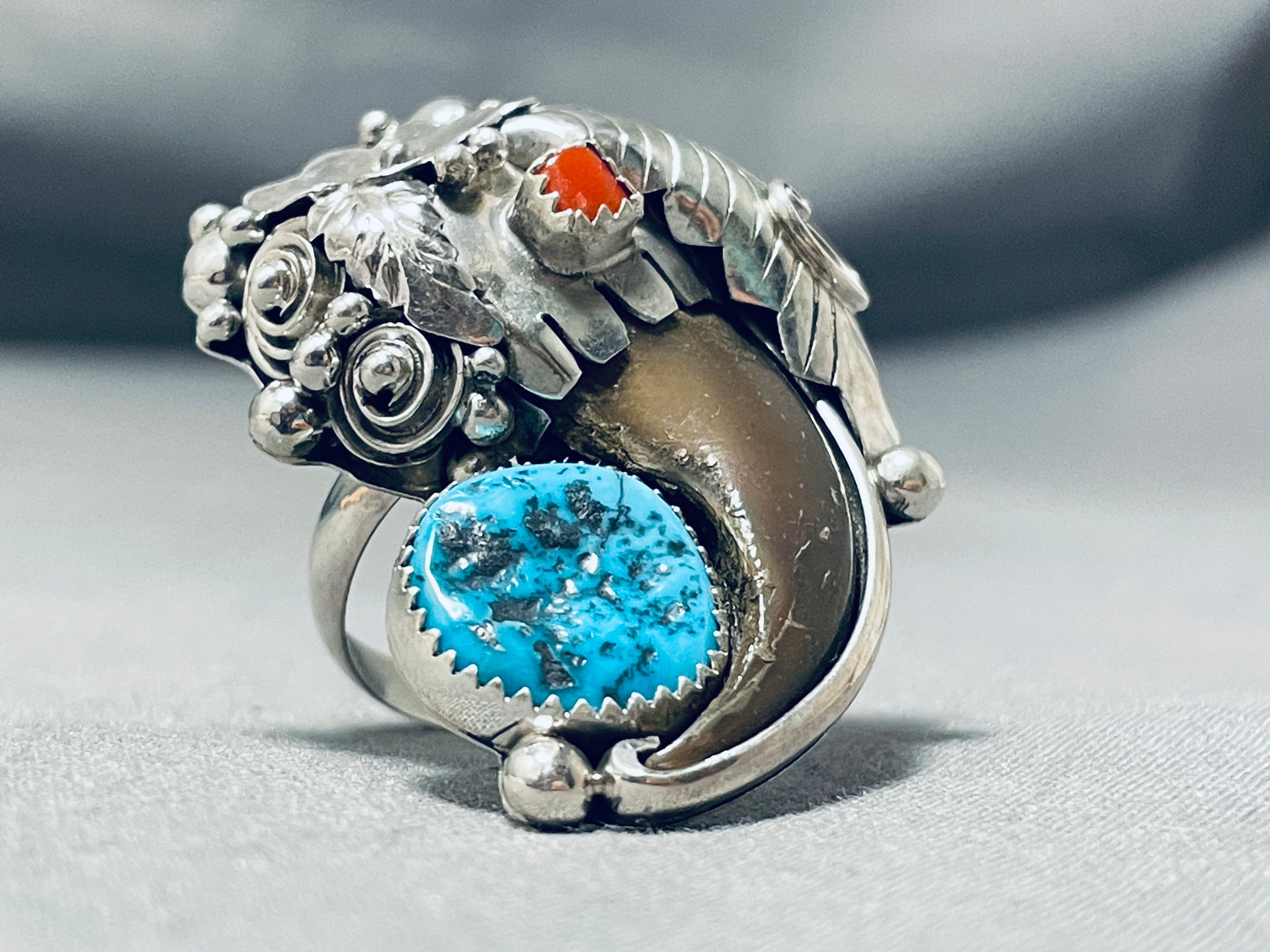 Huge Native American Navajo Turquoise Coral Bear Sterling Silver Ring