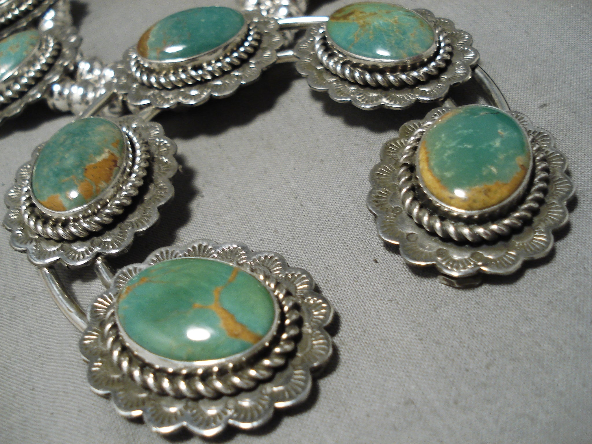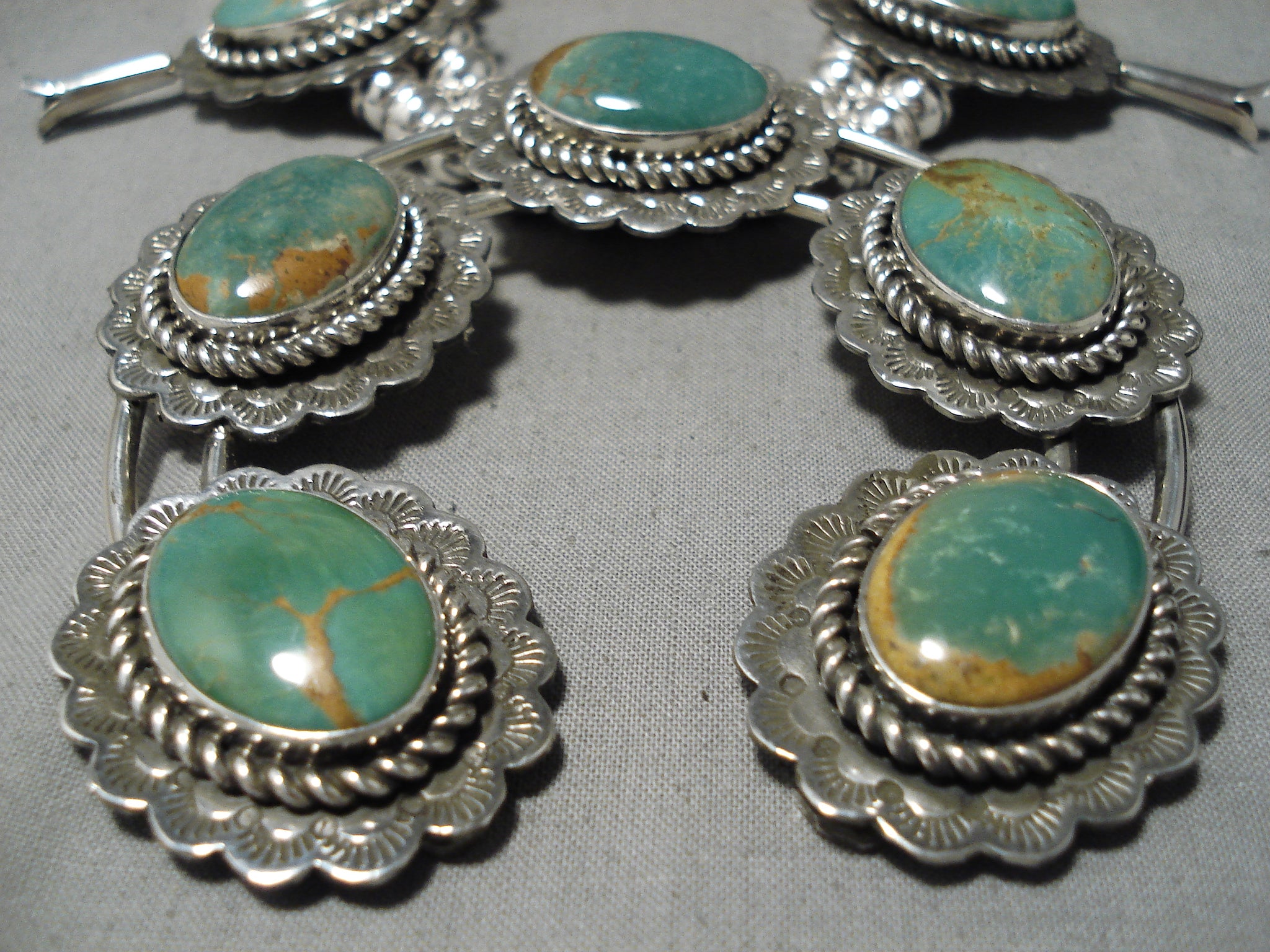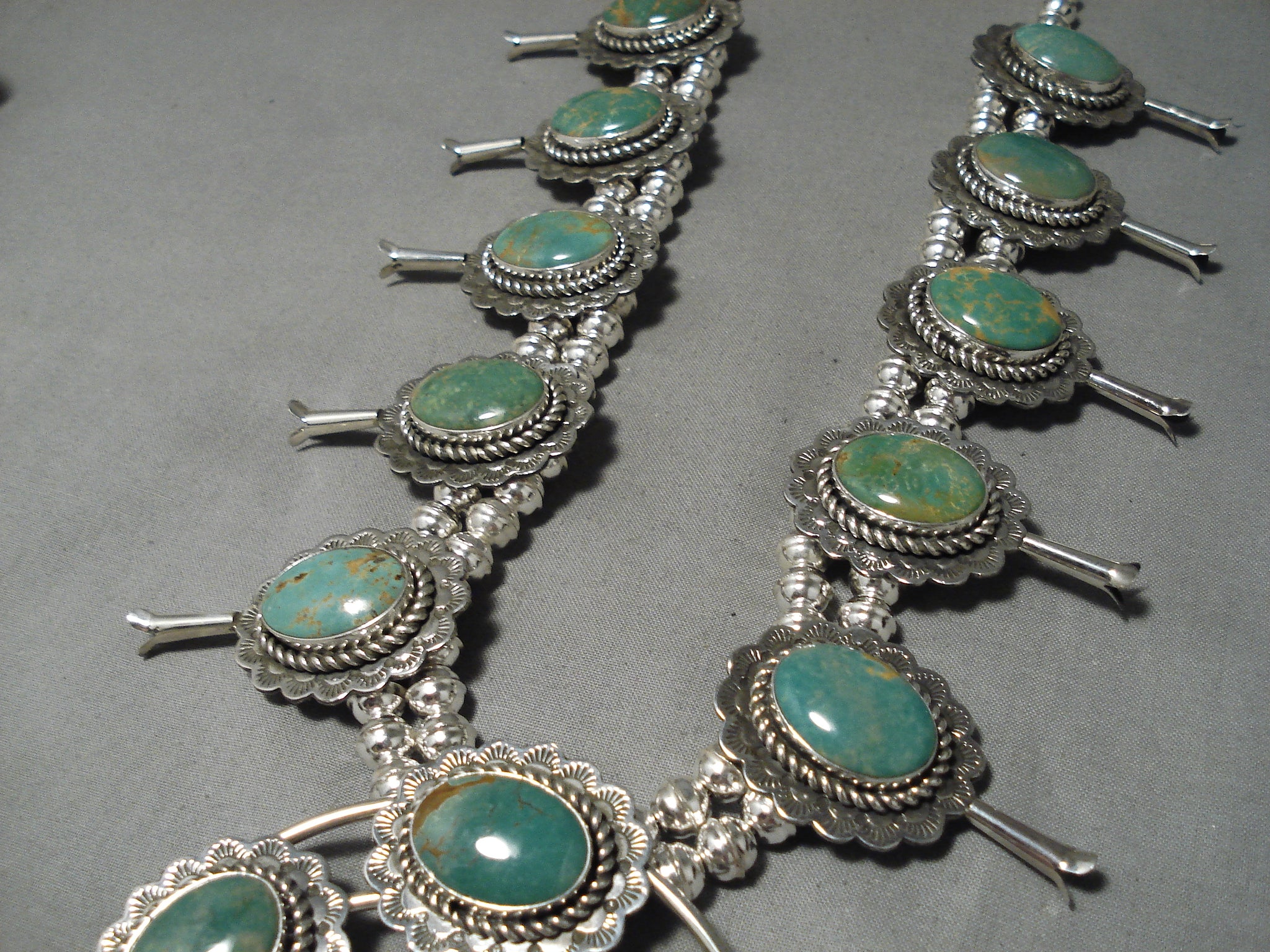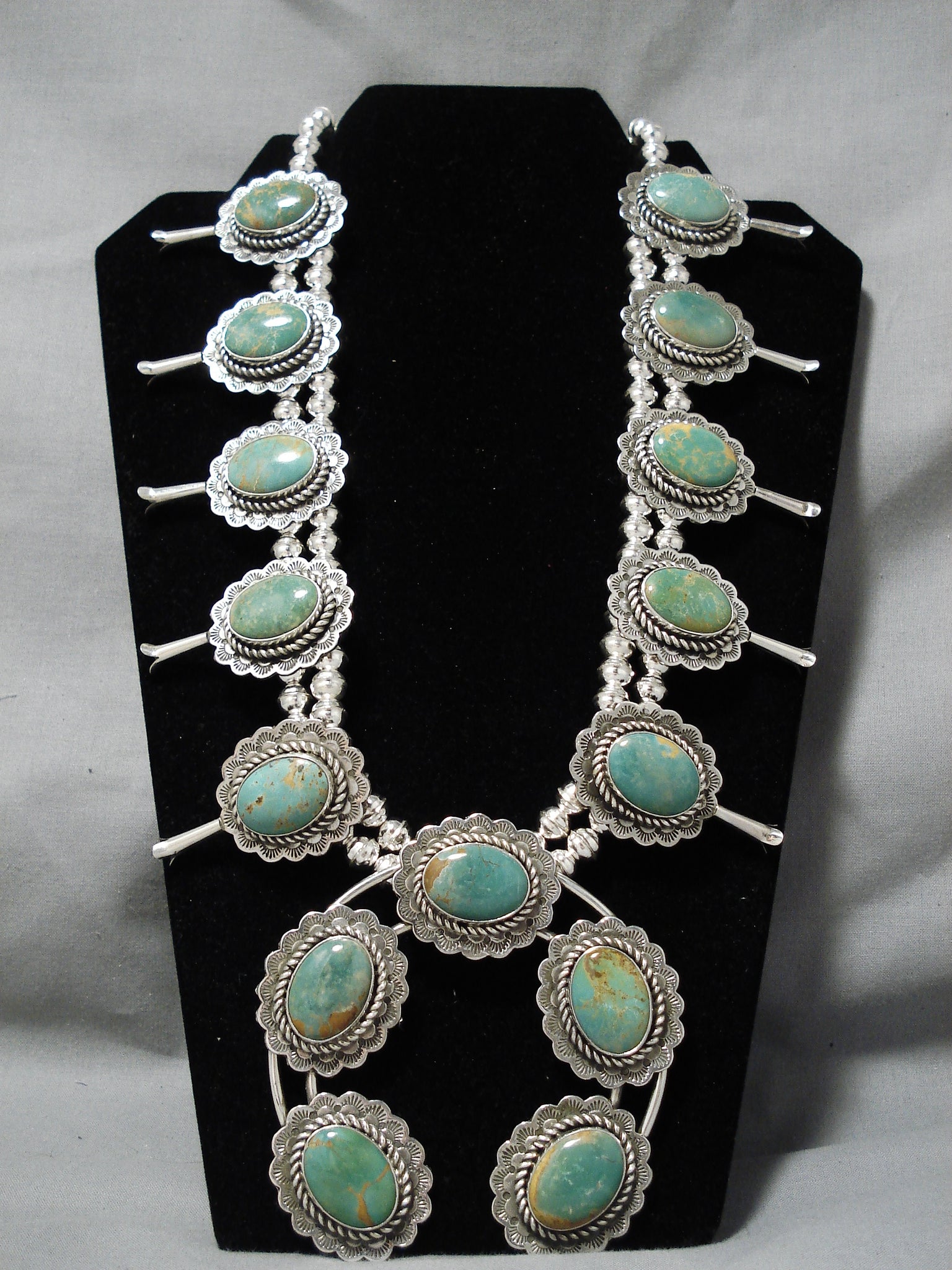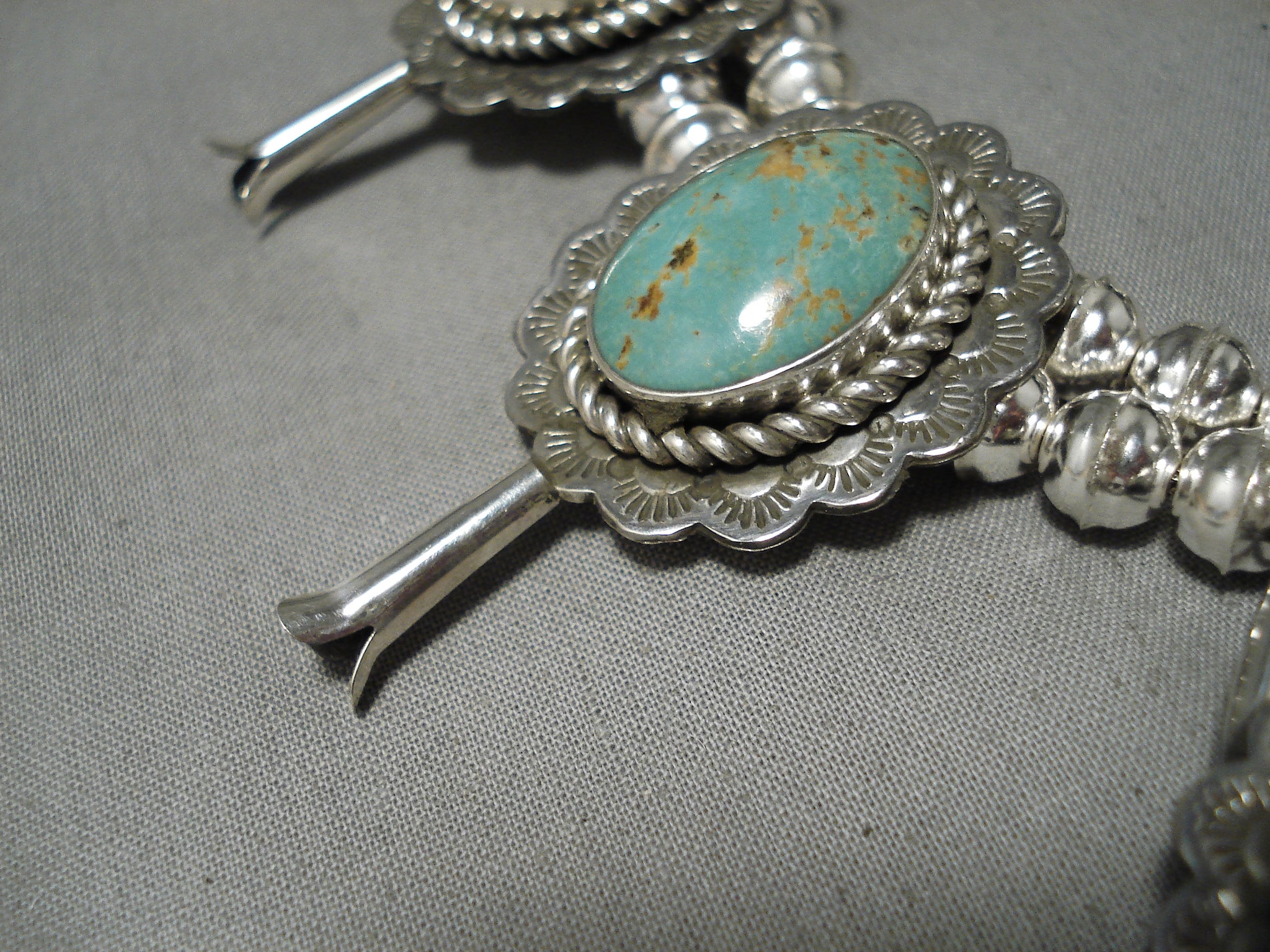 Huge Native American Sterling Silver Royston Turquoise Squash Blossom Necklace